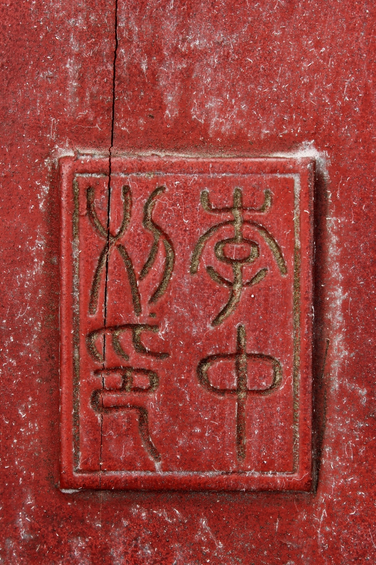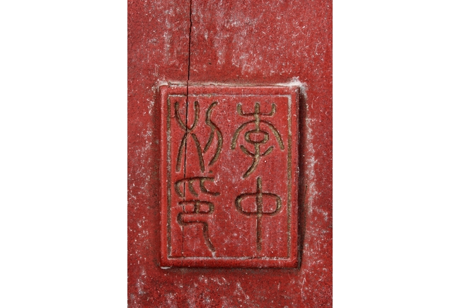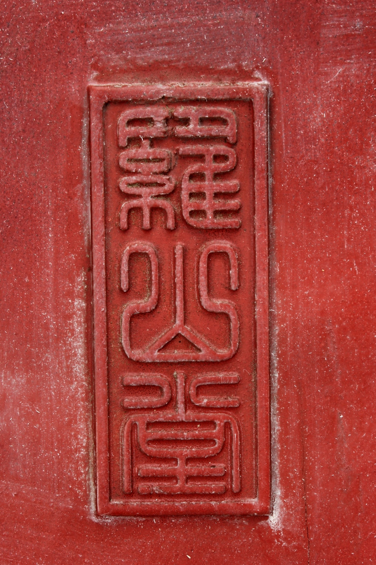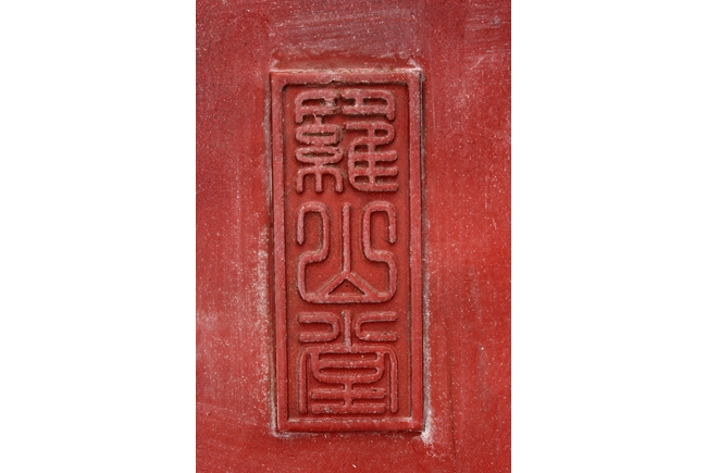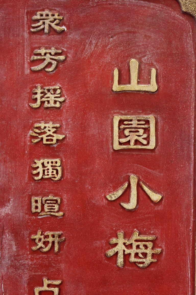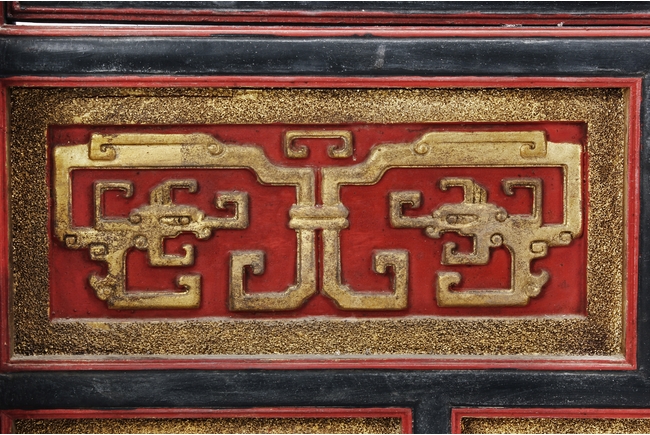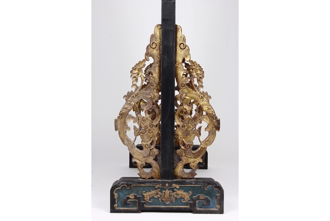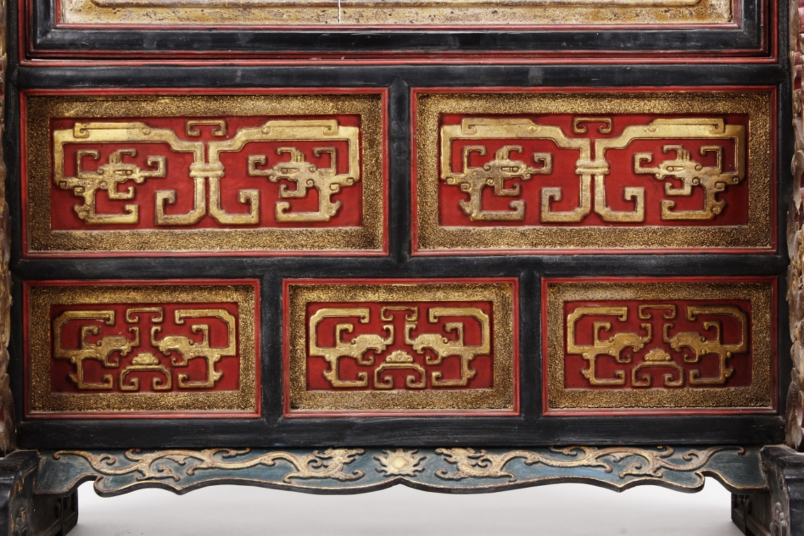 The wooden panel is painted in red ground with golden characters, bearing poem and figures on either side. The stand is divided into six rectangular sections with each carved with figures from storie reserved on red ground. Late Qing Dynasty Period.