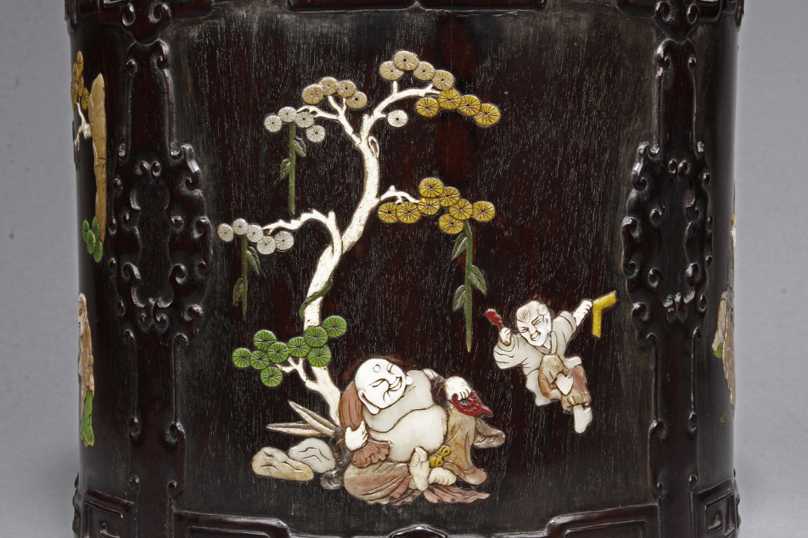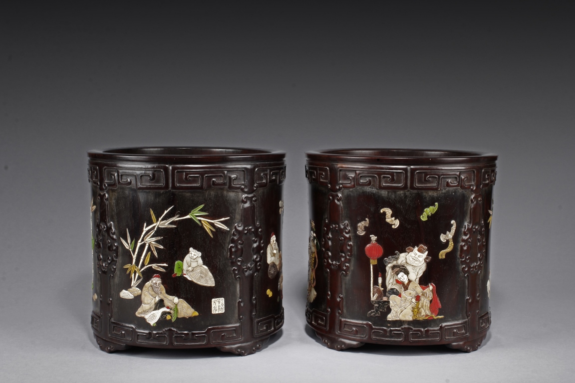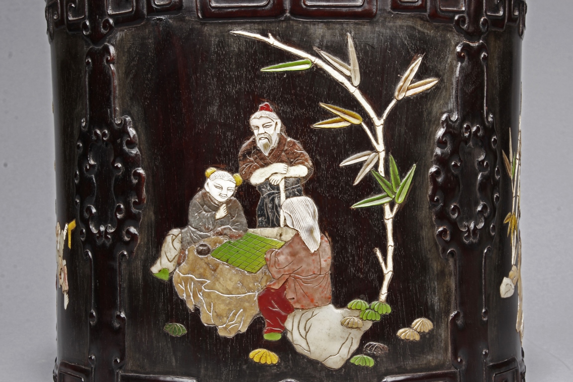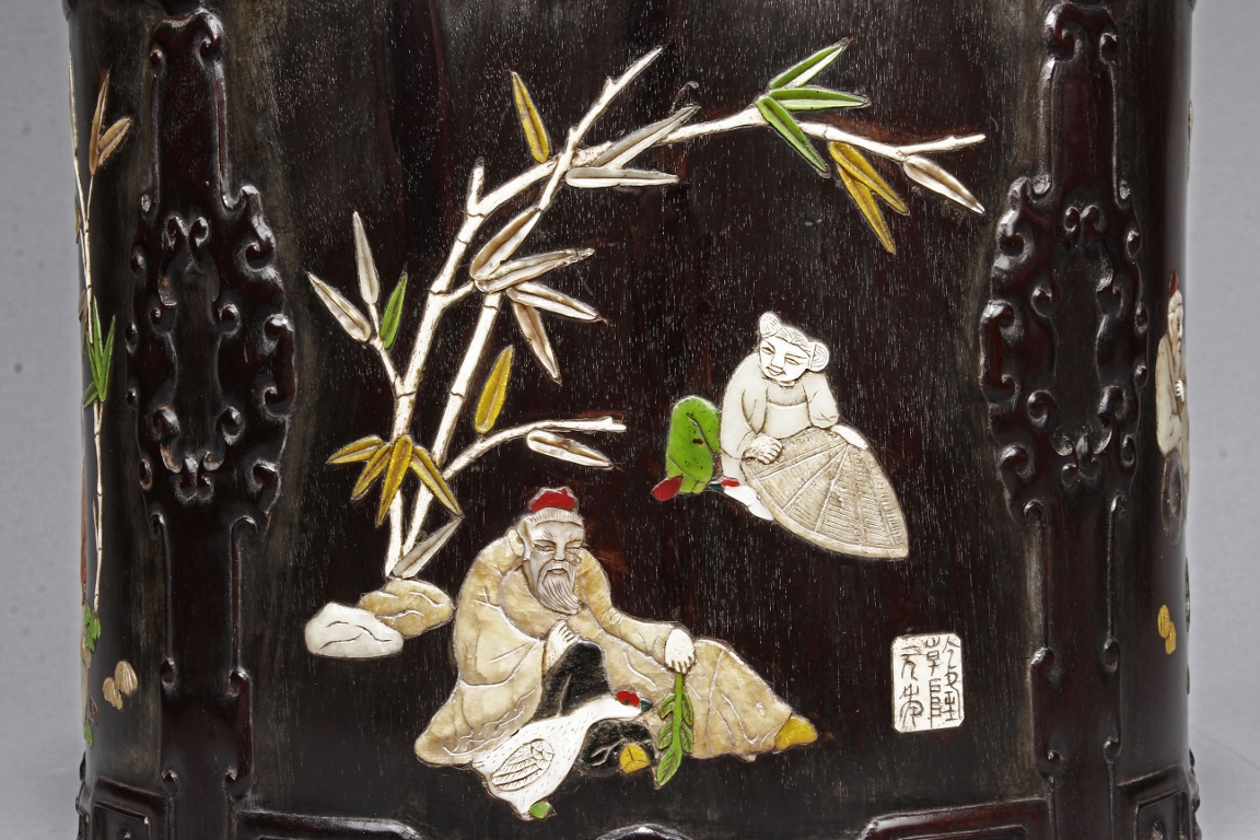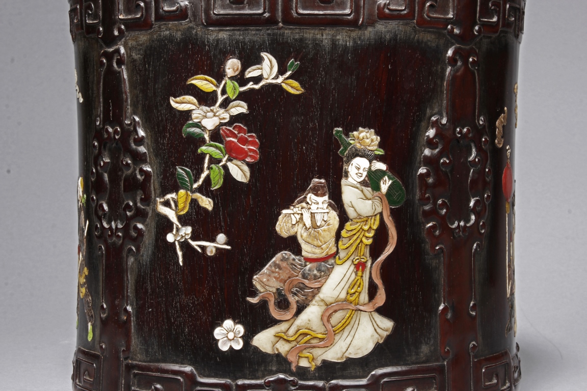 Of cylindrical form raised on three stub feet, the brushpot is finely inlaid with various hardstones, including mother-of-pearl, spinach jade, soaptone,etc to depict figural scenes from different stories, with carved key-fret motif in relief below and above. Republic period.