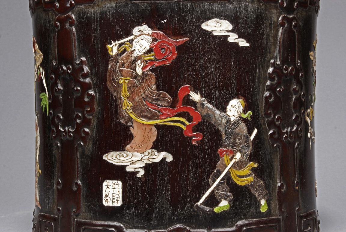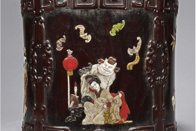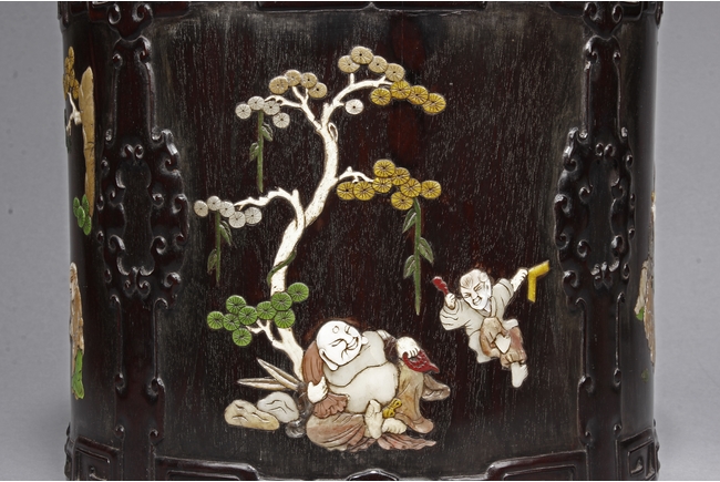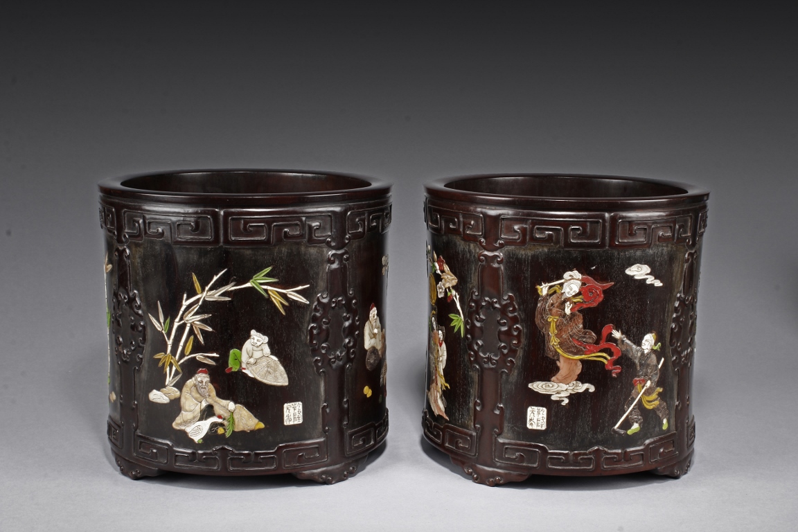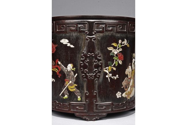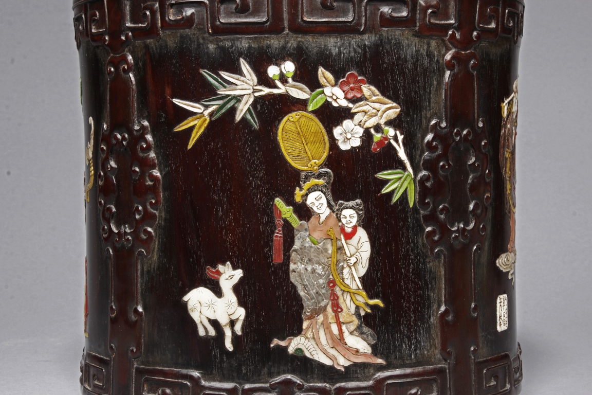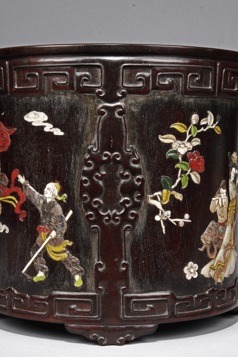 Of cylindrical form raised on three stub feet, the brushpot is finely inlaid with various hardstones, including mother-of-pearl, spinach jade, soaptone,etc to depict figural scenes from different stories, with carved key-fret motif in relief below and above. Republic period.