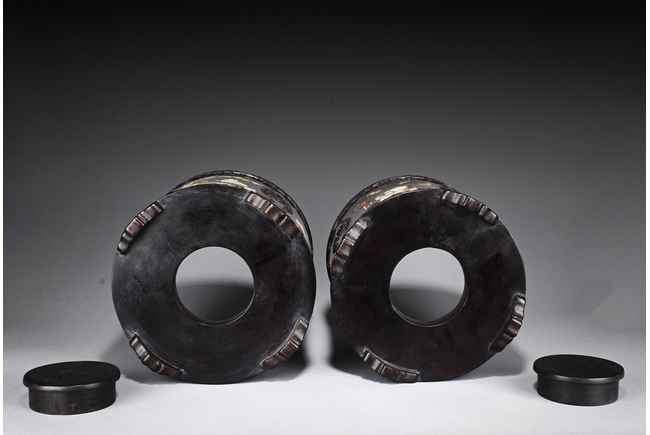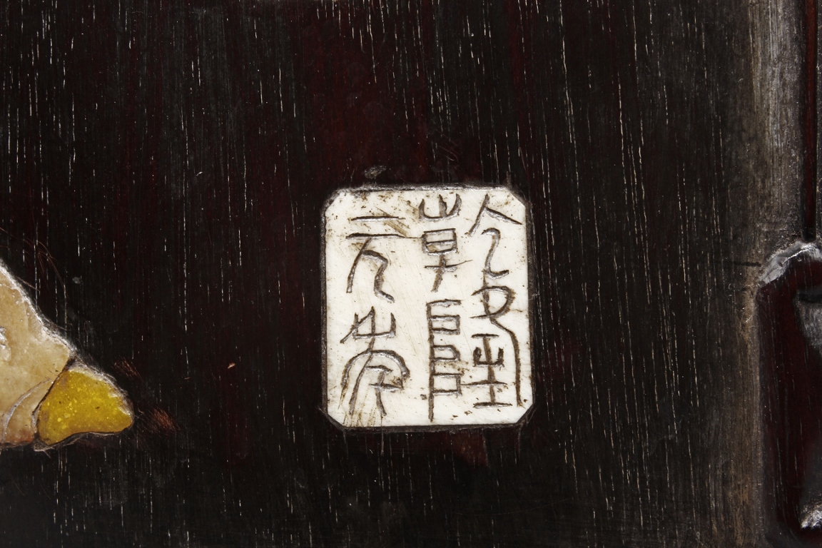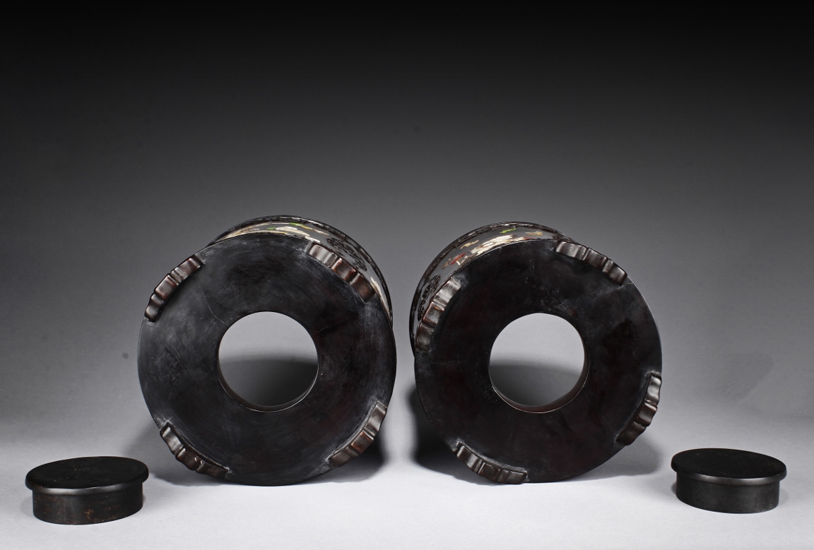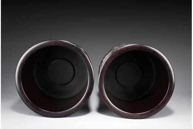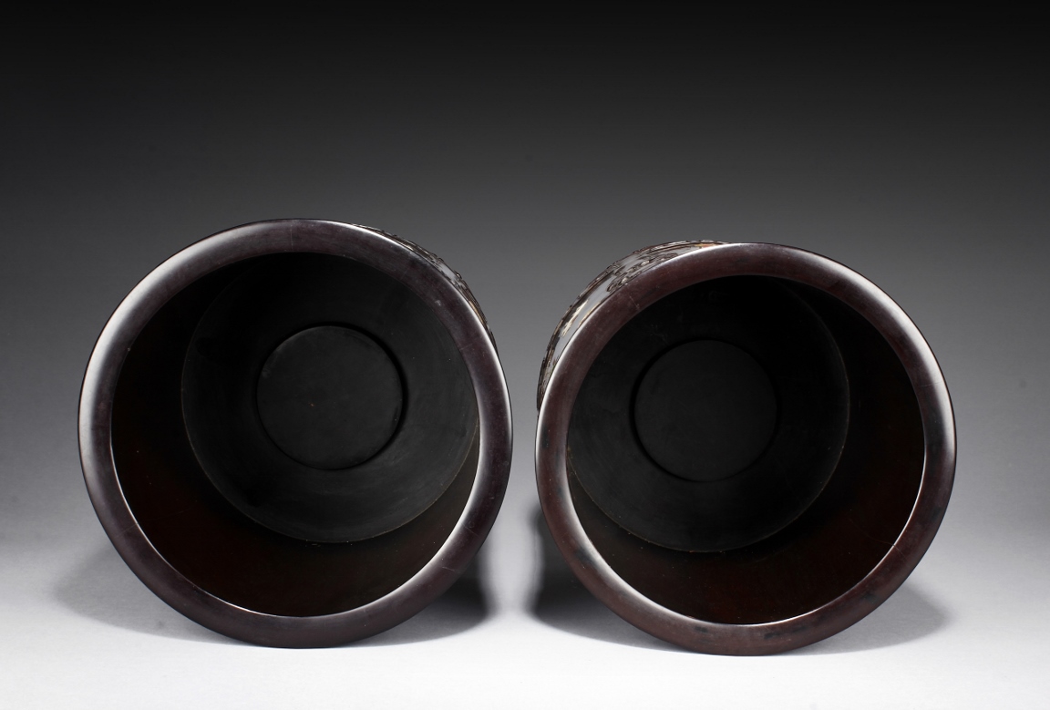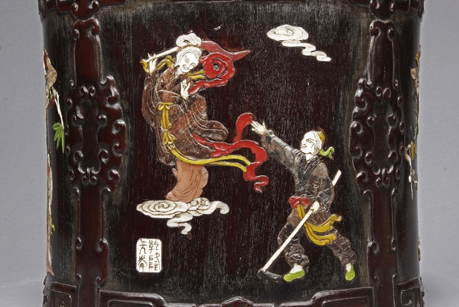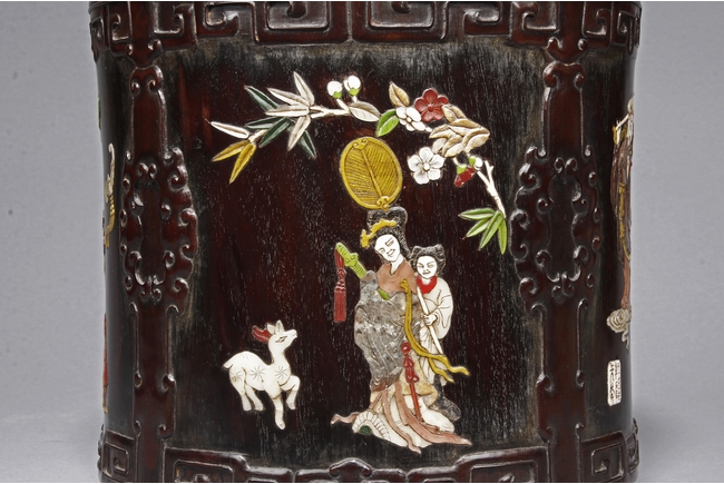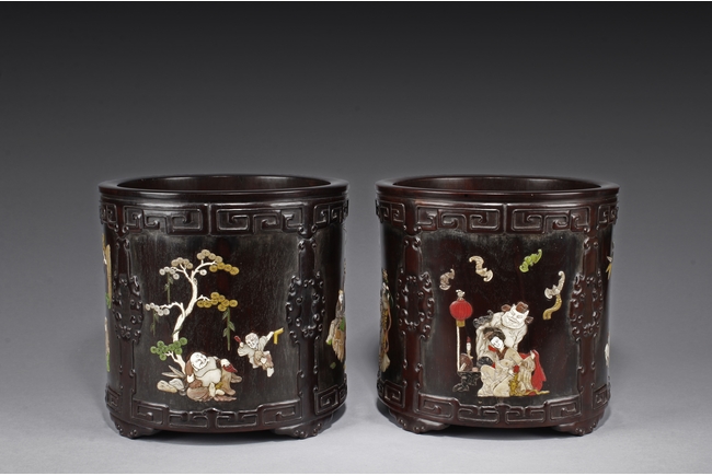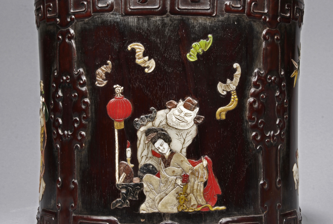 Of cylindrical form raised on three stub feet, the brushpot is finely inlaid with various hardstones, including mother-of-pearl, spinach jade, soaptone,etc to depict figural scenes from different stories, with carved key-fret motif in relief below and above. Republic period.
