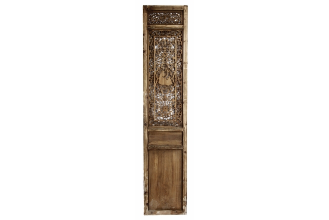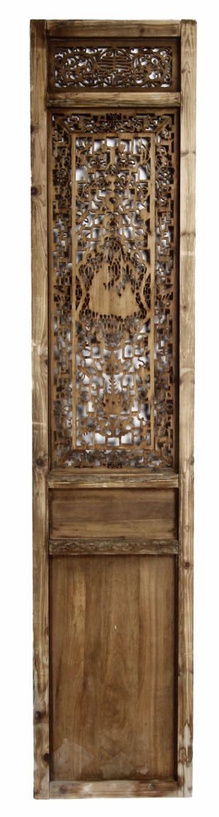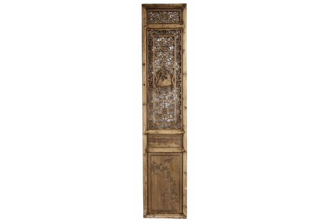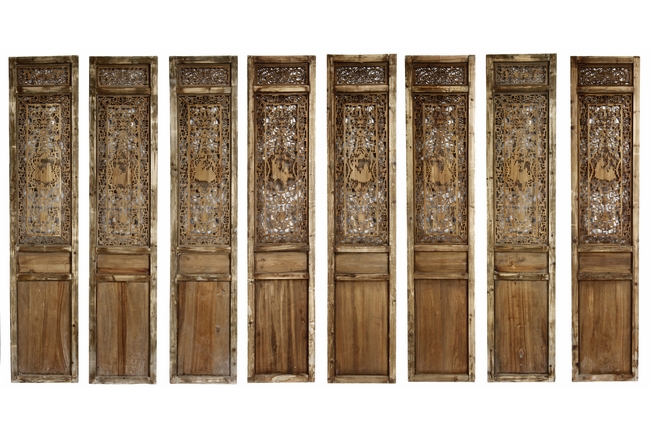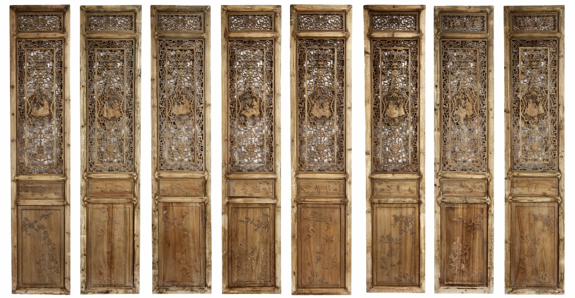 Each of rectangular form, the upper panel carved and pierced with intricate patterns and a stylized 'shou' character, the middle section elegantly pierced with figures flanked by auscpicious motifs and key-fret patterns. The lower section carved in relief with figures from stories.Qing Dynasty period.