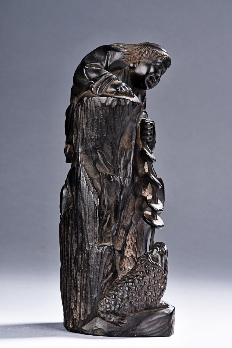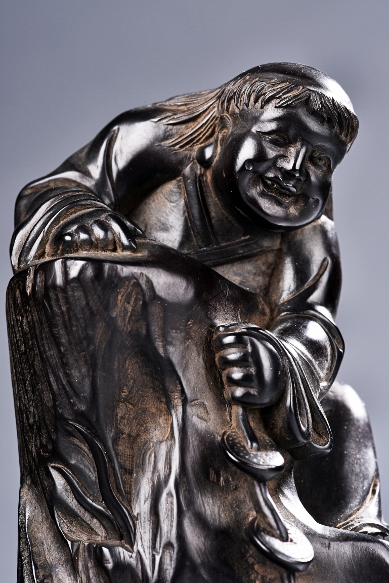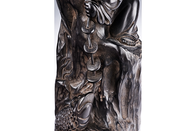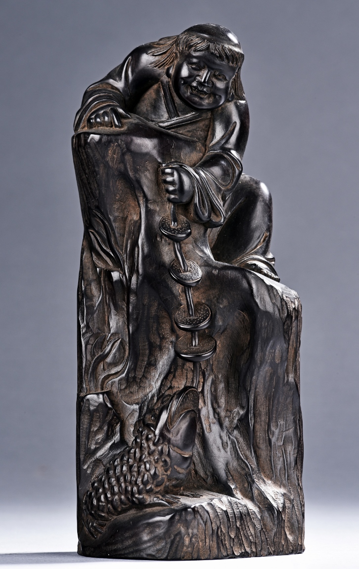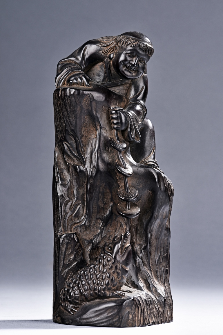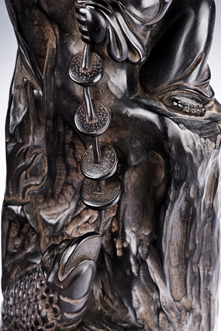 The carving is modelled with the Taoist immortal Liu hai holding a string of coins on top of rock, joyfully watching his toad whom trying to grab the coins with mouth below him. Qing Dynasty Period.
