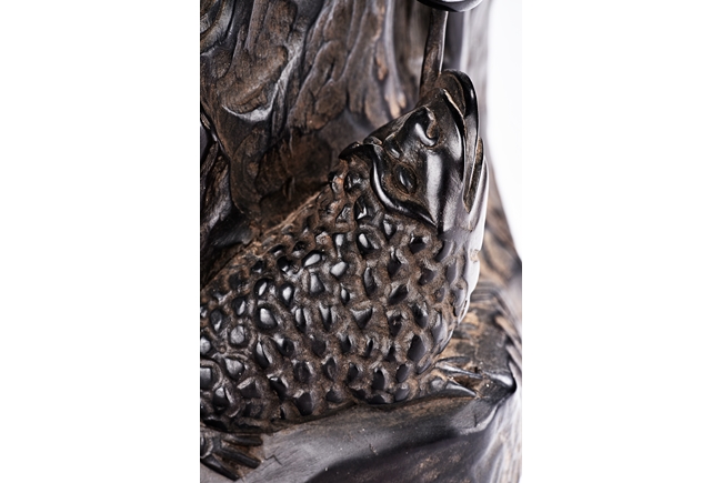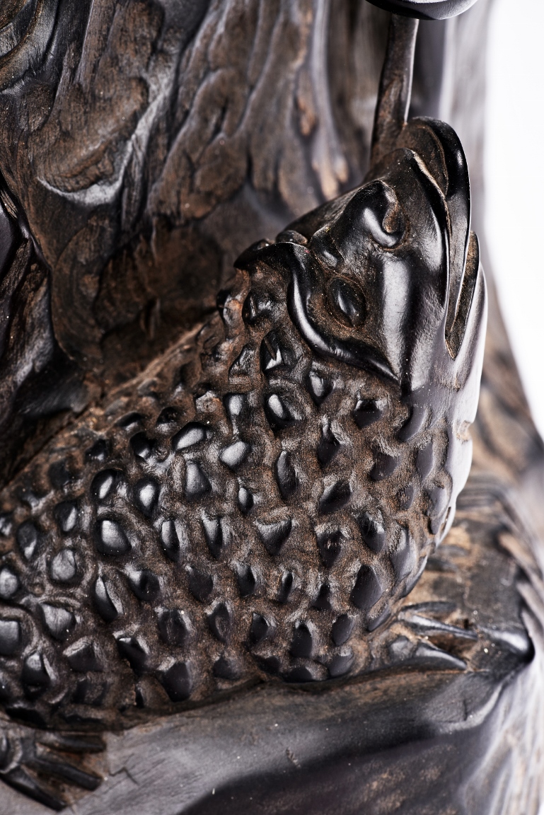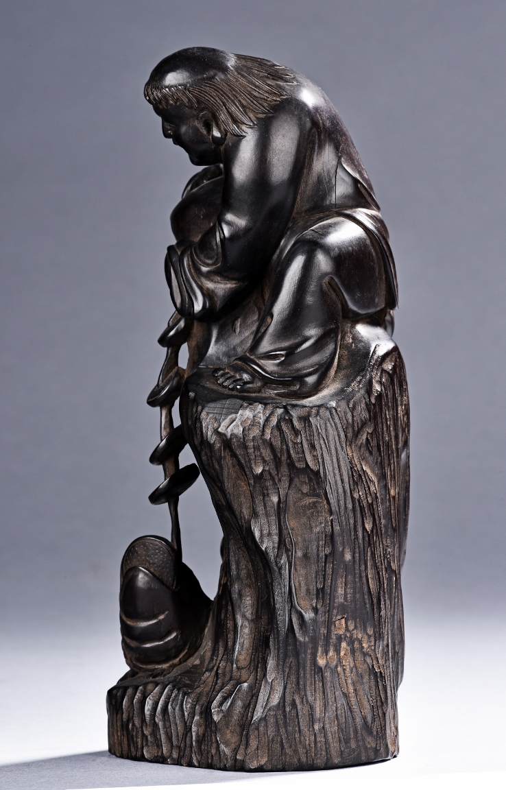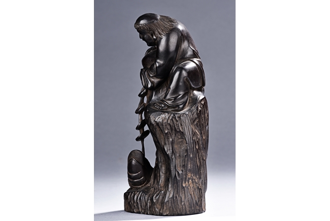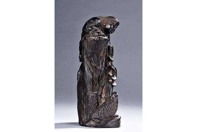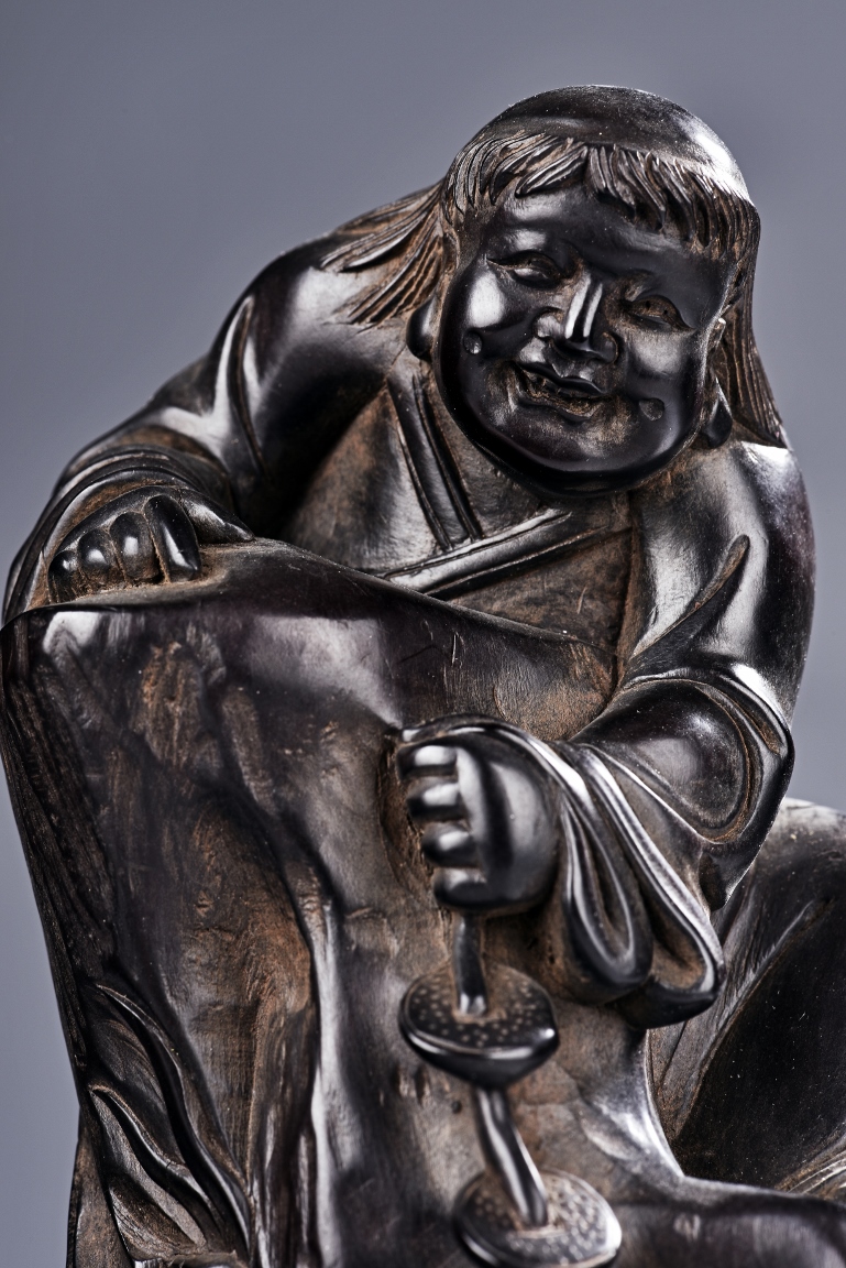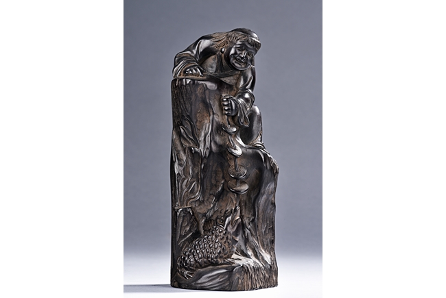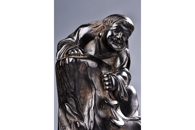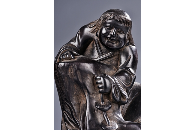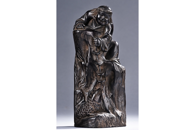 The carving is modelled with the Taoist immortal Liu hai holding a string of coins on top of rock, joyfully watching his toad whom trying to grab the coins with mouth below him. Qing Dynasty Period.