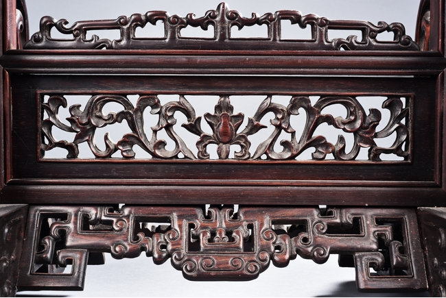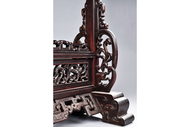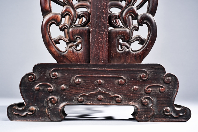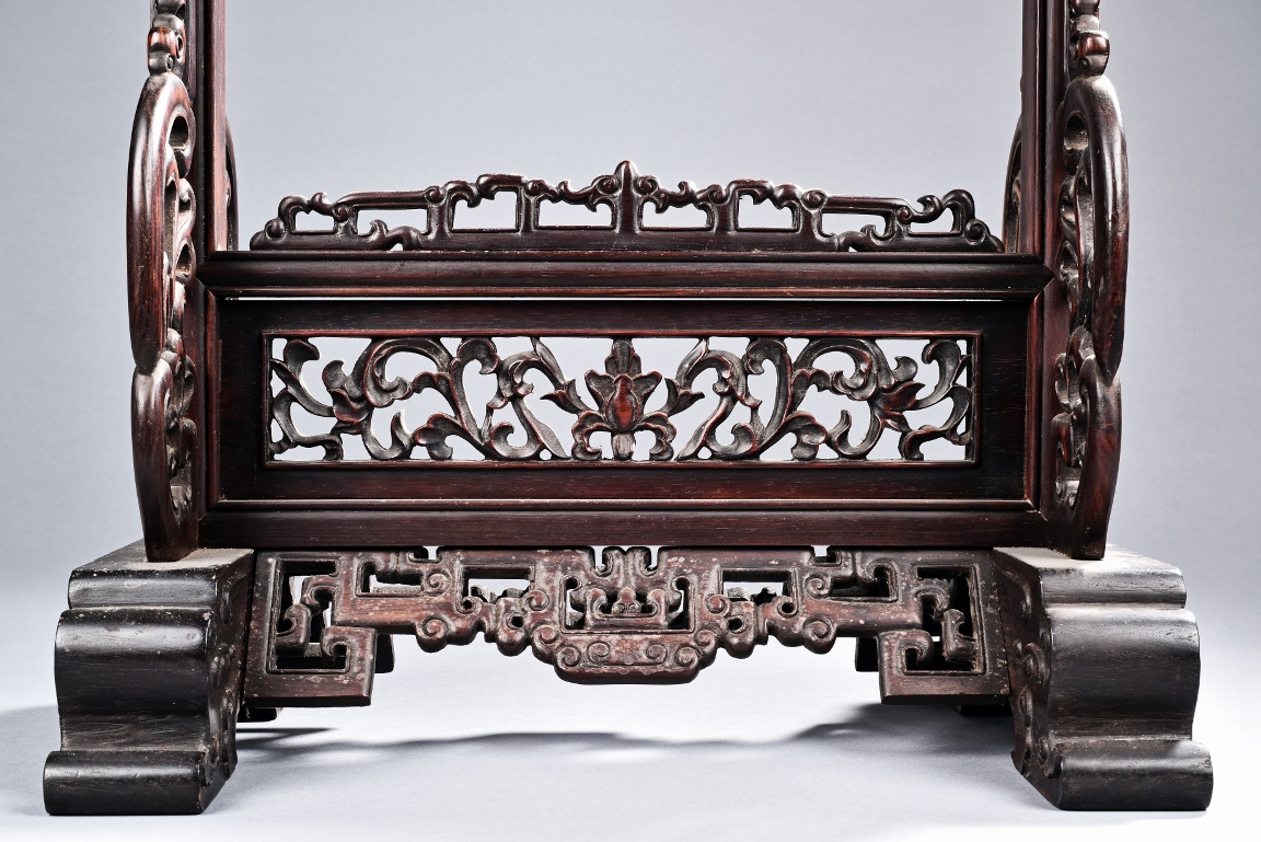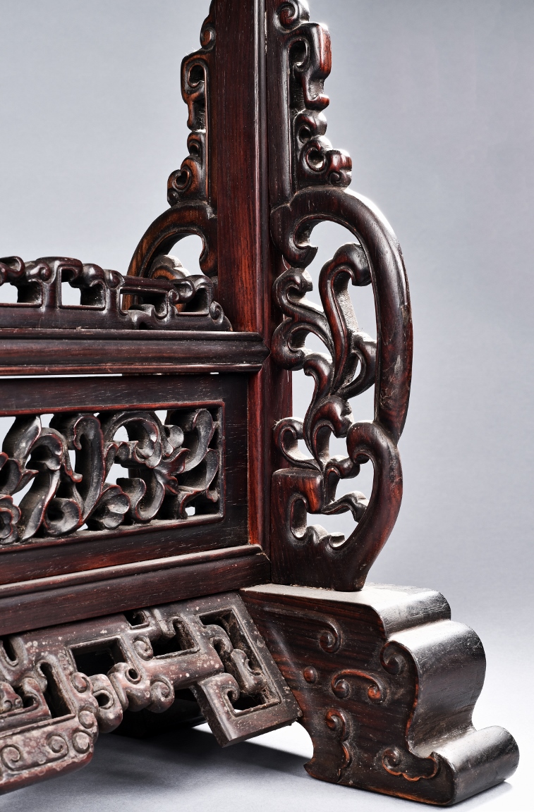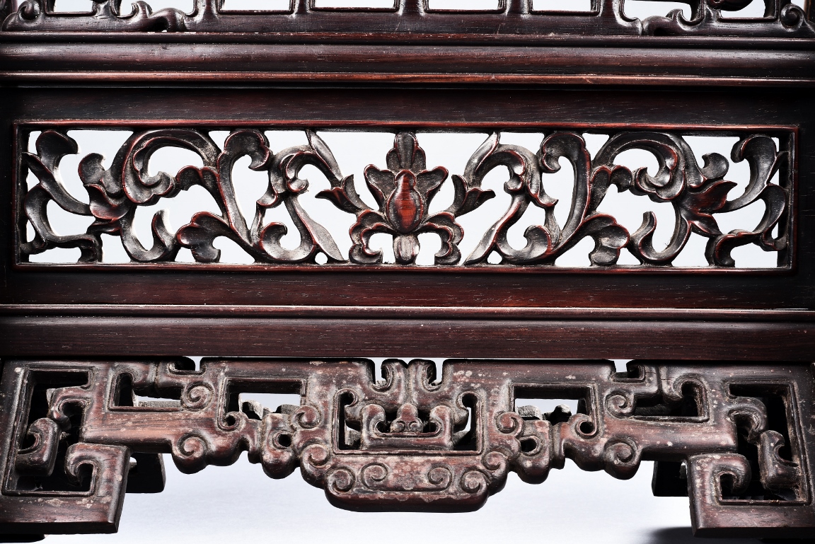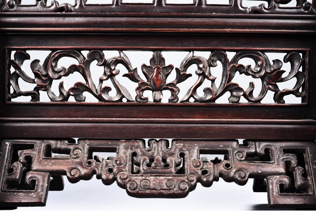 The frame is delicately carved and pierced with scrolling intertwining foliage design, the bottom with openwork floral design, the sides with stylized floral motif. Qing Dynasty Period.