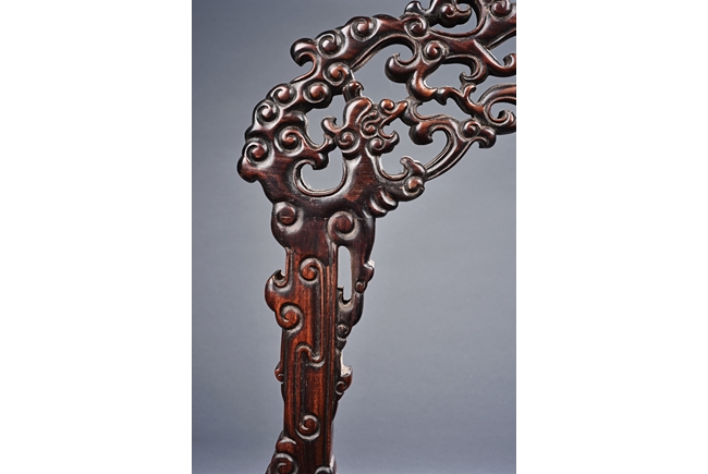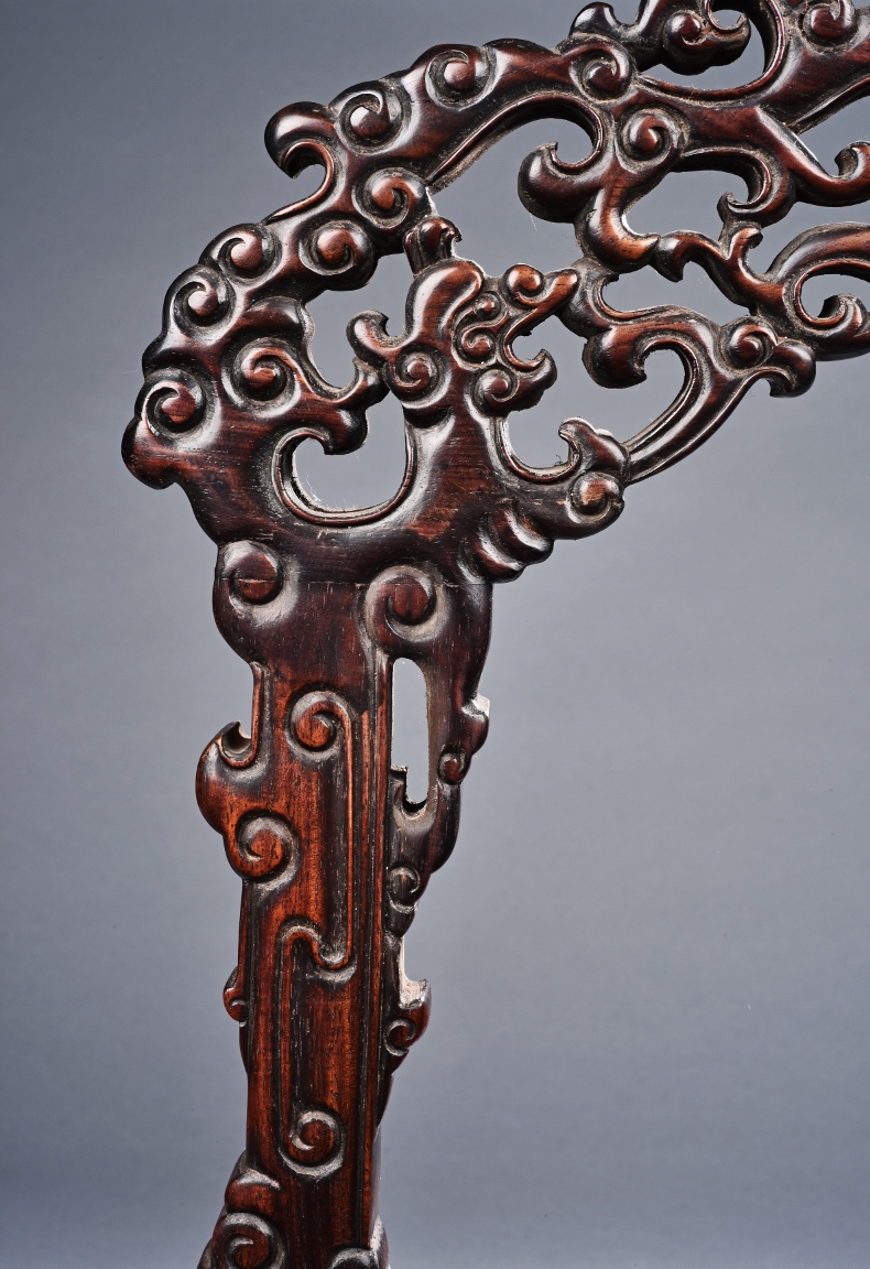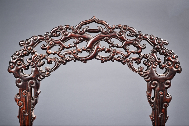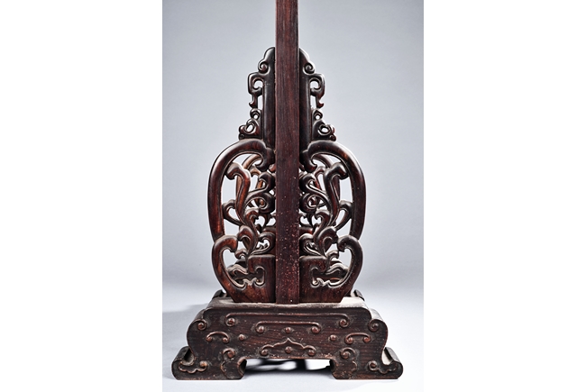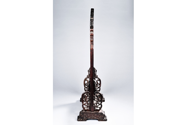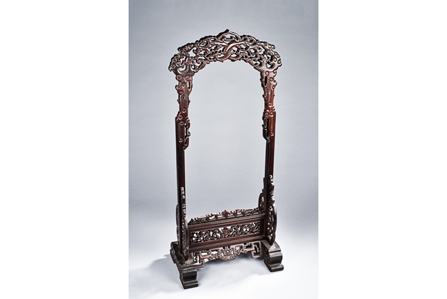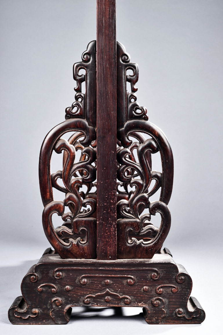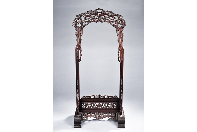 The frame is delicately carved and pierced with scrolling intertwining foliage design, the bottom with openwork floral design, the sides with stylized floral motif. Qing Dynasty Period.