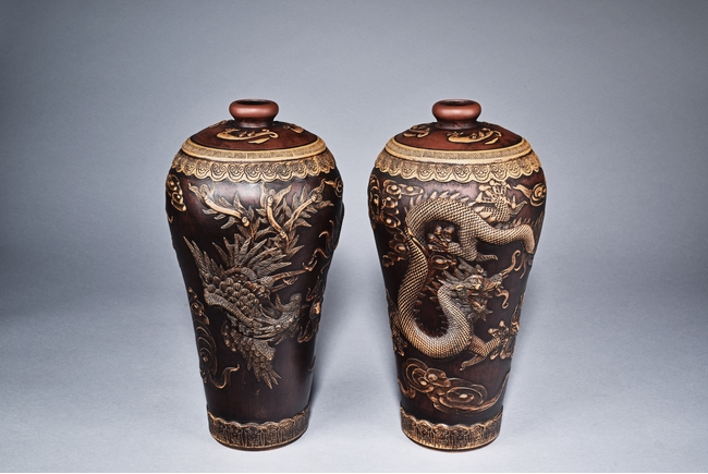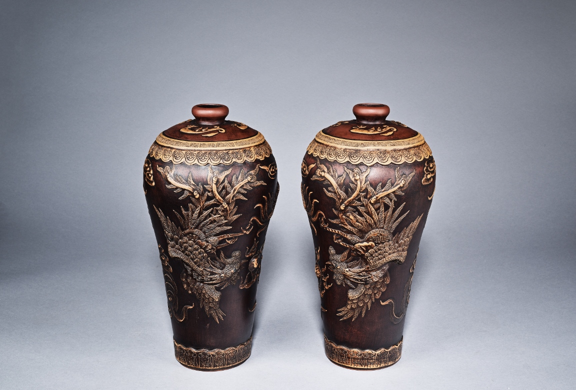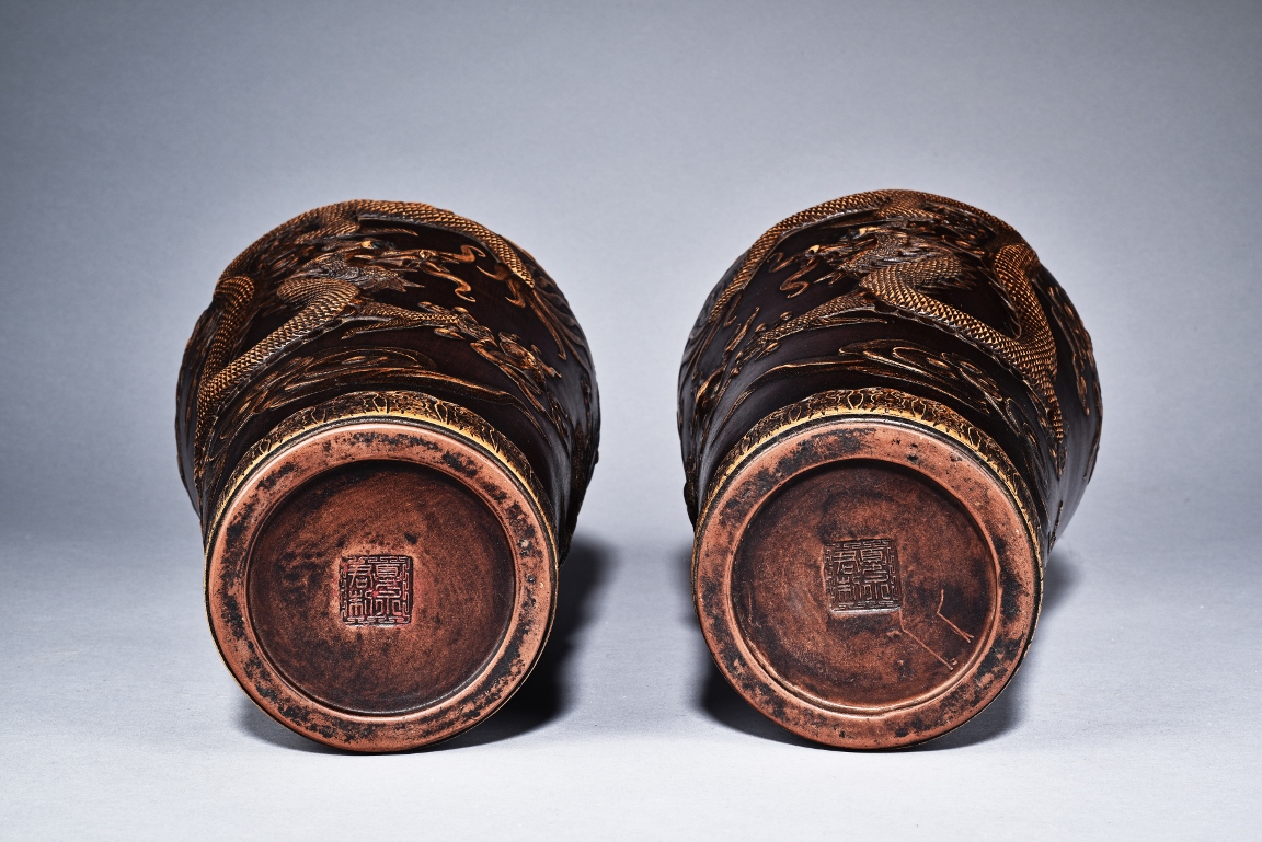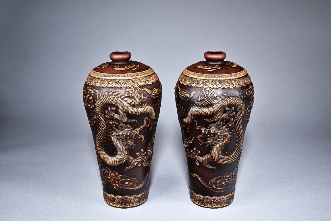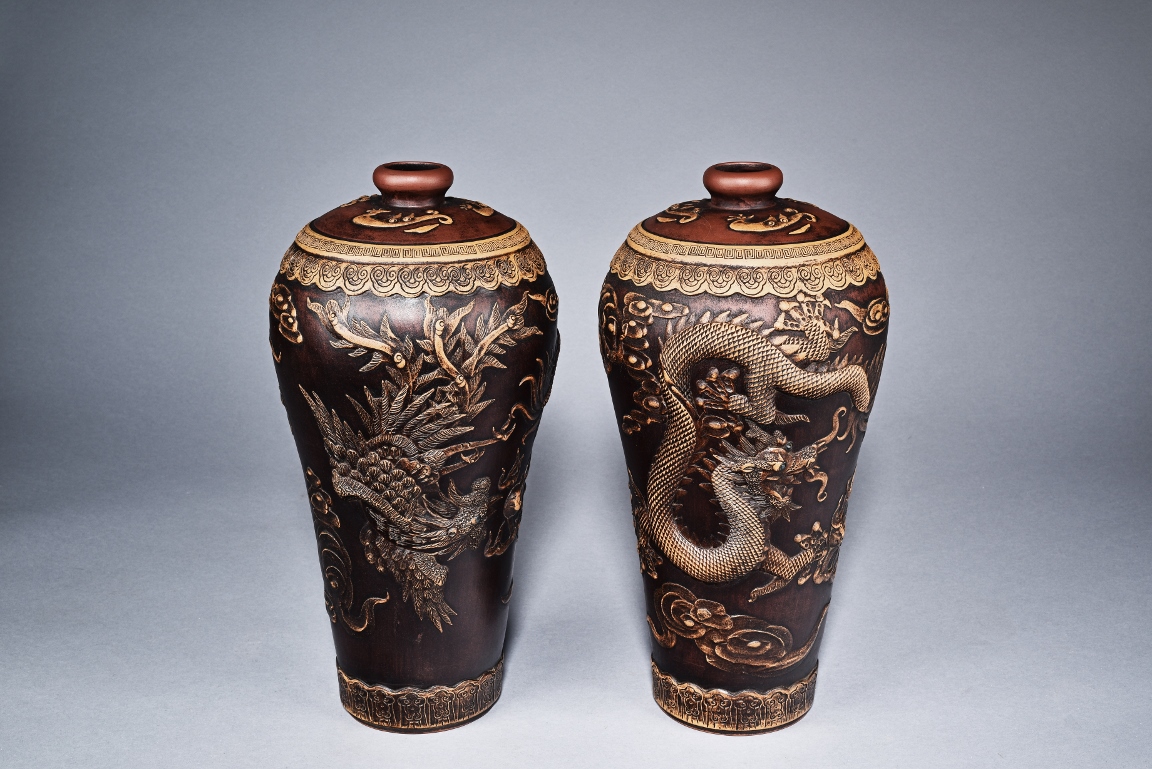 With a broad shoulder and tapering body, each meiping is delicately carved with ferocious dragons amid auspicious clouds in medium relief flanked by ruyi band below and above, with key-fret pattern around the neck. The bottom base bears a four character ' Xia Yong Jun Zhi' mark.