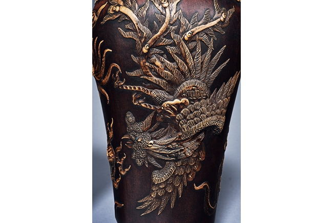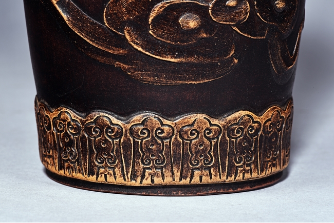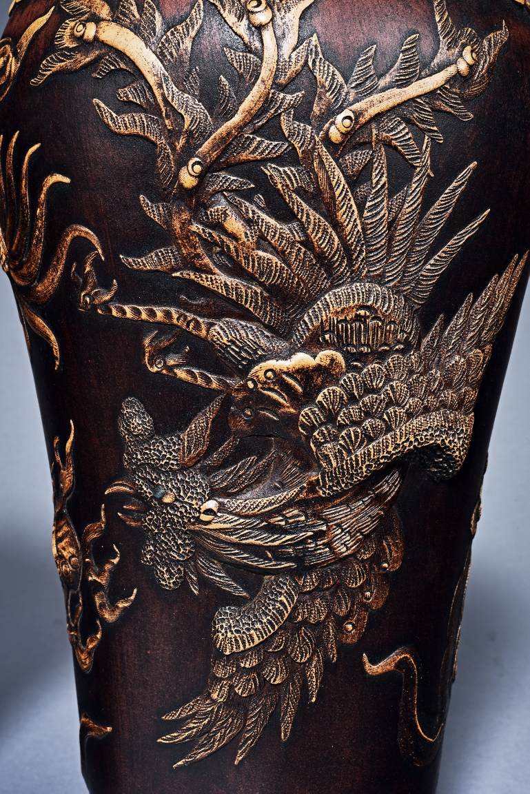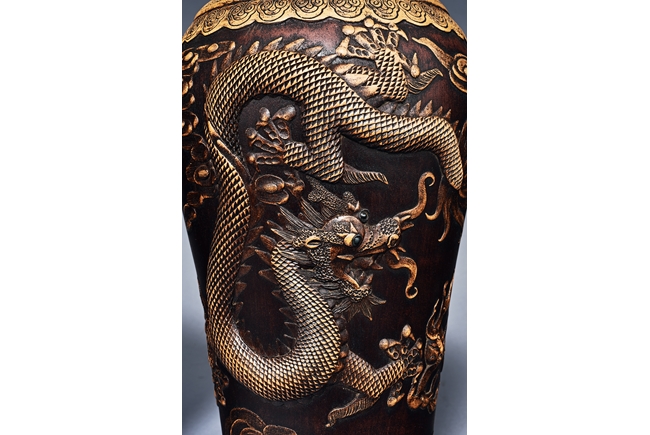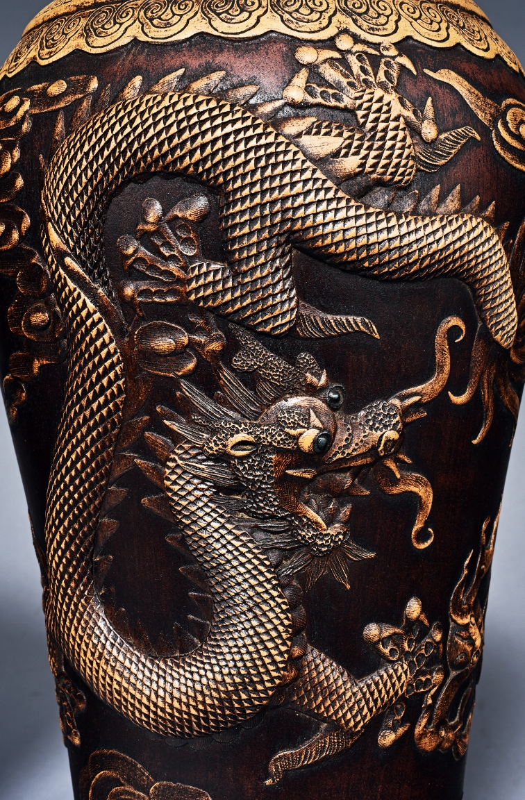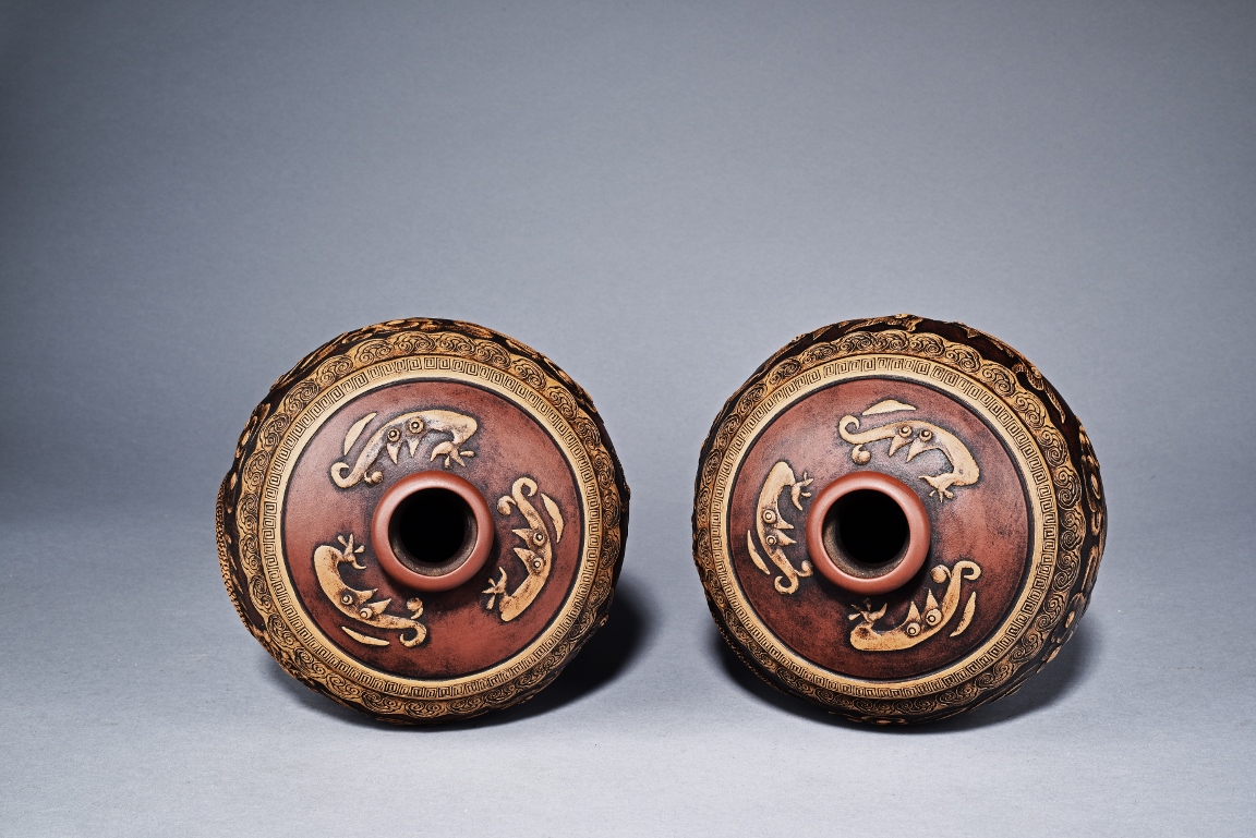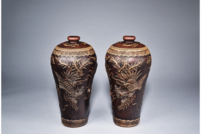 With a broad shoulder and tapering body, each meiping is delicately carved with ferocious dragons amid auspicious clouds in medium relief flanked by ruyi band below and above, with key-fret pattern around the neck. The bottom base bears a four character ' Xia Yong Jun Zhi' mark.