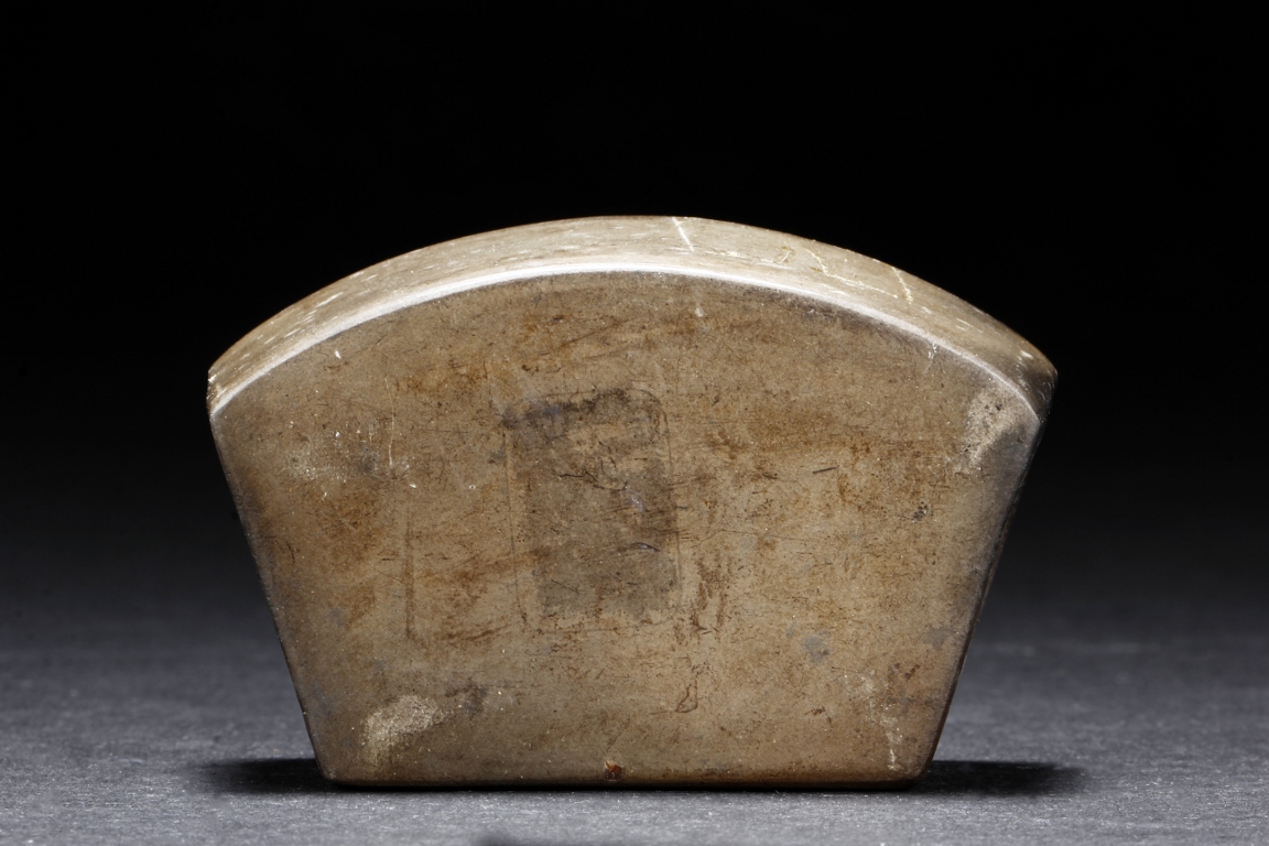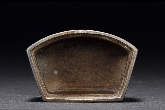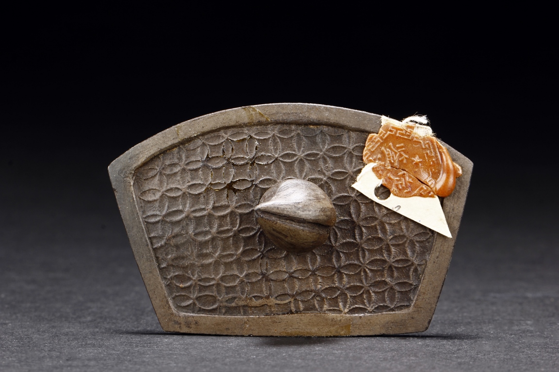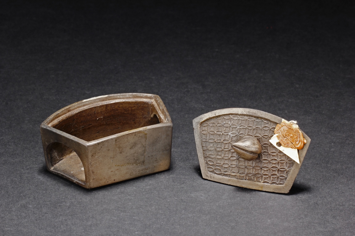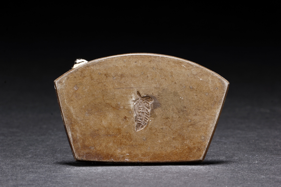 Of fan shape, this Yixing Zisha box has a cover topped with peach shaped knob on a network of coin patterns. The bottom bears three Chinese characters mark.