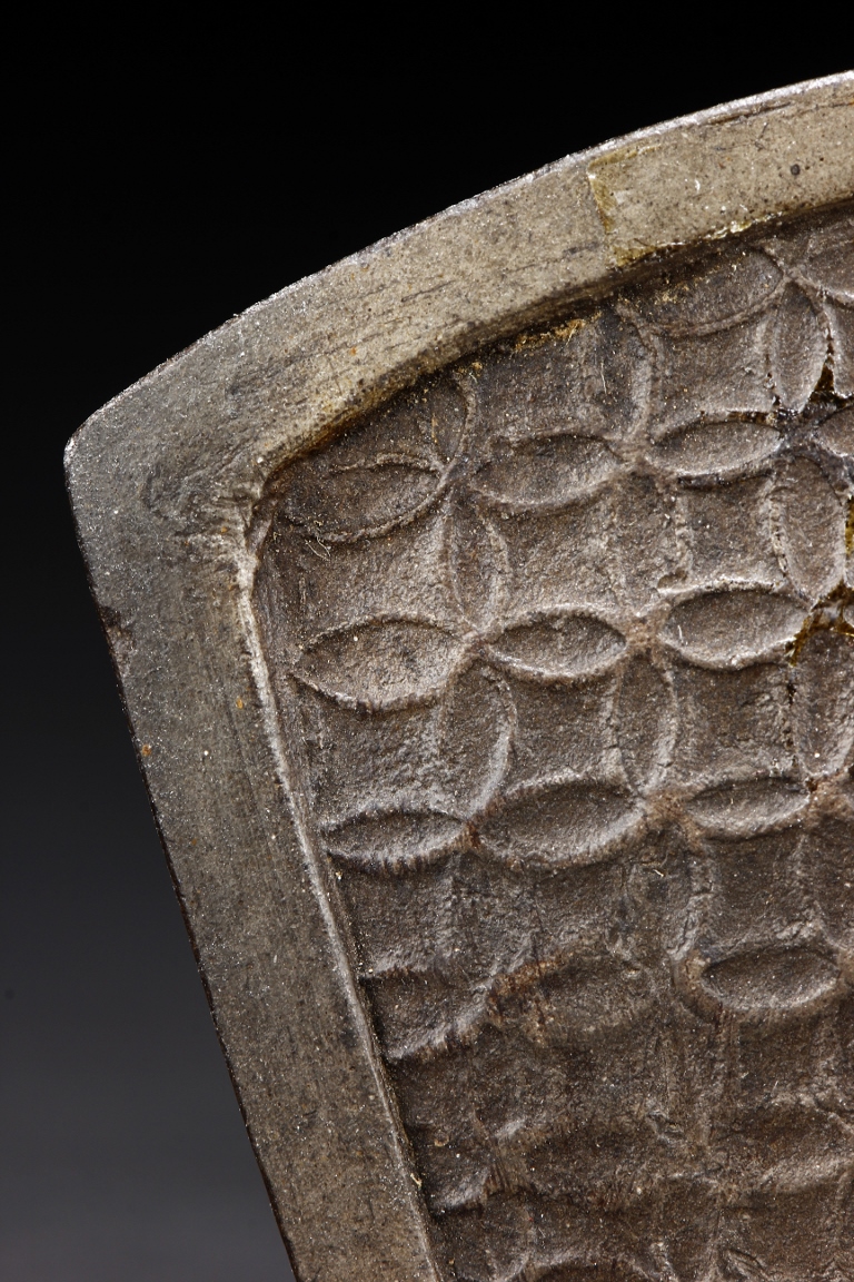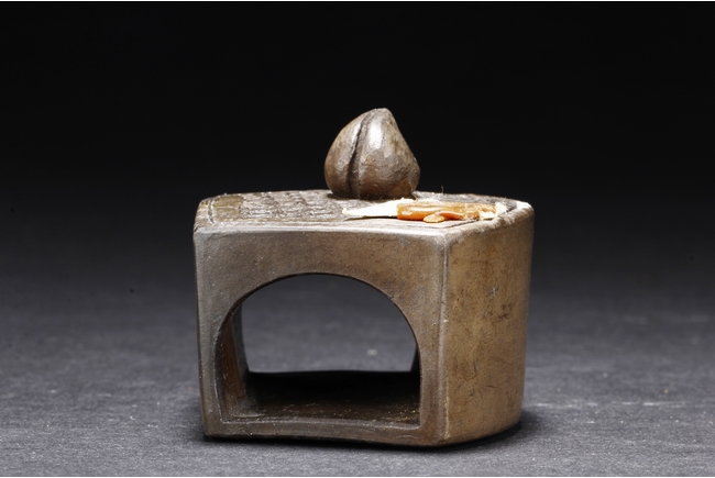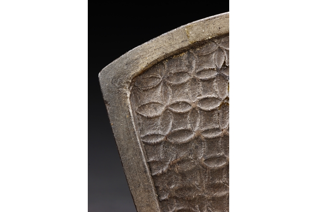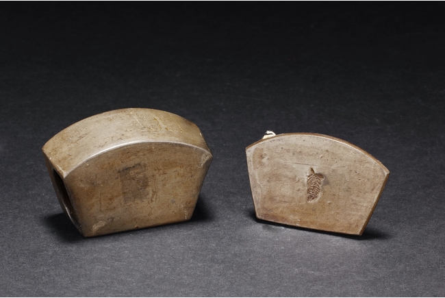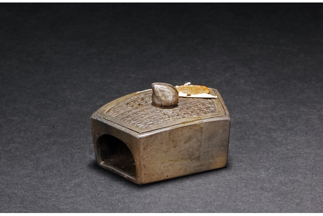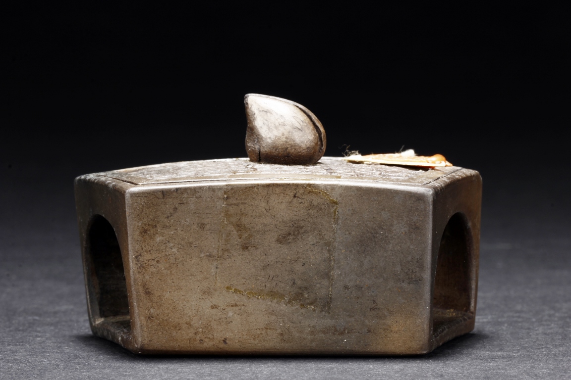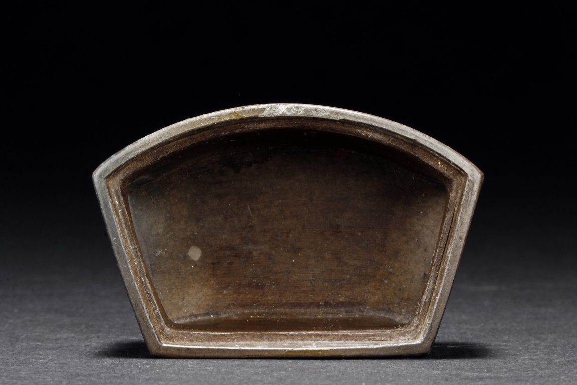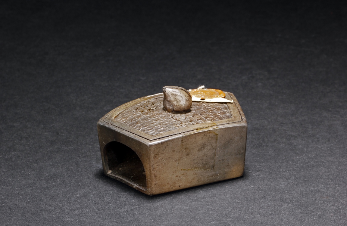 Of fan shape, this Yixing Zisha box has a cover topped with peach shaped knob on a network of coin patterns. The bottom bears three Chinese characters mark.