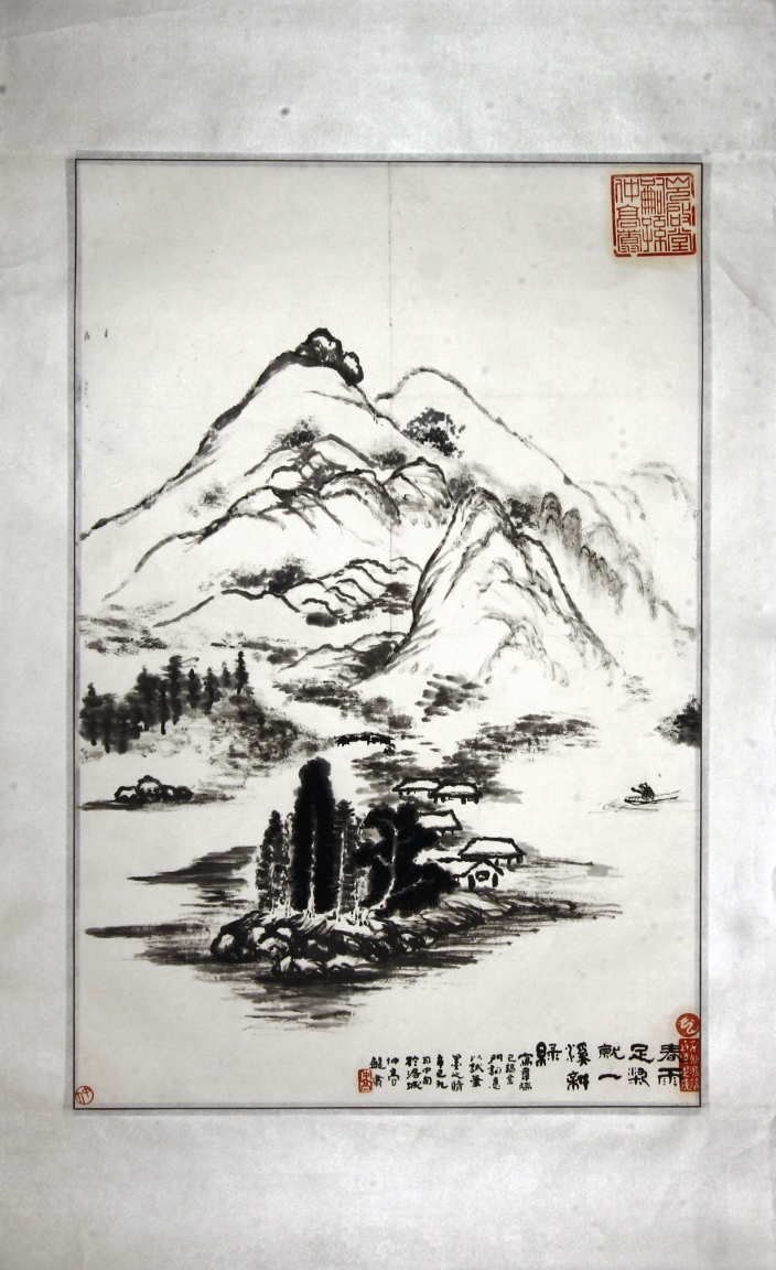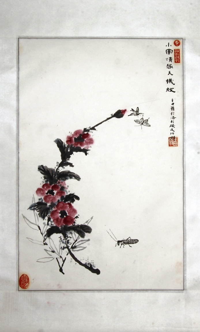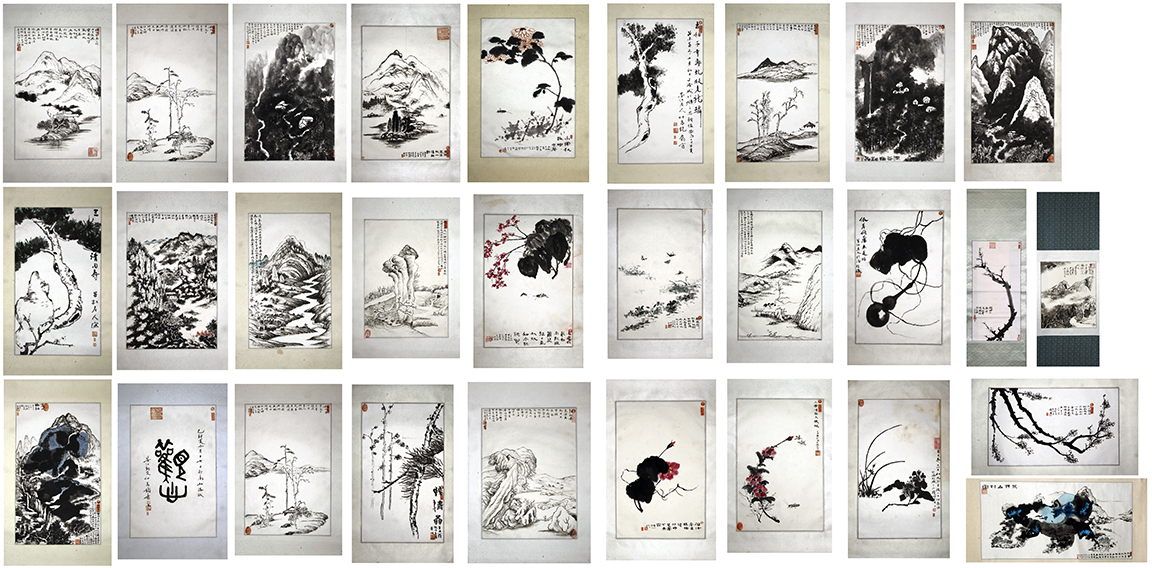 The set consisits of 29 ink and color on paper paintings, with various themes, including landscape, flowers, and calligraphy, with artist’s seals and inscriptions.