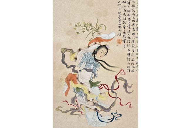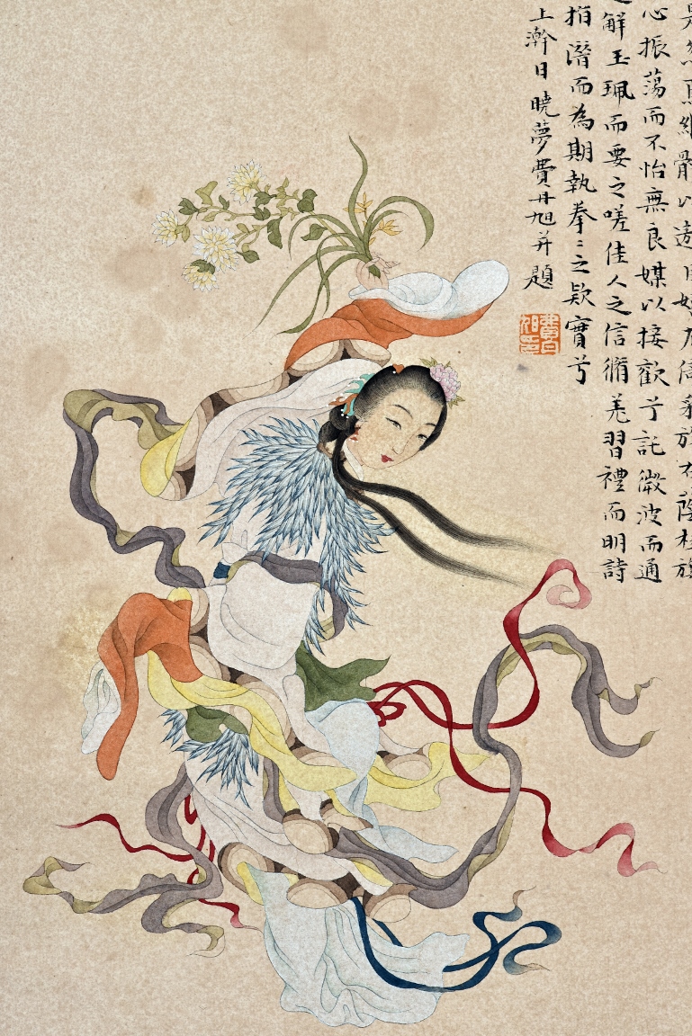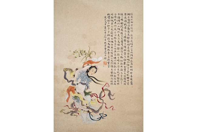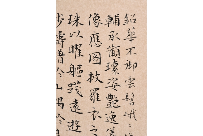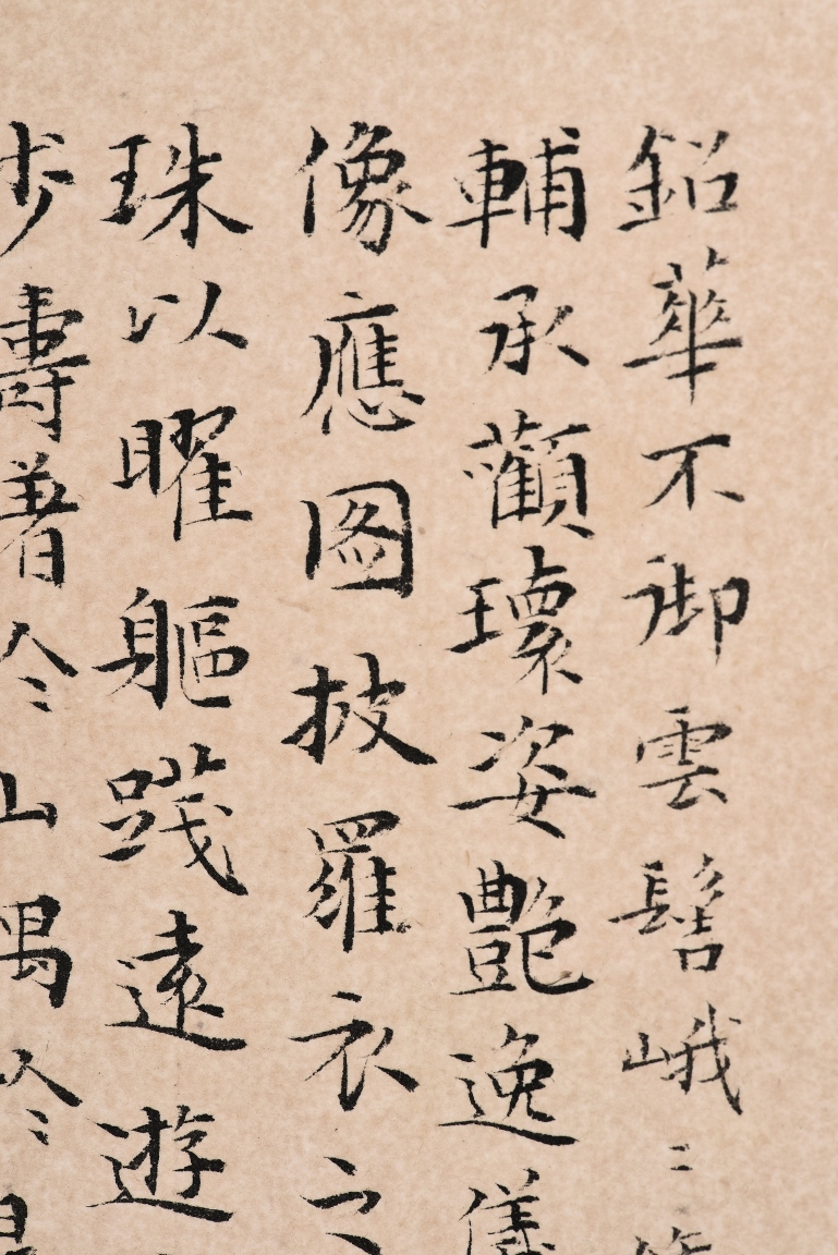 釋文:鉛華不御,雲髻峨峨,修眉聯娟,丹唇外朗,皓齒內鮮,明眸善睞,靨輔承權,瑰姿艷逸,儀靜體閑。柔情綽態,媚於語言。奇服曠世,骨像應圖。披羅衣之璀粲兮,珥瑤碧之華琚。戴金翠之首飾,綴明珠以耀軀。踐遠游之文履,曳霧綃之輕裾。微幽蘭之芳藹兮,步踟躕於山隅。於是忽焉縱體,以遨以嬉。左倚采旄,右蔭桂旗。壤皓腕於神滸兮,采湍瀨之玄芝。余情悅其淑美兮,心振蕩而不怡。無良媒以接歡兮,托微波而通辭。願誠素之先達兮,解玉佩以要之。嗟佳人之信修,羌習禮而明詩,抗瓊珶以和予兮,指潛淵而為期,執眷眷之款實兮。
