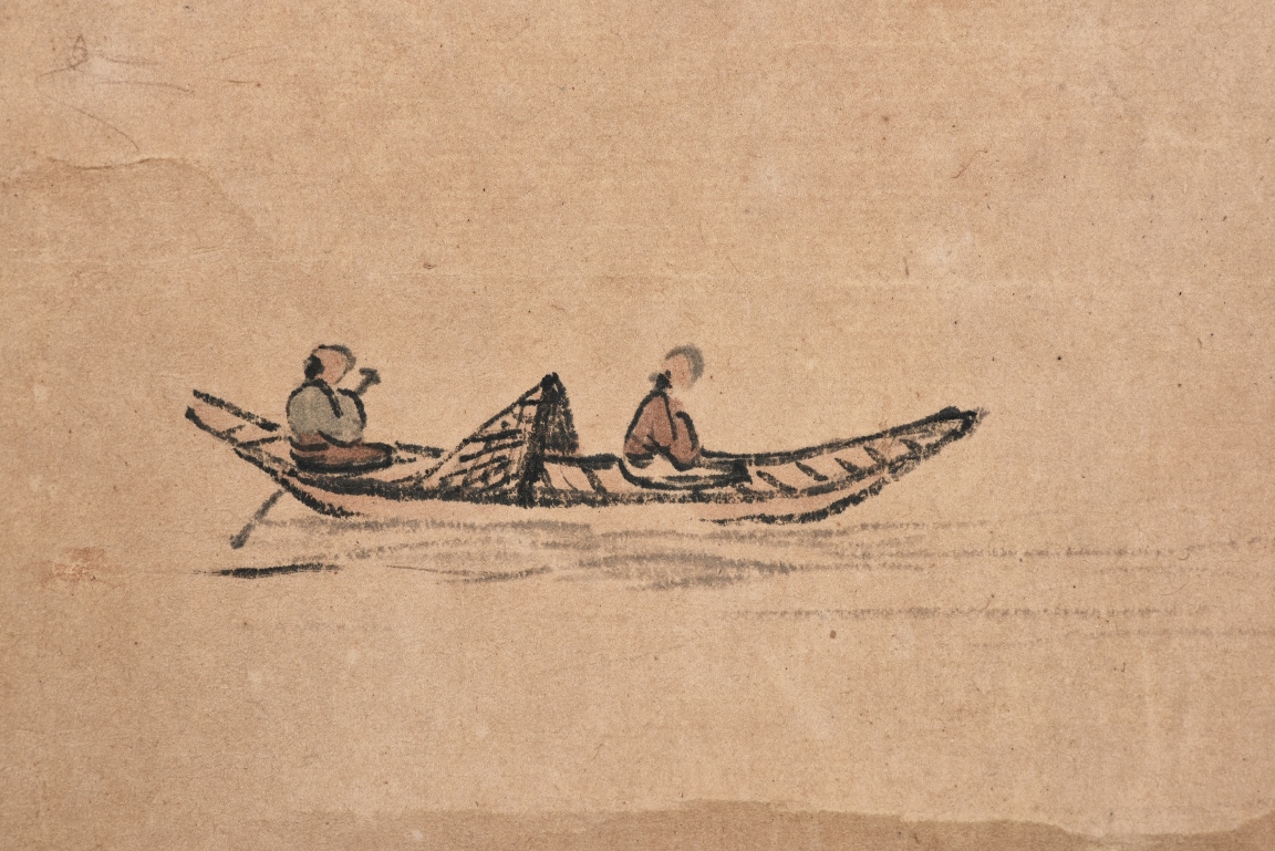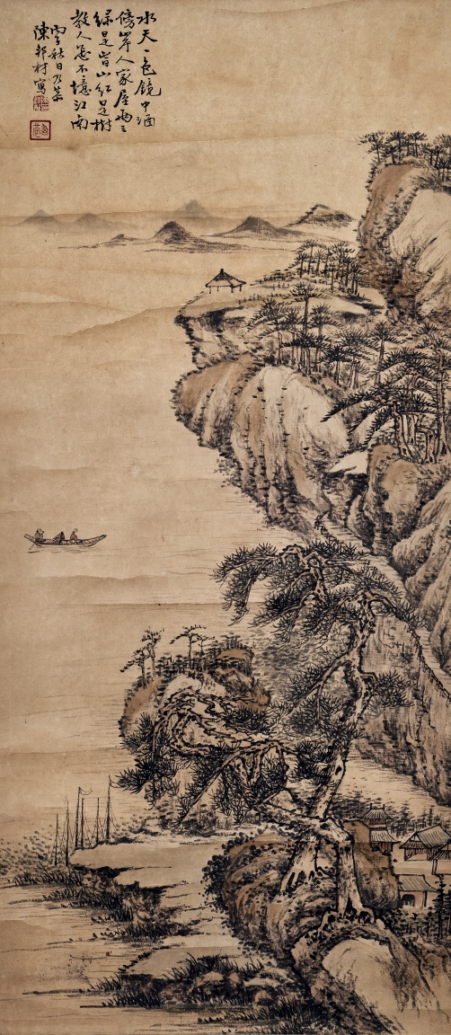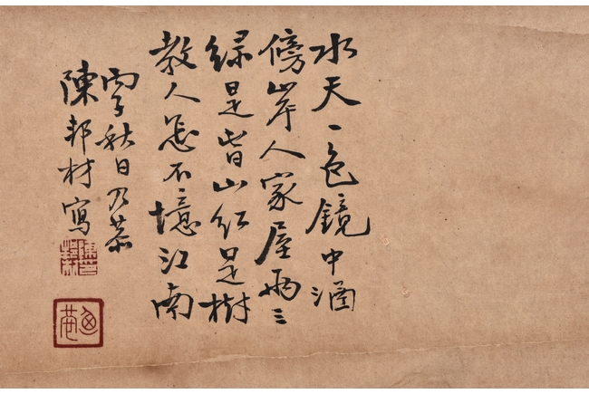 題識:水天一色鏡中涵,傍岸人家屋兩三,綠是春山紅是樹,教人怎不憶江南。丙子秋月乃某陳邦材。
