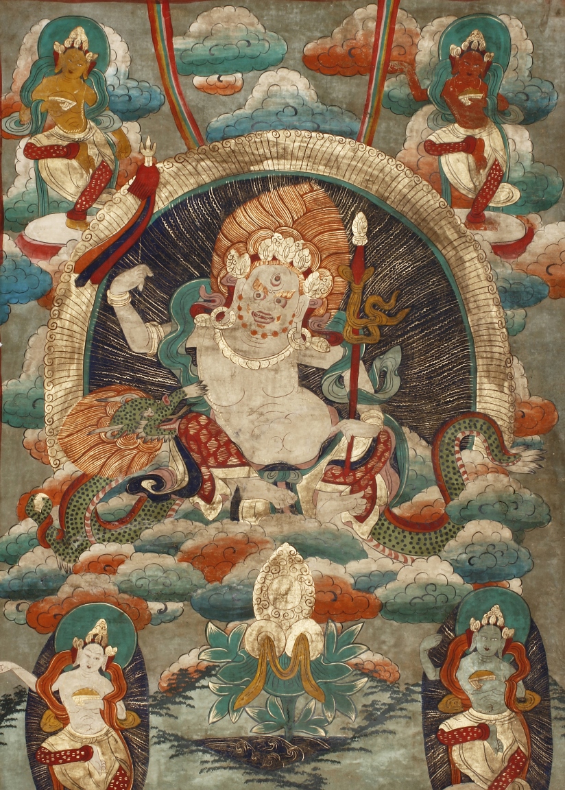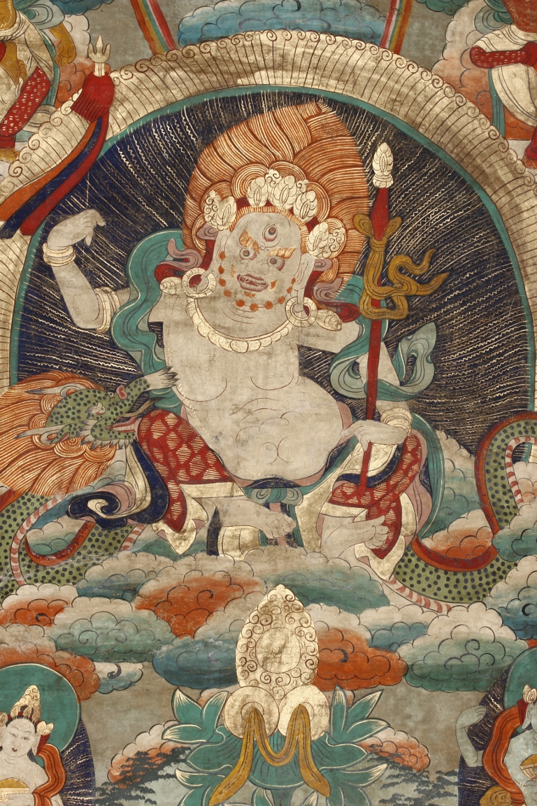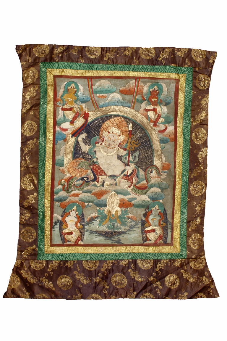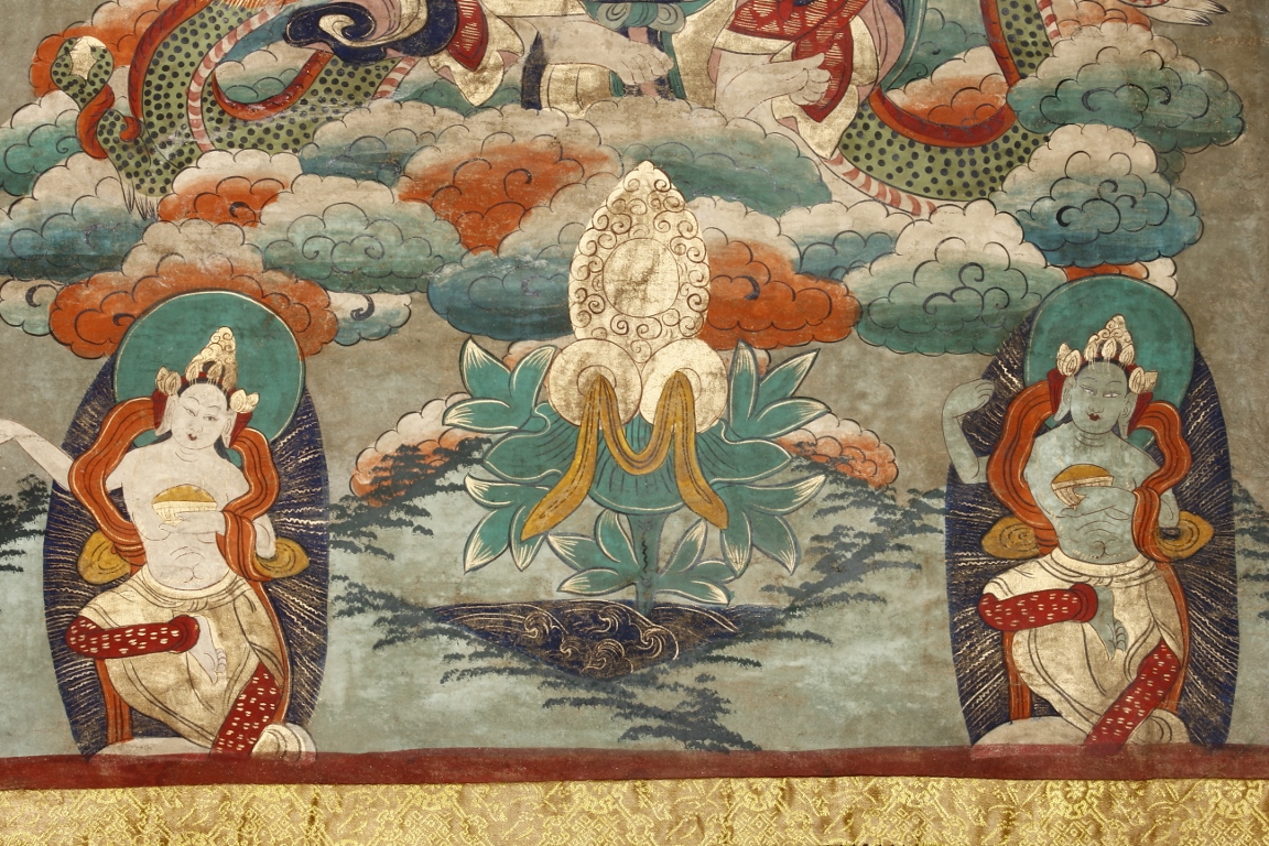 The thangka depicts an immortal in a celestial setting surrounding by five attendants.