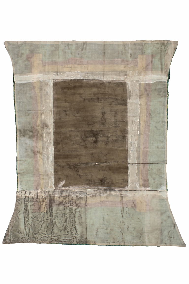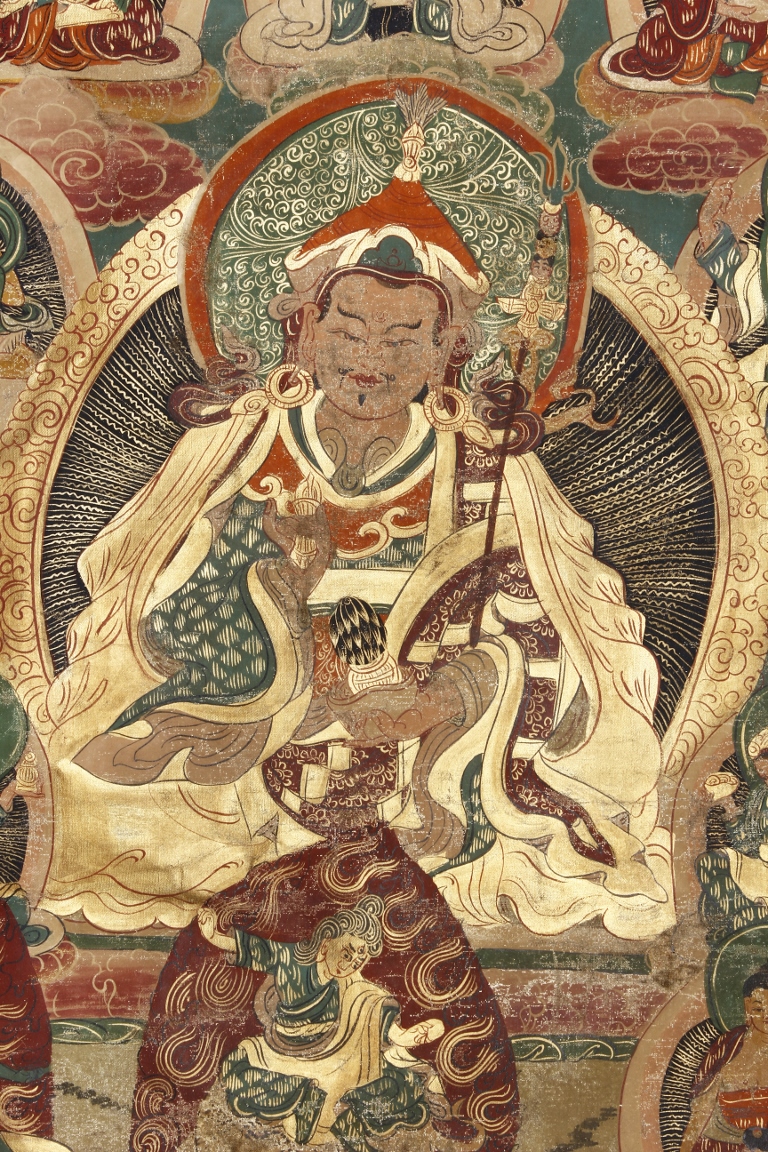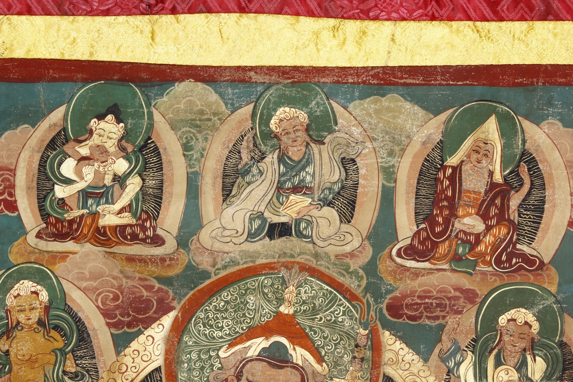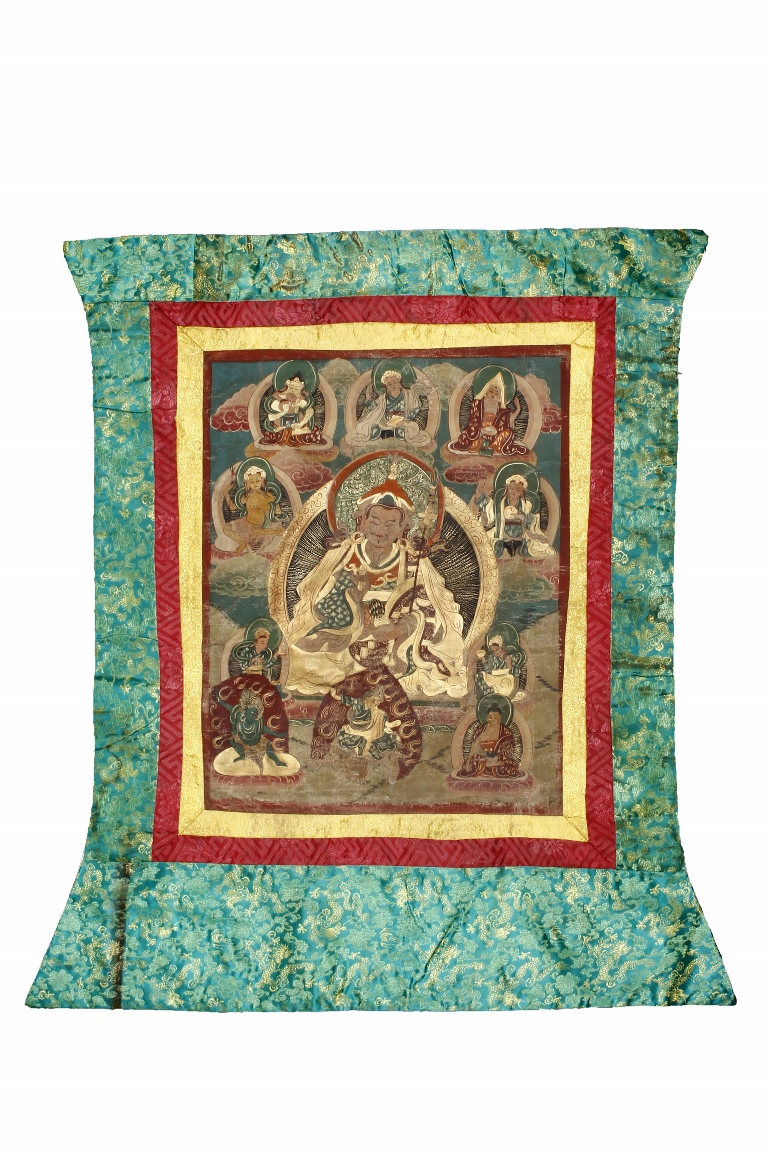 The thangka depicts an guru in a celestial setting surrounding by ten attendants.