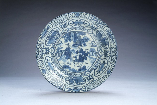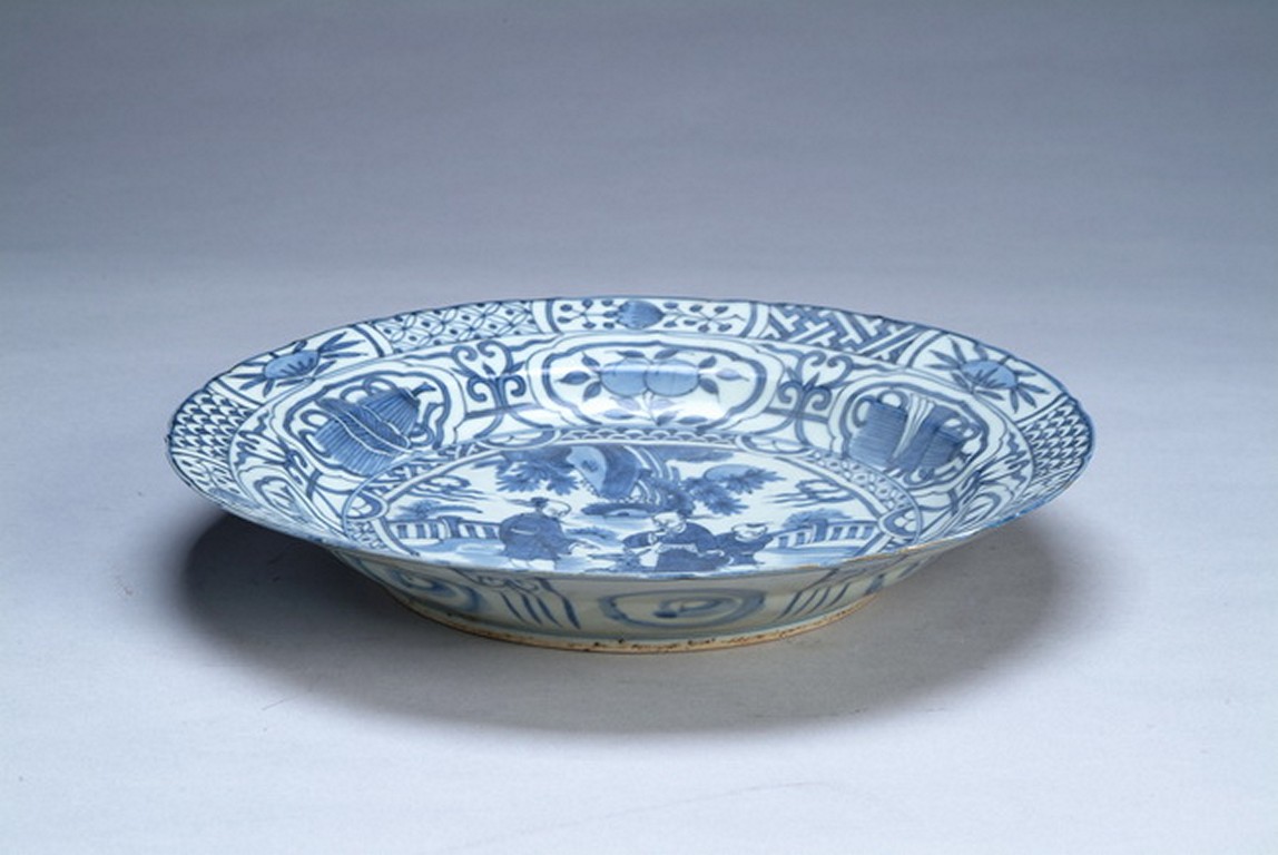 The charger is finely decorated with a figural scene in the center, with alternating auspicious motifs around the sides.