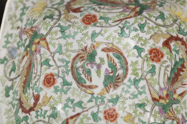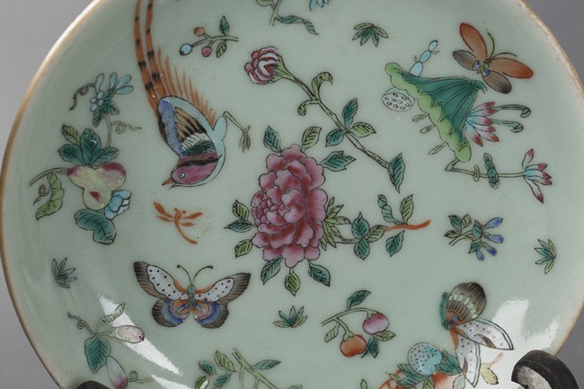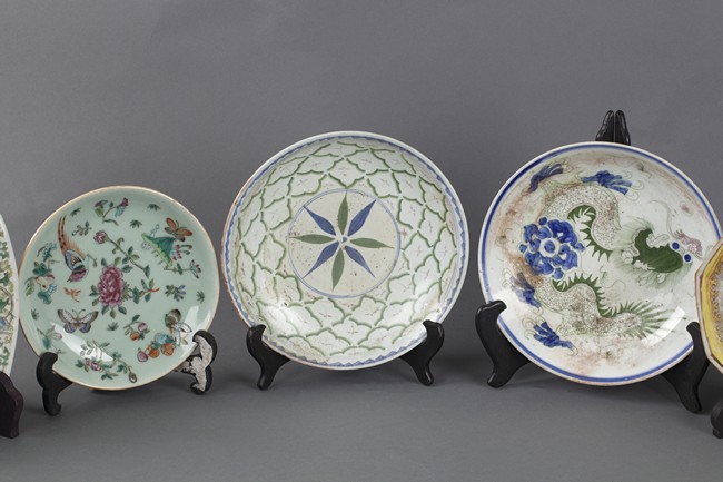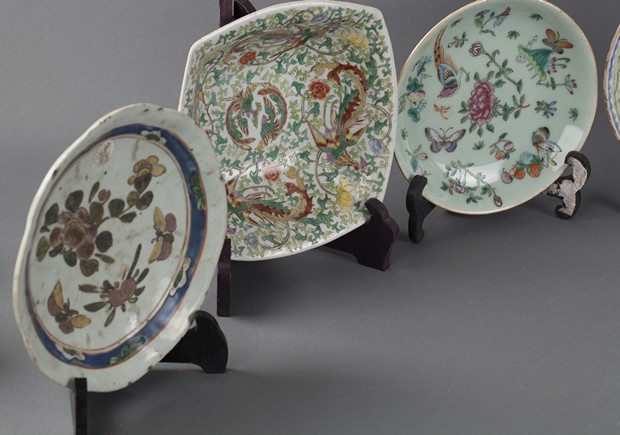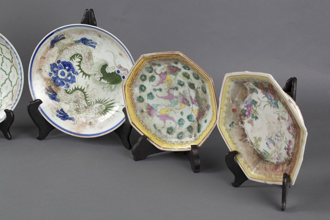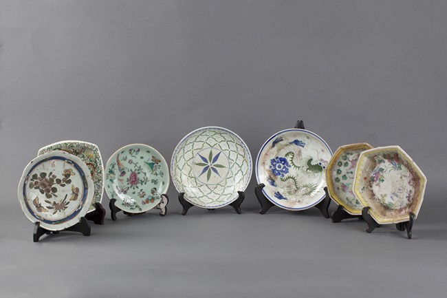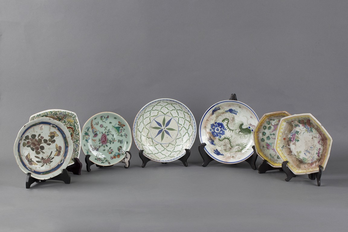 These seven porcelain dishes are decorated with unique patterns and colors, mostly with flowers, birds, dragons, and prosperity themes.