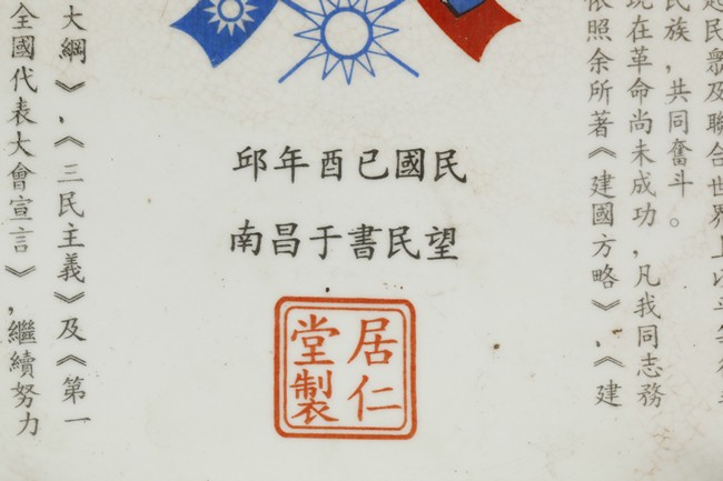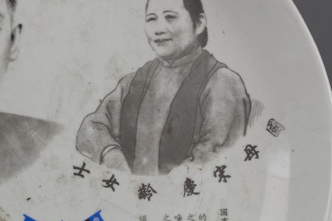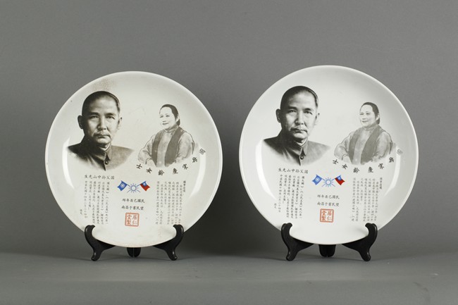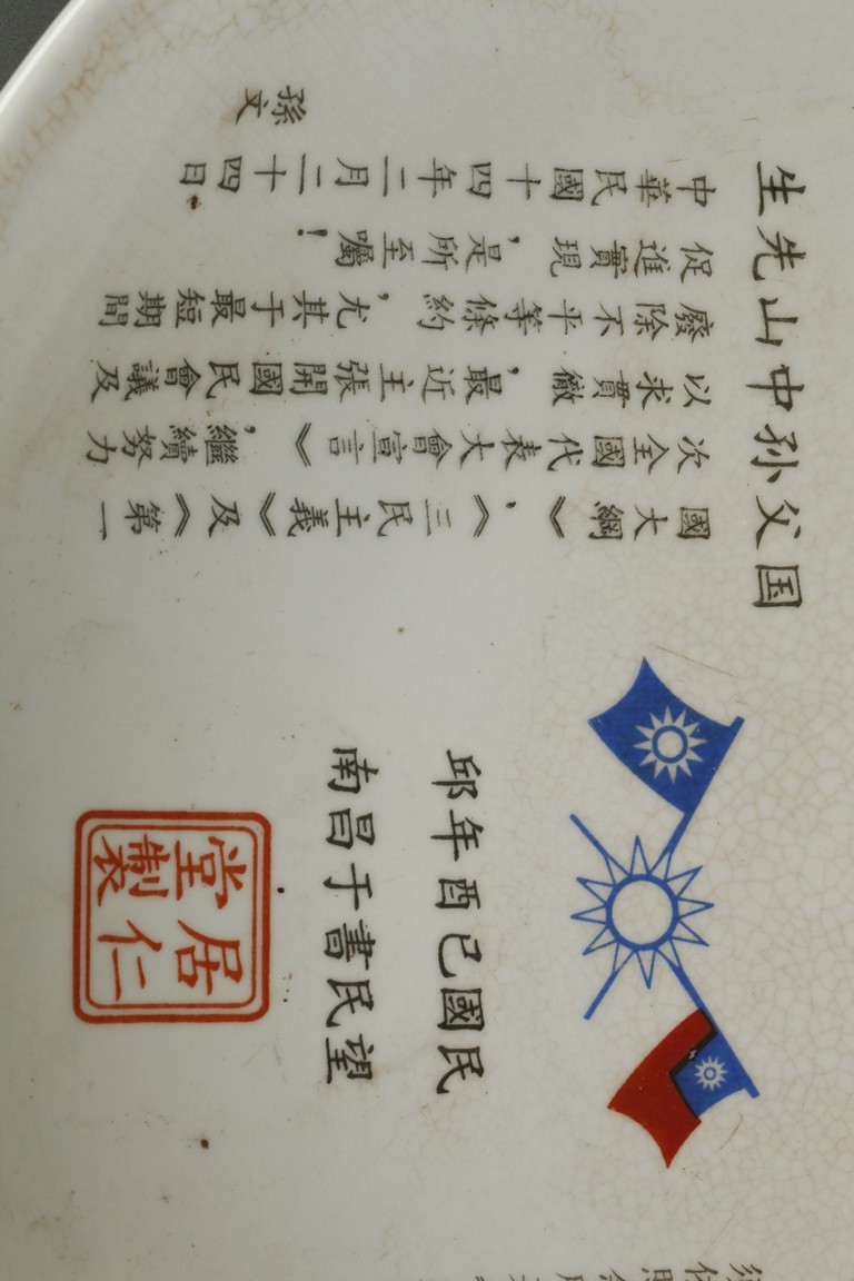 A pair of porcelain dishes honoring SUN YAT-SEN and his wife. One dish is of white ground, while the other dish is of crackled ground. Artist seal on the front.