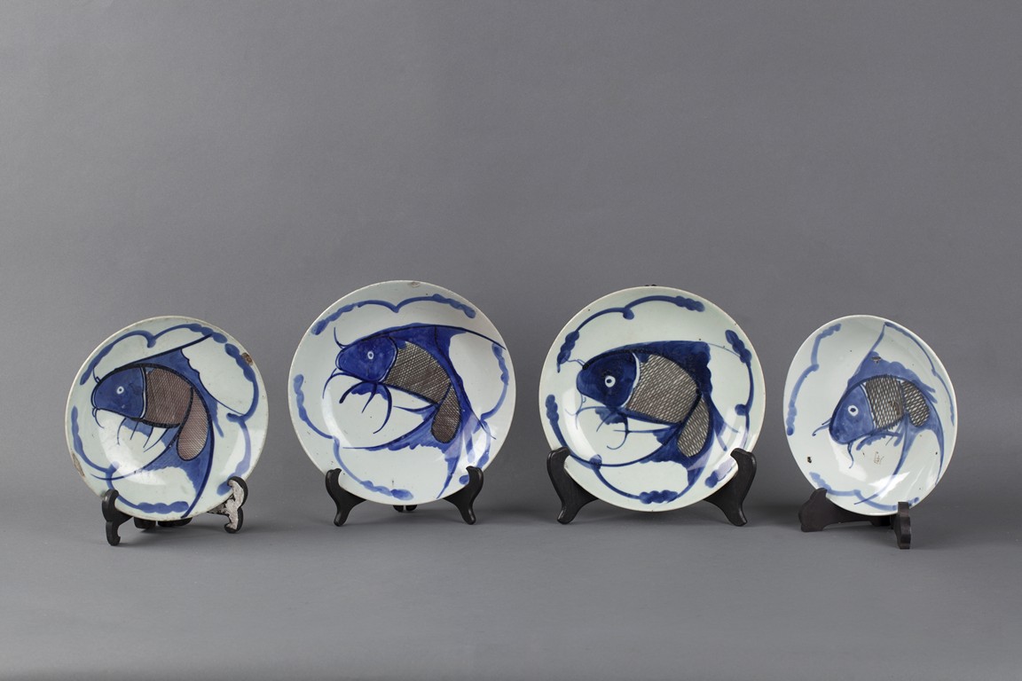 A set of four blue and white dishes depicting a carp in turning motion, each with its own stand and different marks on the back.