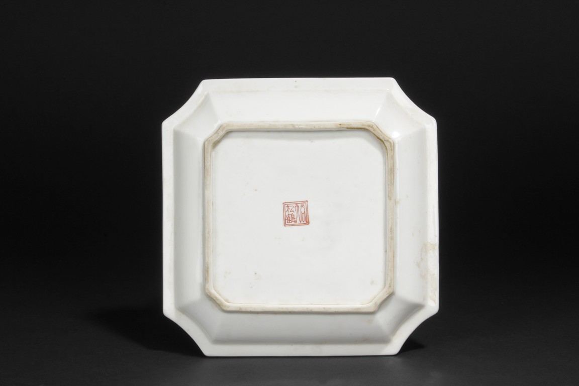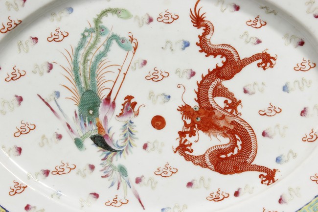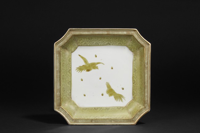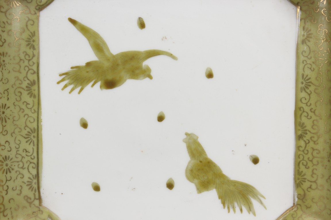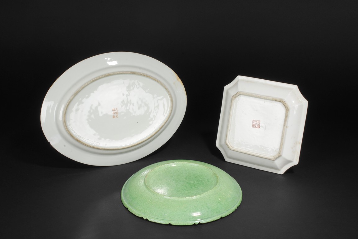 A group of porcelain dish of oval, square and circular shape, one dish with famille rose dragon and phoenix, one dish with celadon glaze, and the one dish with birds over underglazed green.