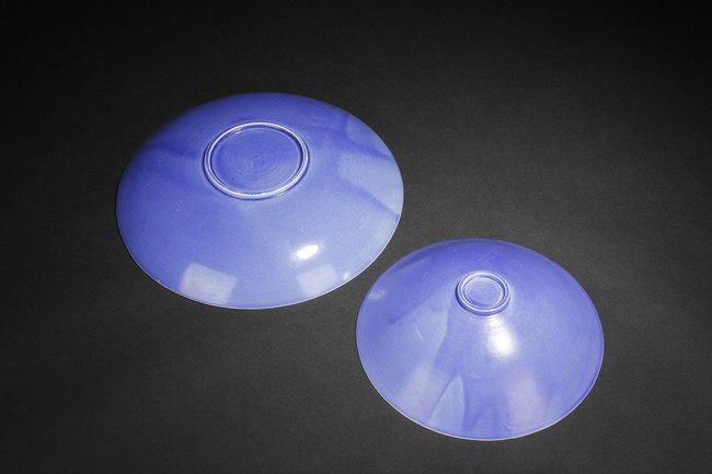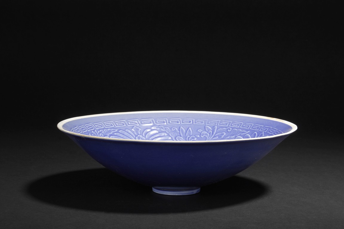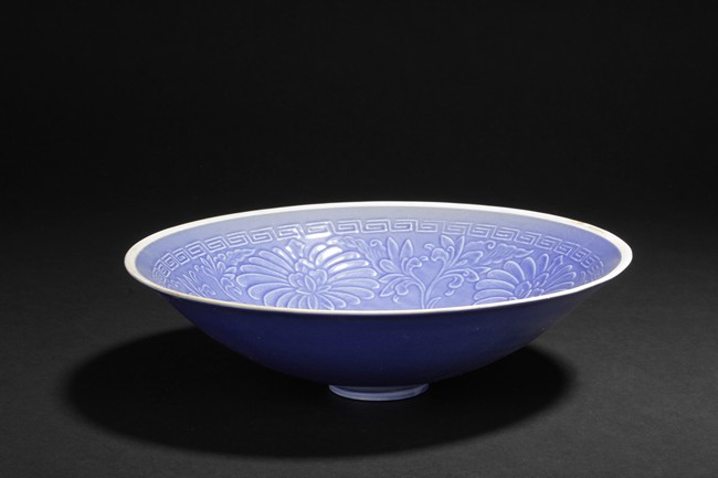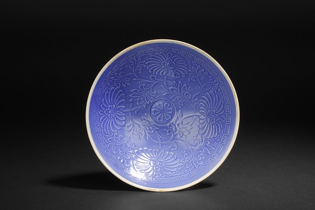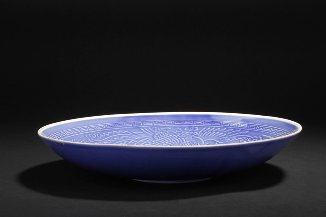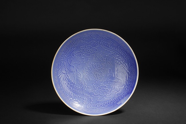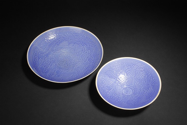 One of the dishes is finely molded with designs of chrysanthemums and leaves, the other was molded with design of flowers amidst two flying phoenix, all glazed in blue color.