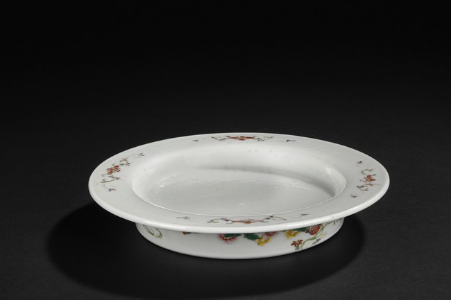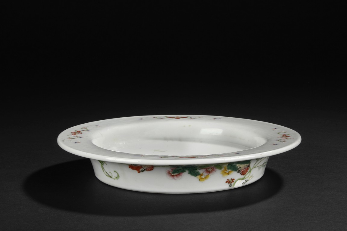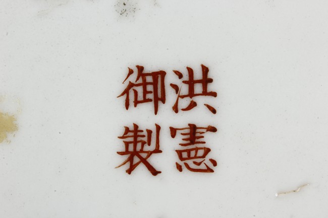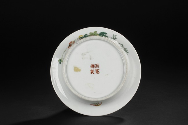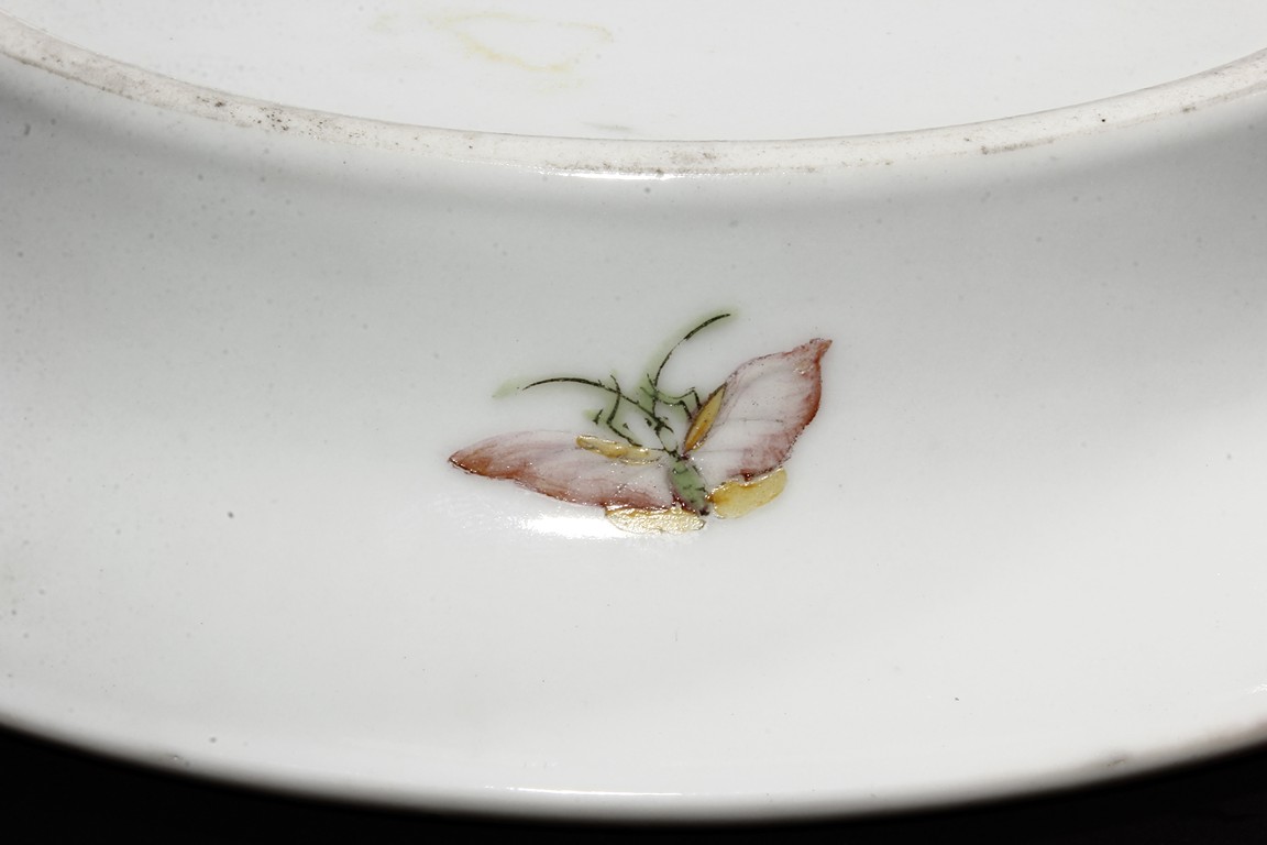 The dish has everted rim, sharply tapering to a straight and shallow body, painted with colorful flowers and butterflies over white glaze, the bottom bears four character mark'HONGXIAN YUZHI'. Republic period.