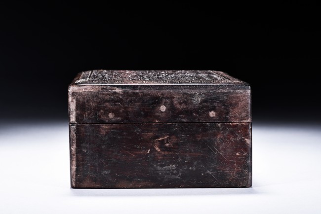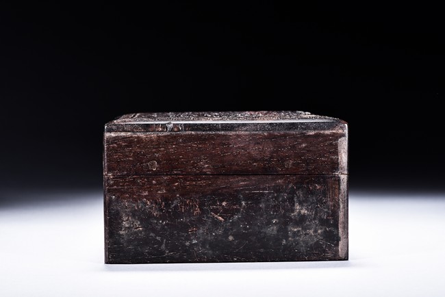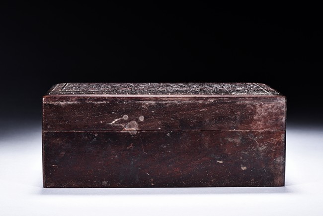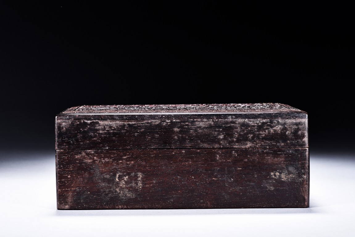 The box is of rectangular shape, the surface vividly carved in relief with cloud and dragon motif.