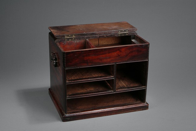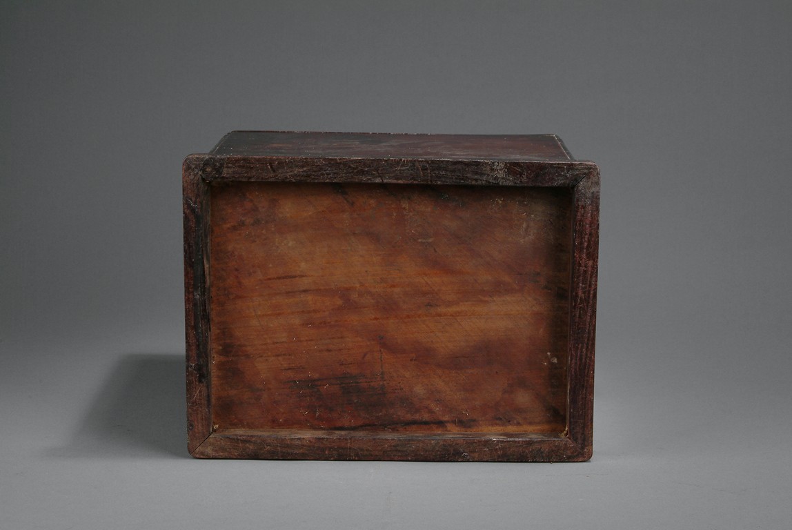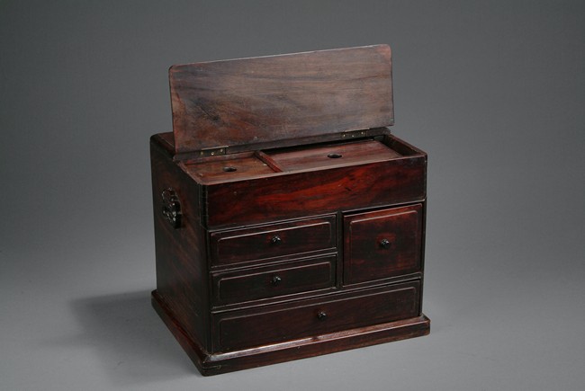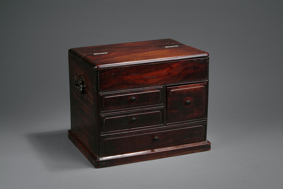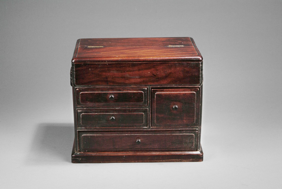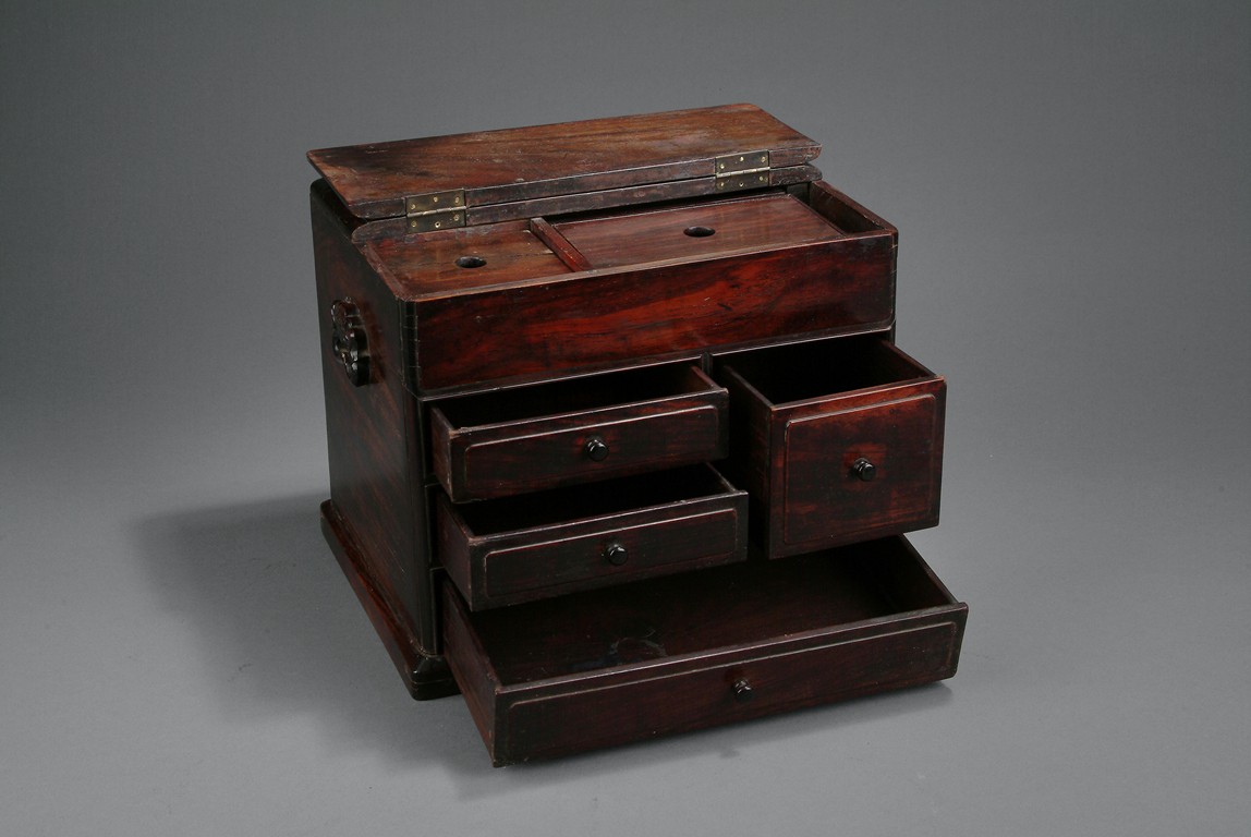 Of rectangular shape, the front of cabinet has four drawers, three rectangular and one square. The top opens to a two-compartment storage, one square and one rectangular. Deep and rich natural color all around, with two handles on the side. 18th century.
