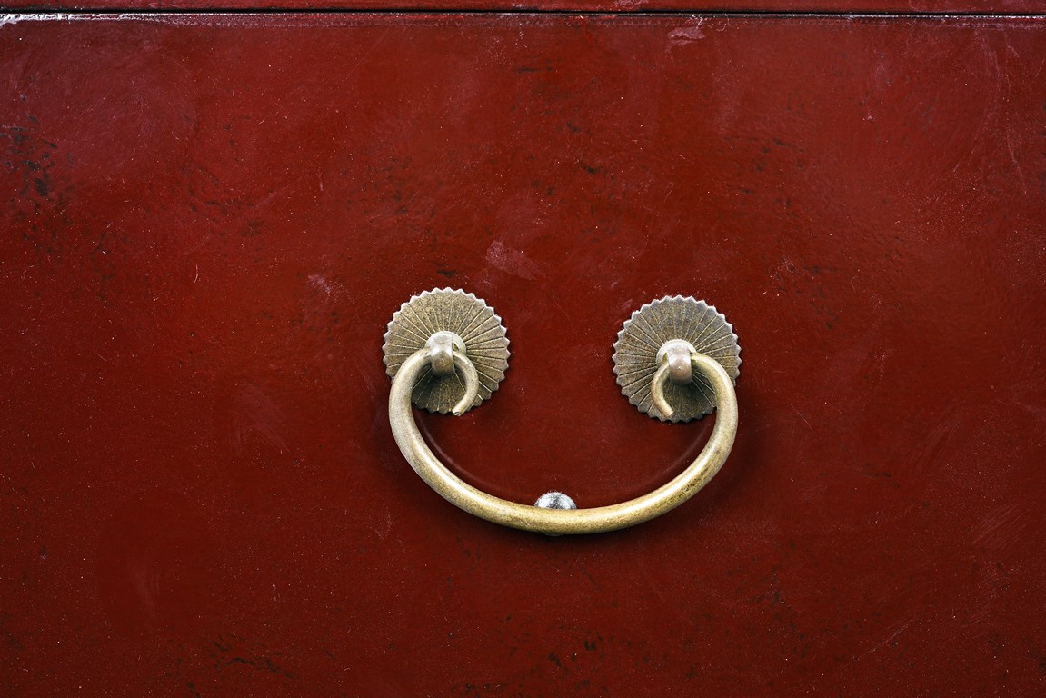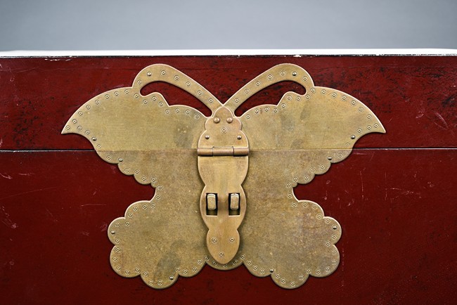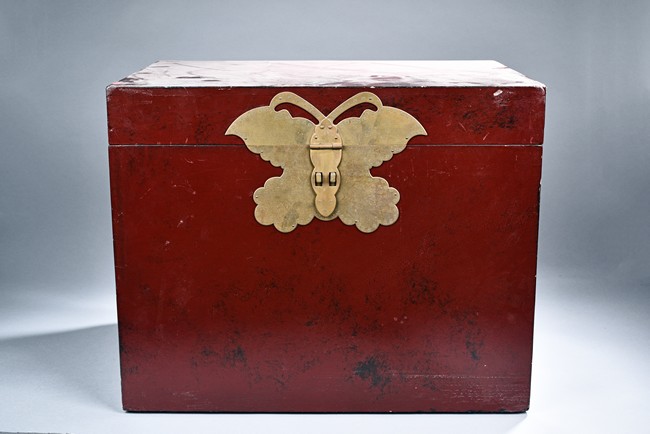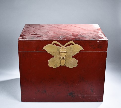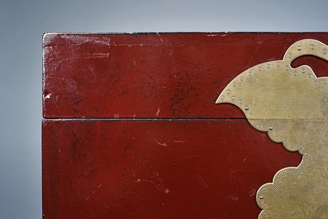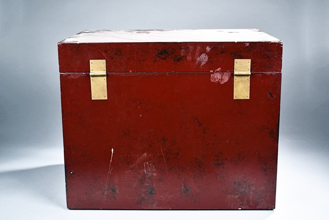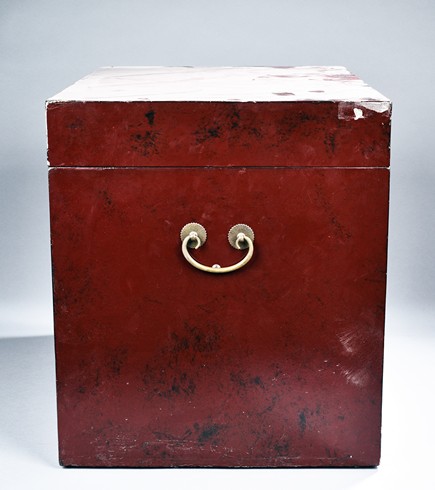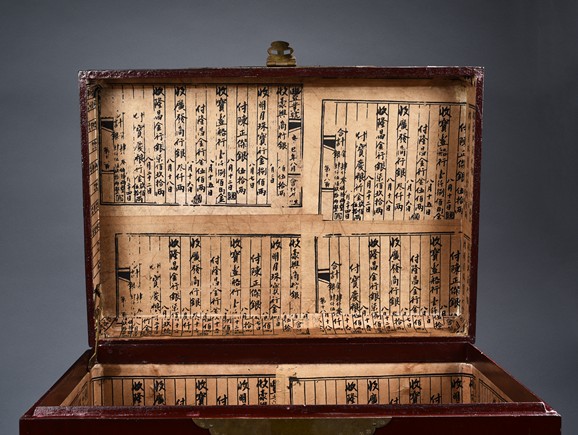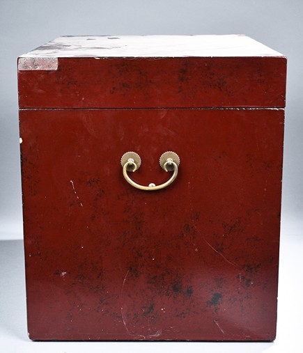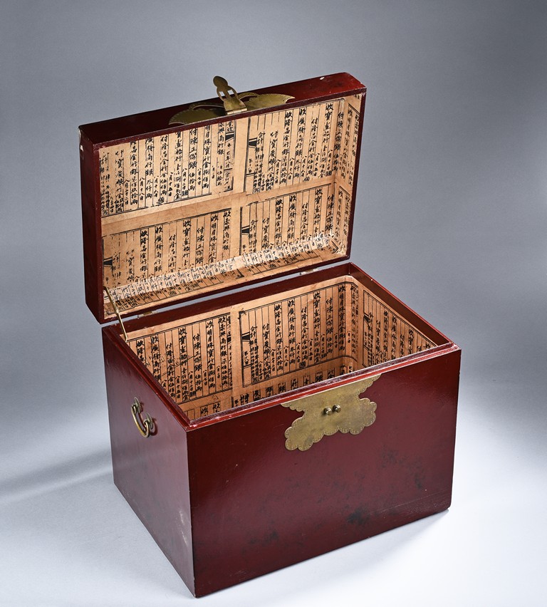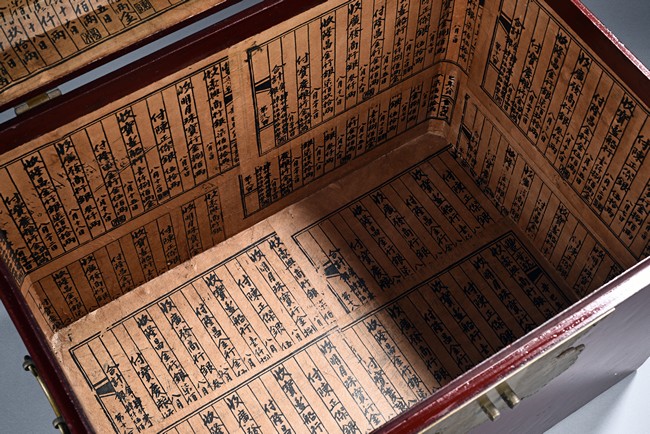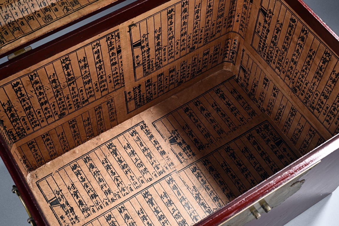 Of rectangular form, the interior covered with inscriptions, the exterior covered with red lacquer.