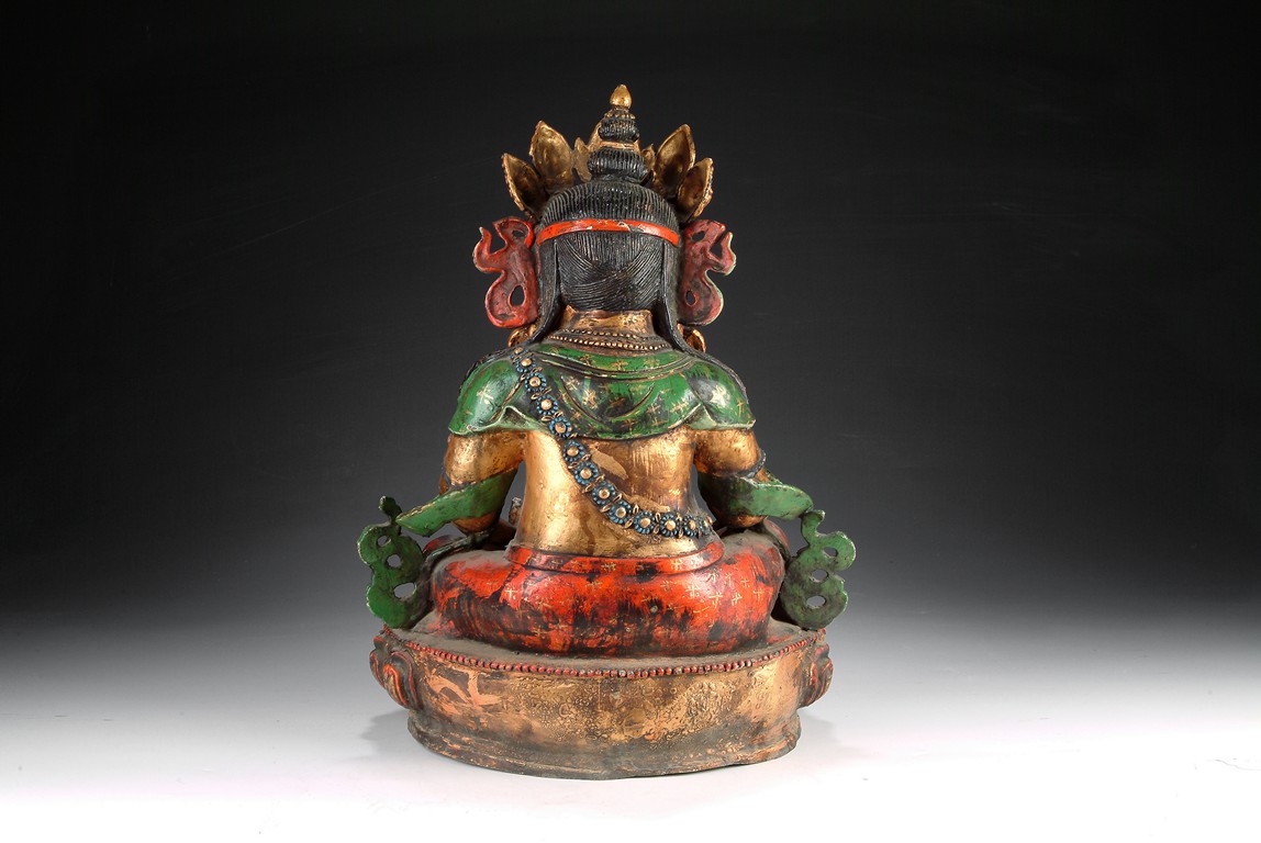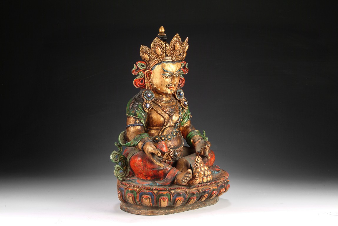This gilt-bronze Tibetan Jambhala is seated on a raised lotus throne, with one foot stretching out slightly. He is dressed in colorful and ornate clothes, complete with decorated headdress, earrings, necklace, and arm bands. He holds a fruit in one hand, while pointing towards a stack of food in front of him with another hand. He has an aggressive look, with upwards eyebrows, wide open eyes, and slight smirk. Qing Dynasty period.