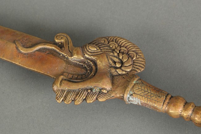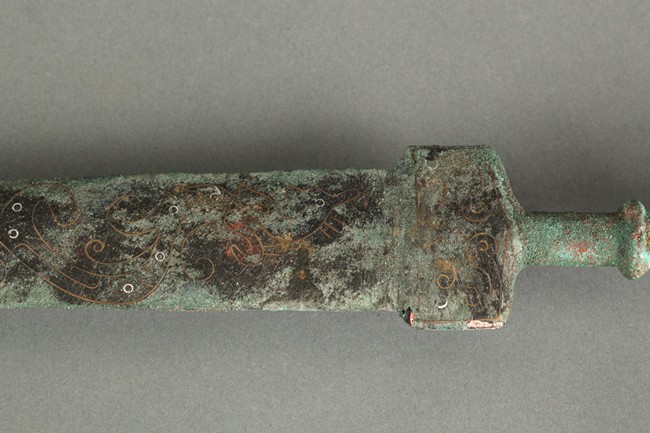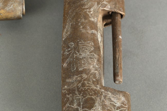 The longer blade has beveled edges and a distinct median ridge, the hilt is cast with two circular flanges below a circular, dished pommel inlaid. The smaller blade has carvings embroidered on it. Accompanied by three bronze locks of various sizes.