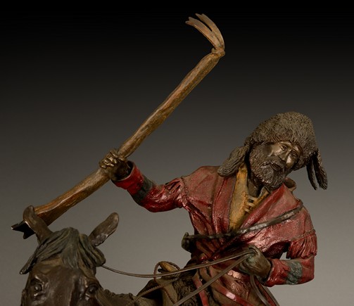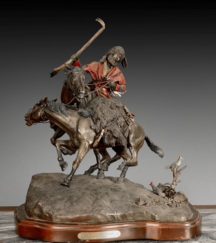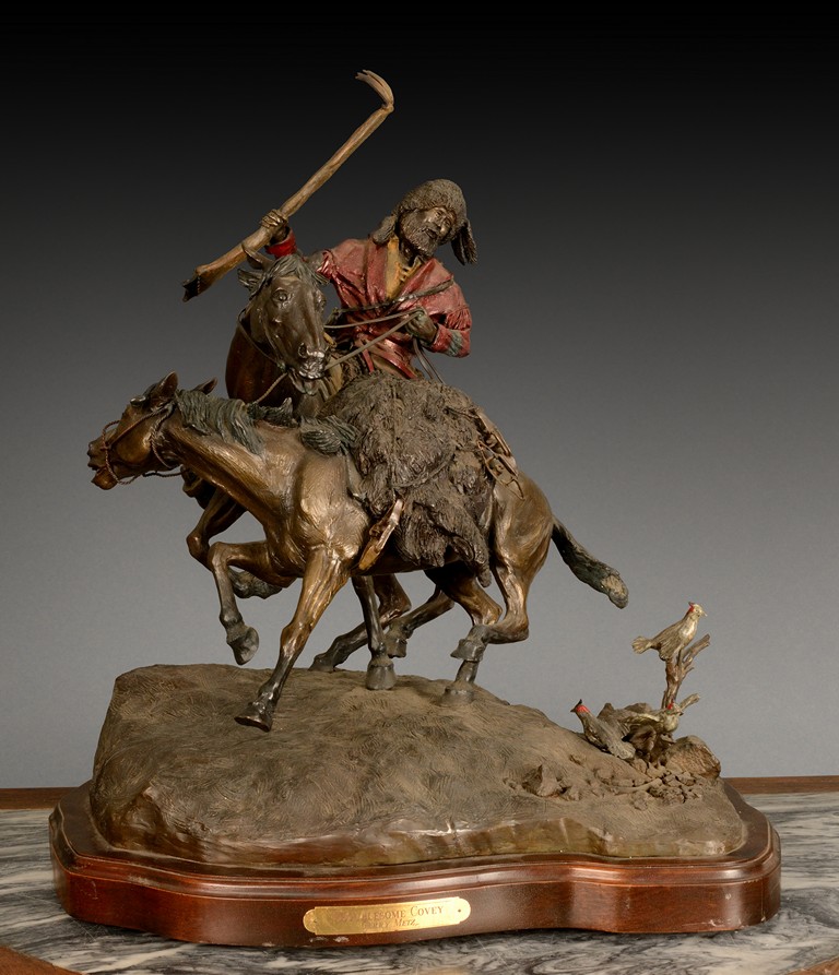 A cast bronze statue group consisting of a hunter on his back and another horse carrying the goods. It is completed with a wood base, which bears a plaque signifying the artist name Gerry Metz, and title of the sculpture as'Troublesome Covey'.