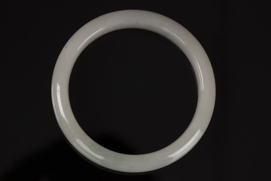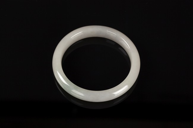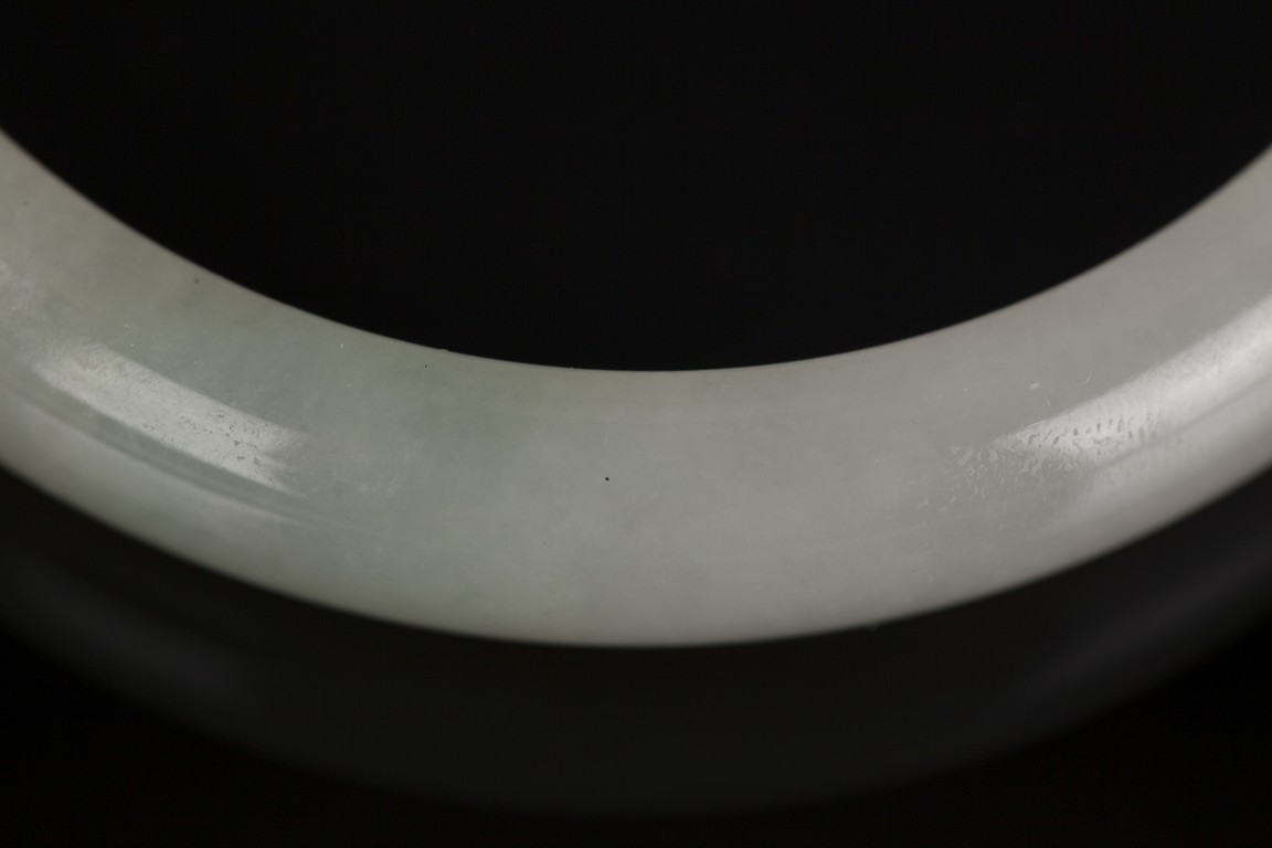 The jade bangle is mostly white and translucent in color, with a hint of emerald green.