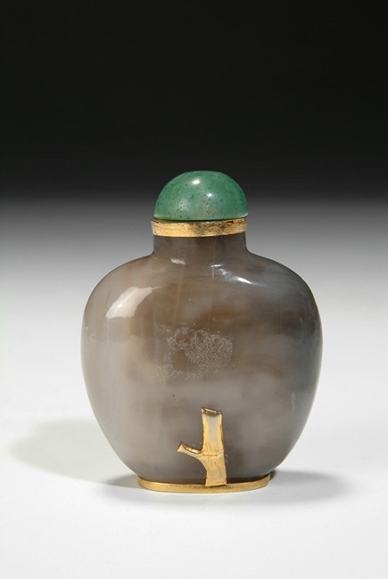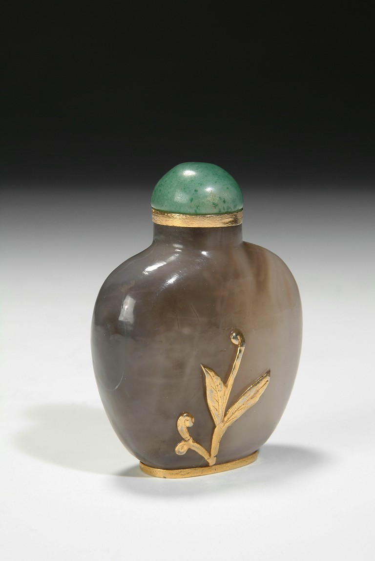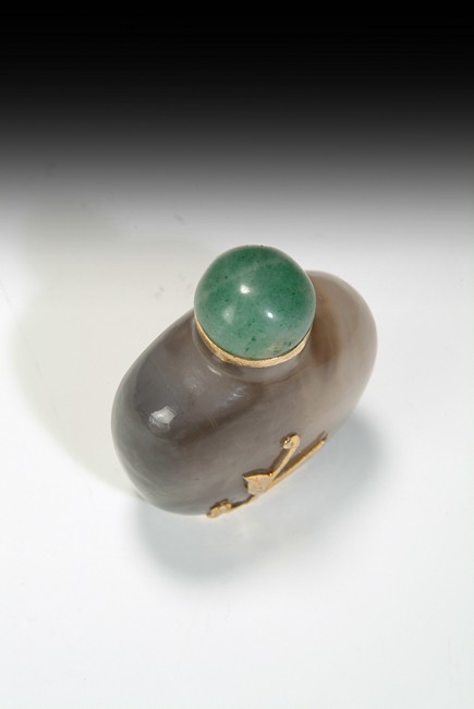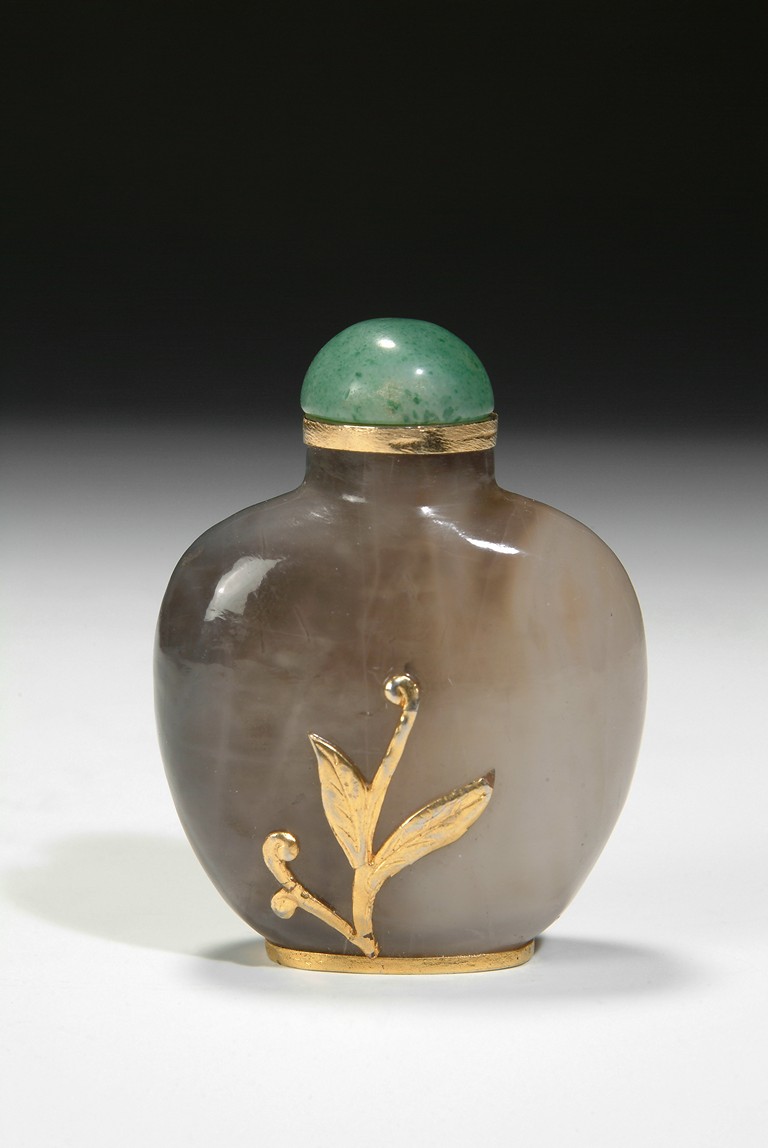 An agate snuff bottle accent with gilt bronze mouth trim and base, topped with a hard stone stopper. Qing Dynasty period.