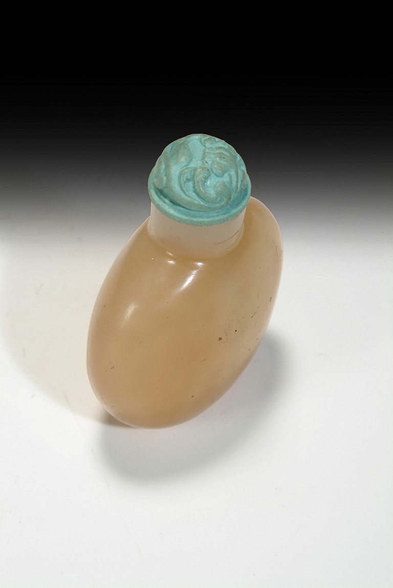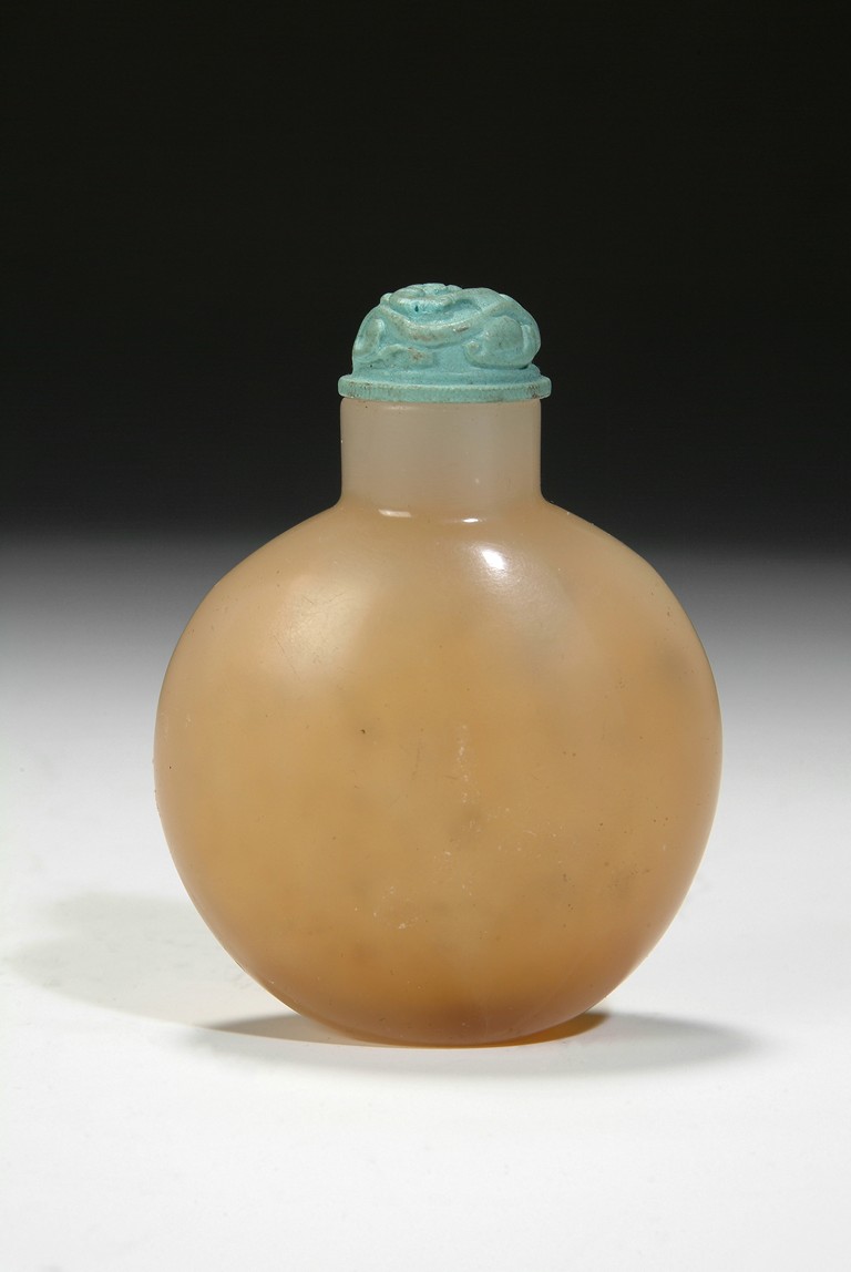 An agate snuff bottle of plain compressed circular form, topped with a turquoise stopper. Qing Dynasty period.