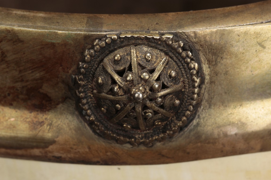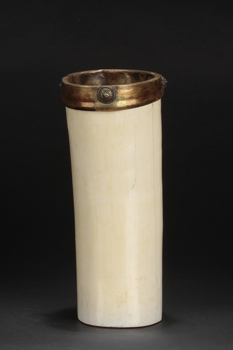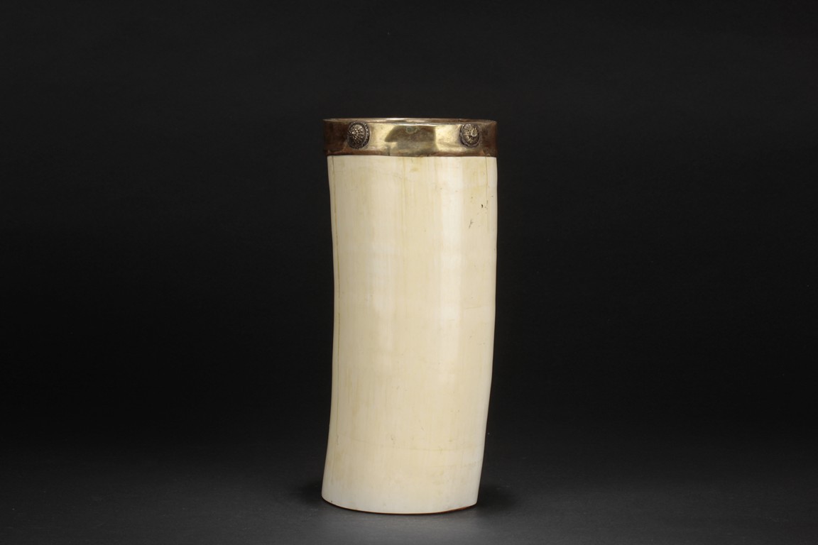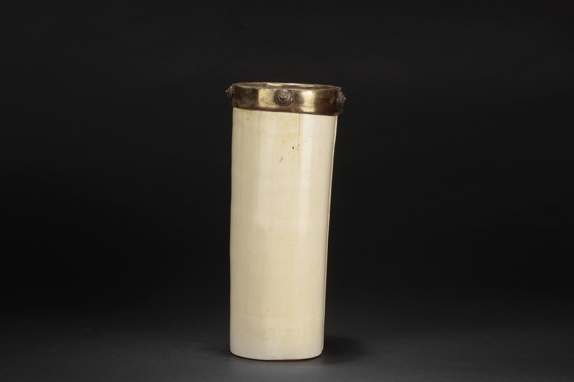 Of curved cylindrical form, the ivory of smooth yellow-white color with excellent age patina, the top mounted bronze enclosures, and the bottom sealed. 19th century.