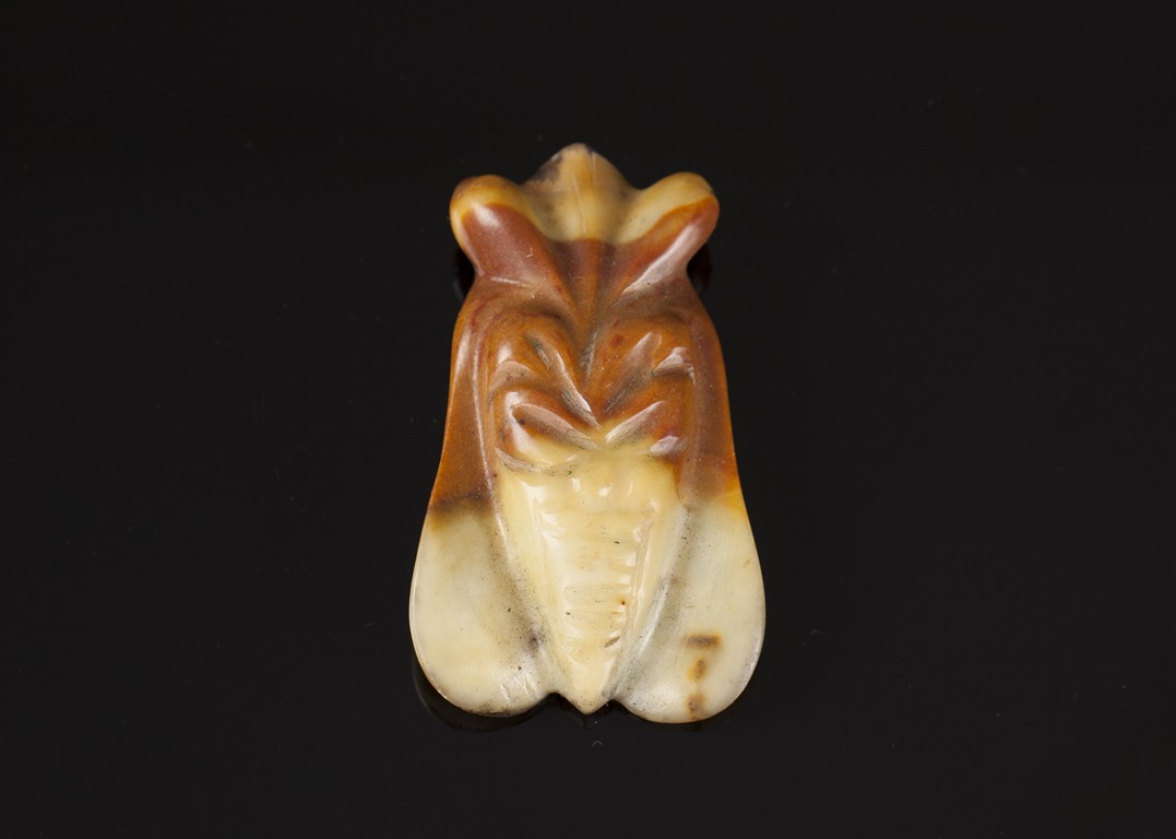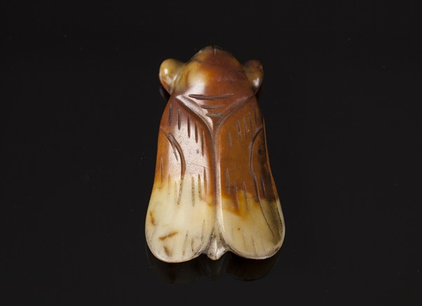 The chicken bone jade carved cicada ornament has its wings closed. Natural brown patches of color is present.
