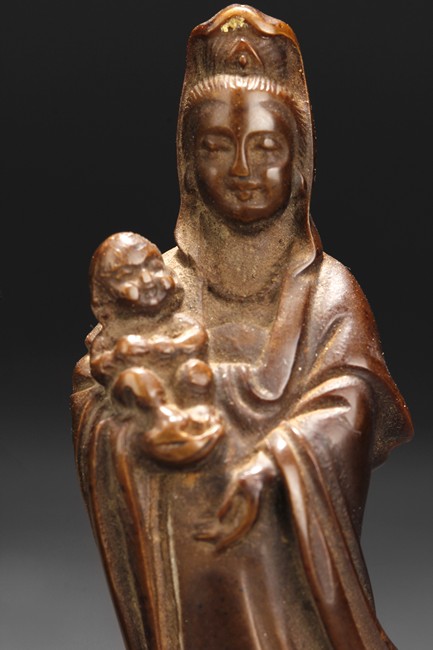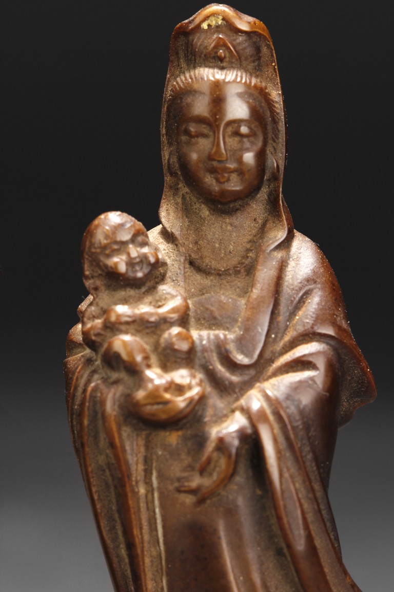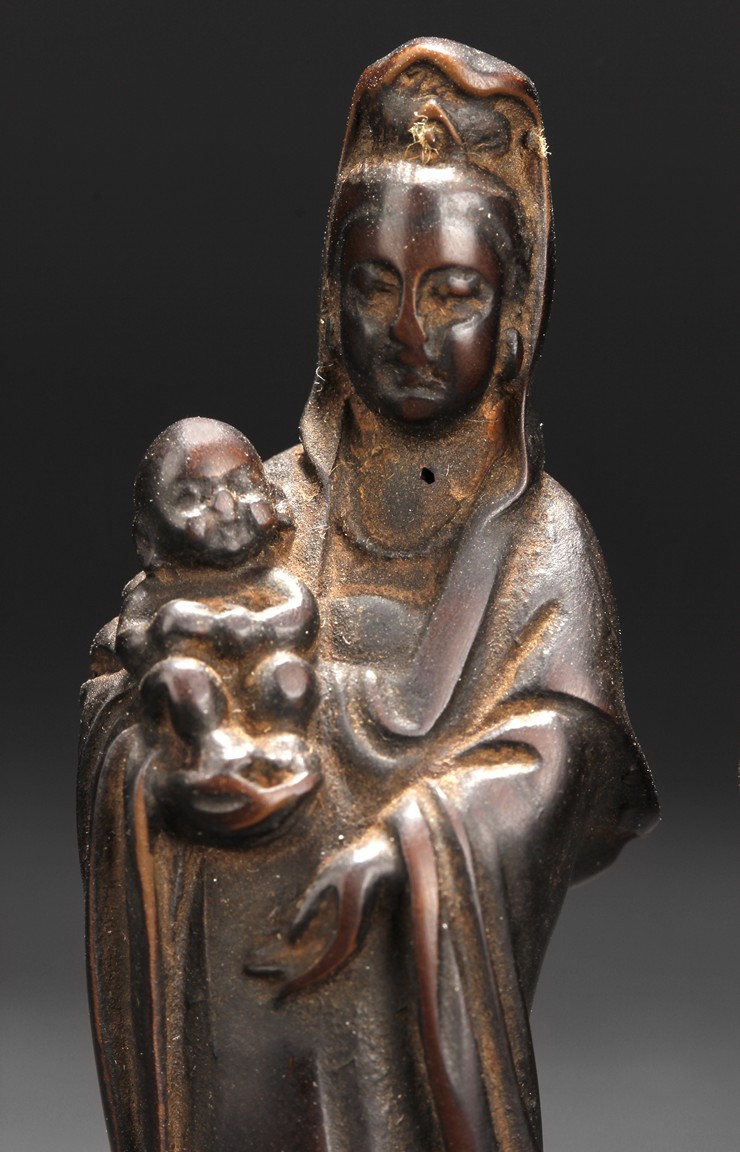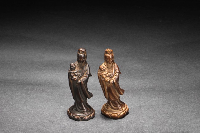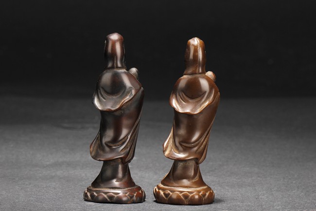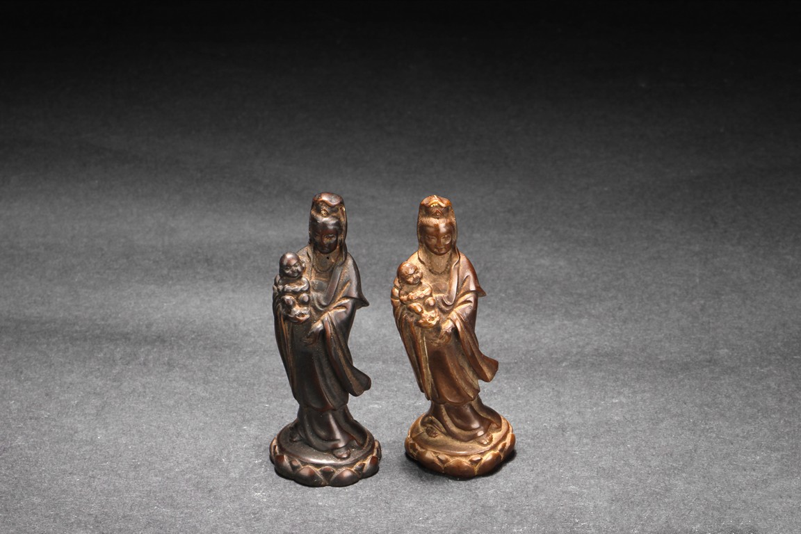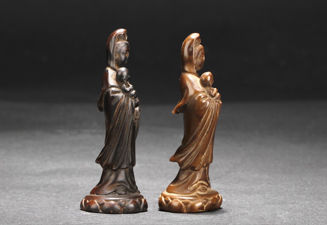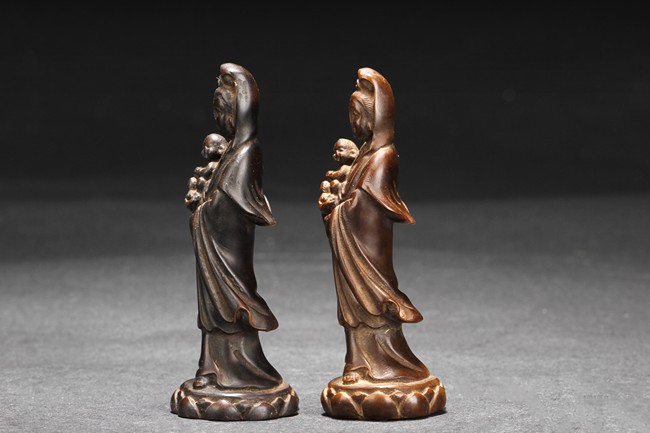 The two Guanyin figures are almost identical in design, both stands on a lotus pad, with one hand holding a baby, symbolizing fertility. One Guanyin with brown color, the other with deeper brown-black color.