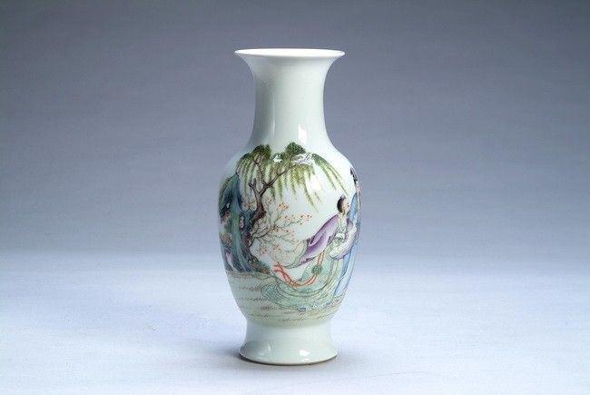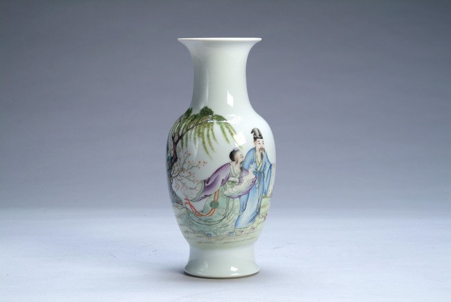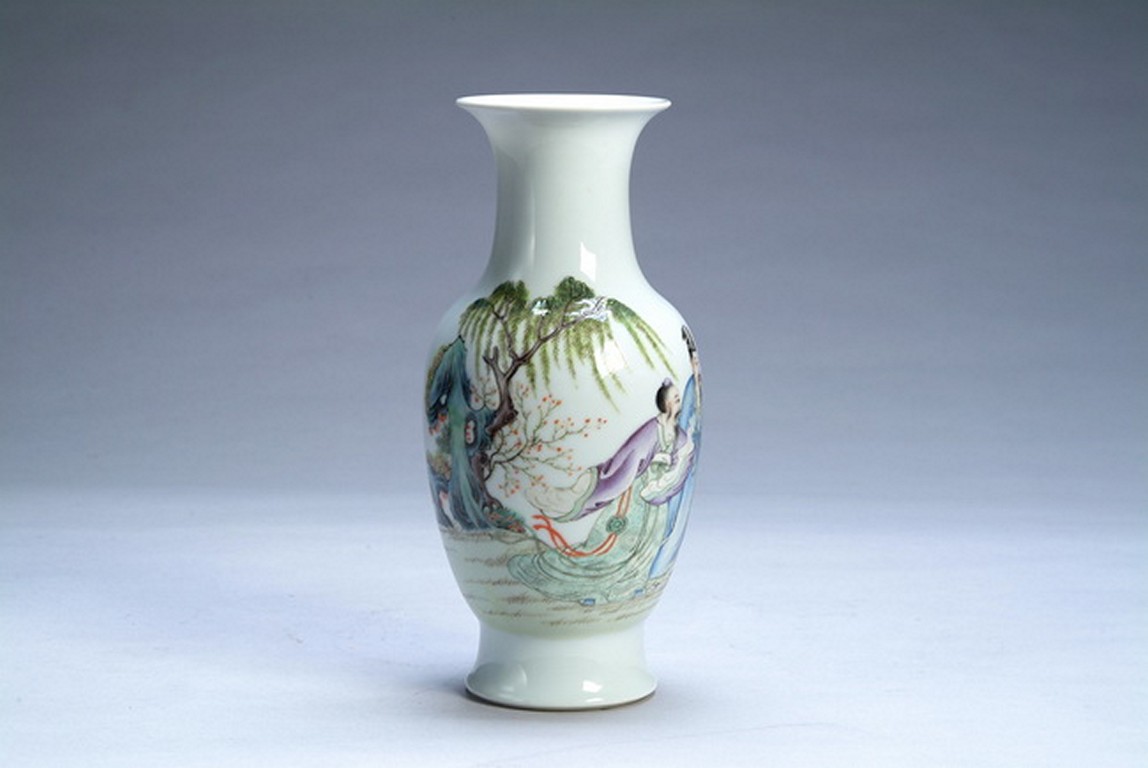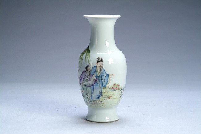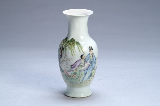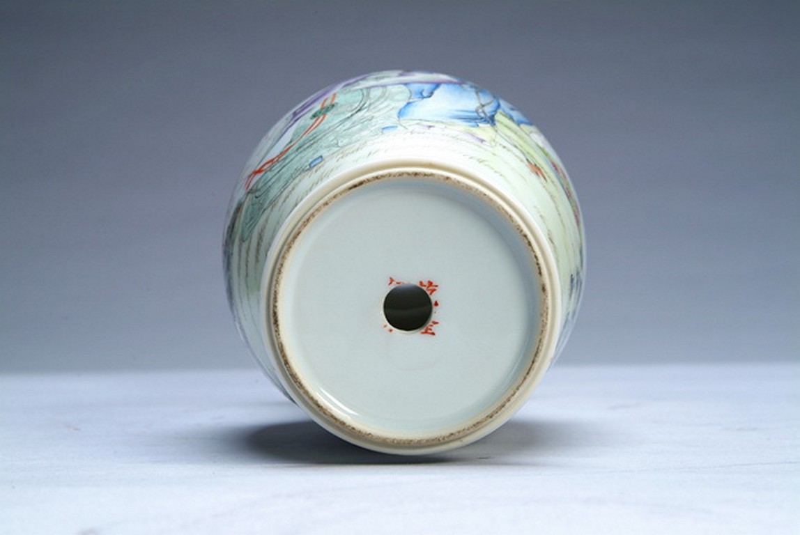 Finely painted with two scholars in a garden scene. The bottom bears a four character Qianlong mark with a hole.