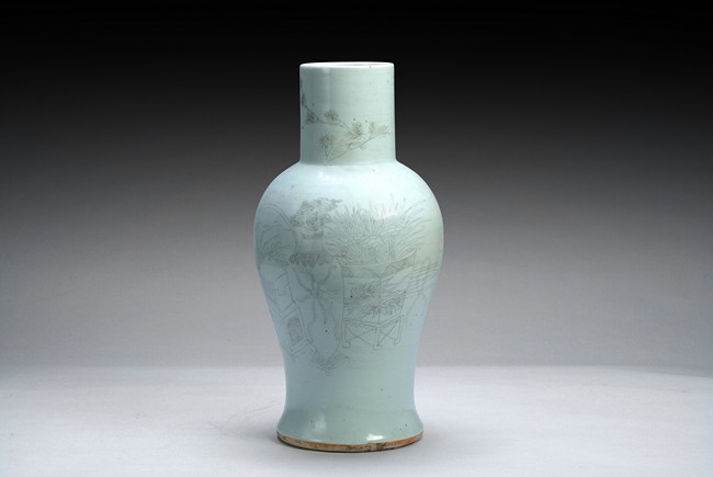This well-glazed flower vase is a tinted blue color with drawings in the front and Chinese characters in the back.