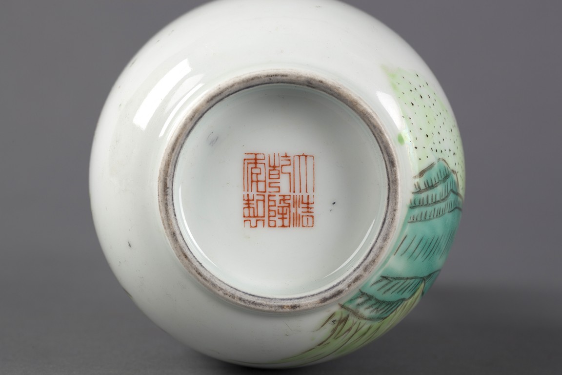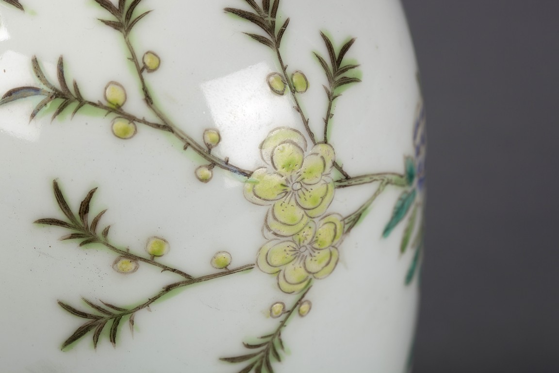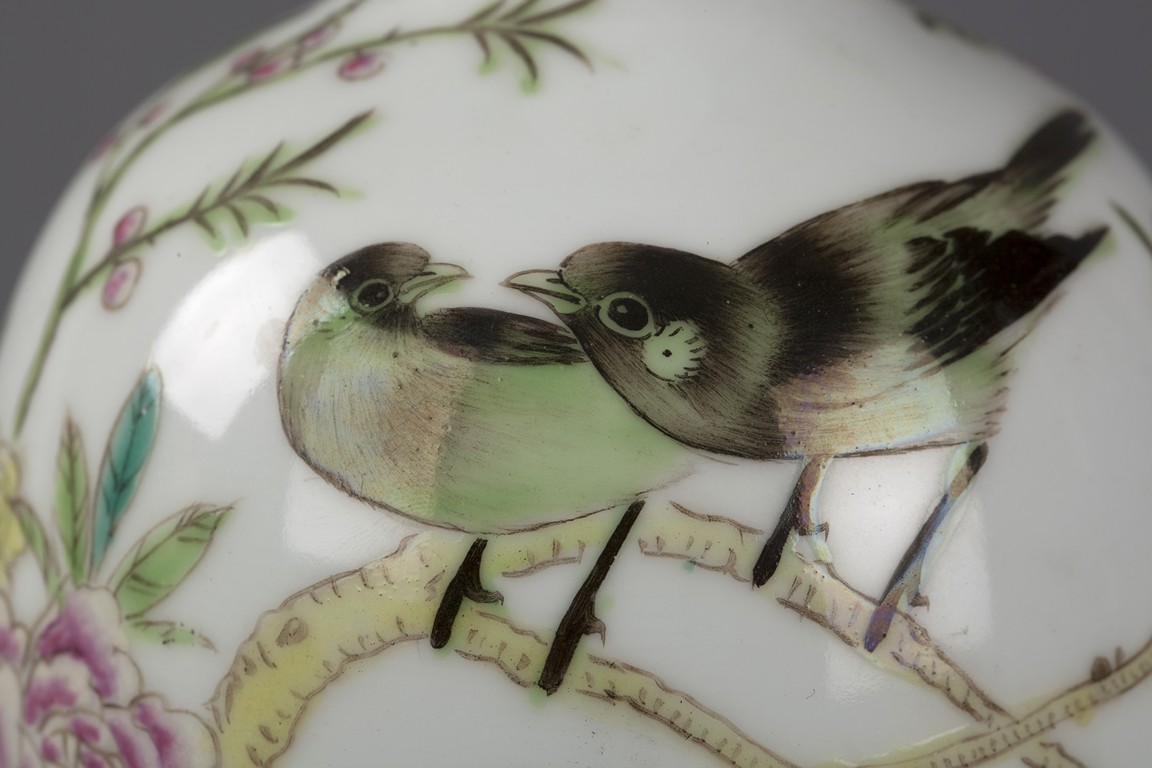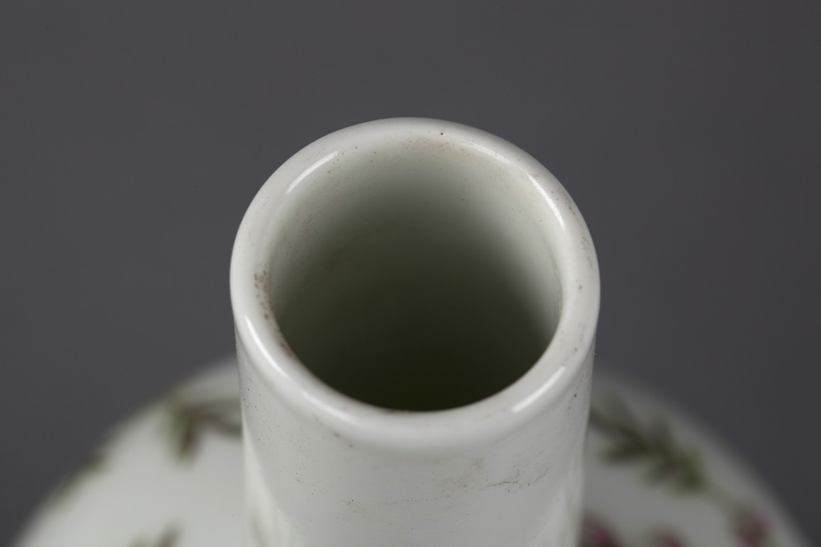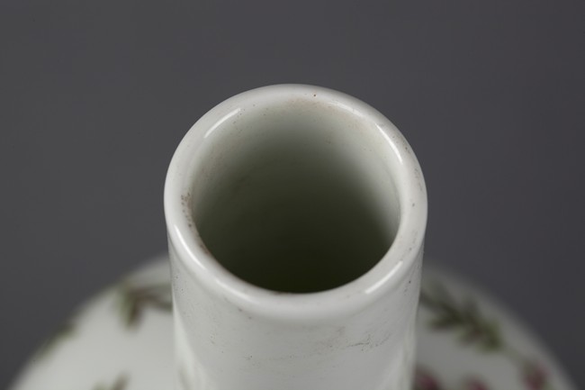 The famille rose vase is painted with two magpies perching on flower branches, with blooming peony flowers around them. The body is of cylindrical form that rises to a long neck and completed in a shallow rim. Bottom bears six character'QIANLONG' mark.