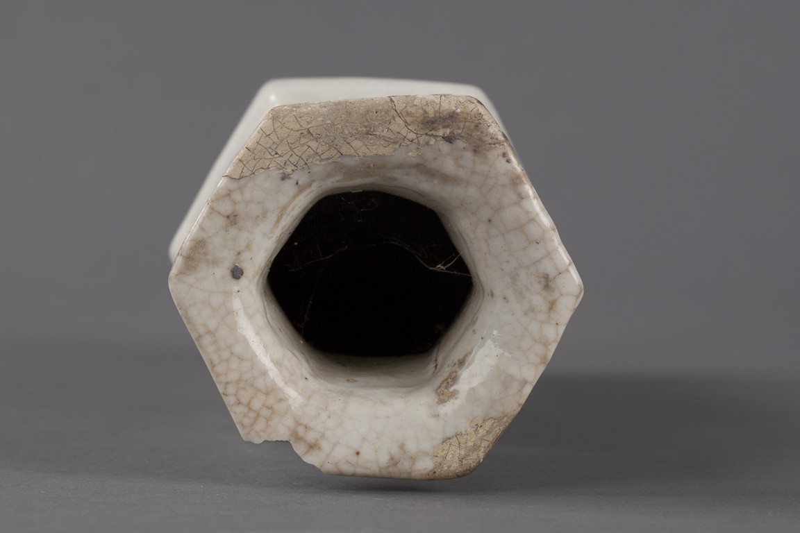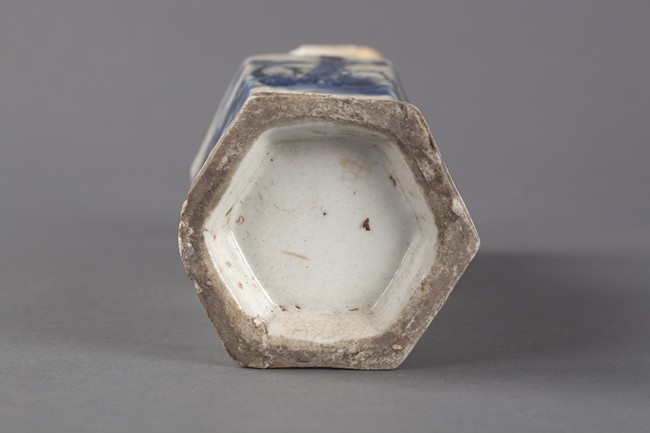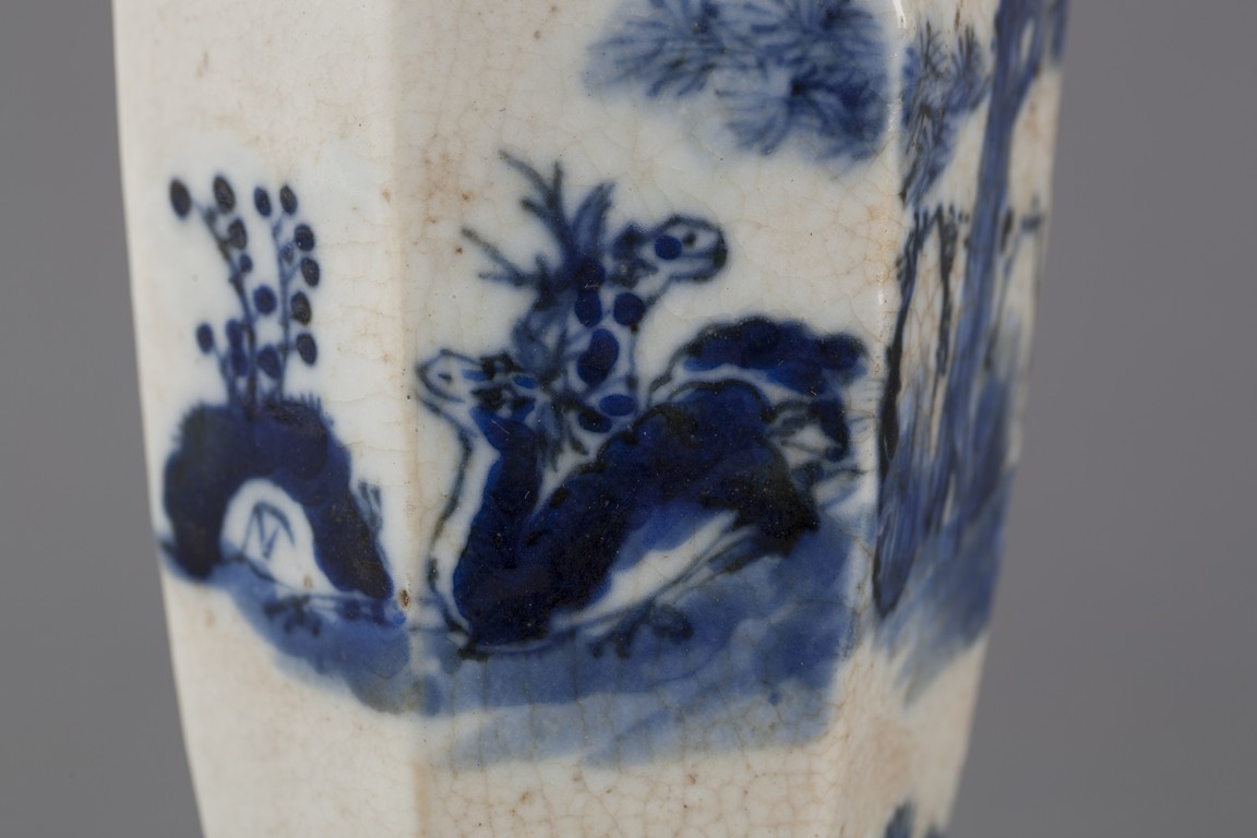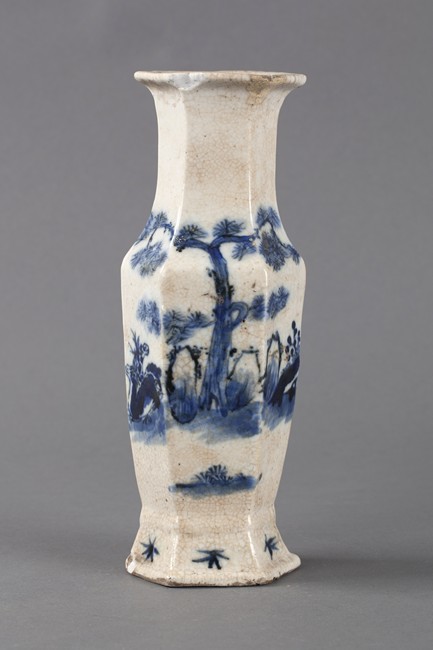 This blue and white ceramics vase is painted with a scene of a forest all around. The vase is a hexagonal shape with the mouth and the base being equal in size.