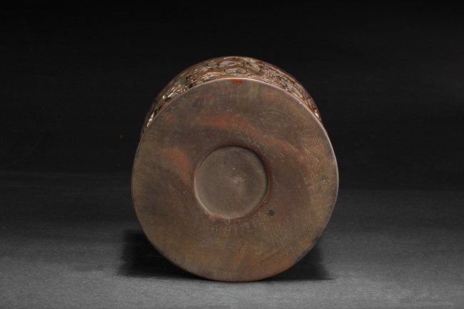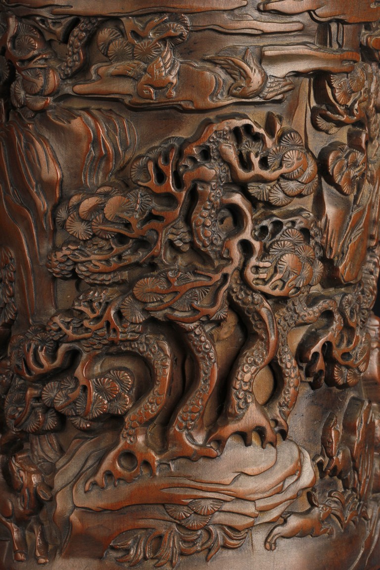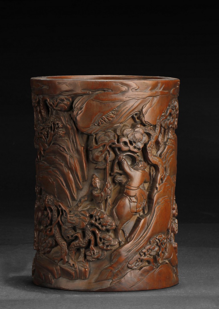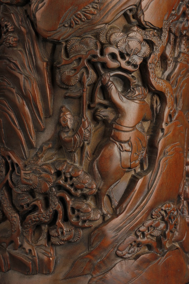 Of cylindrical form, lightly concave inward, the exterior low relief carved with a hunting scene, with horse riders and their attendants amidst dense forest near mountains, hunting for games such as rabbit and birds. 19th century.