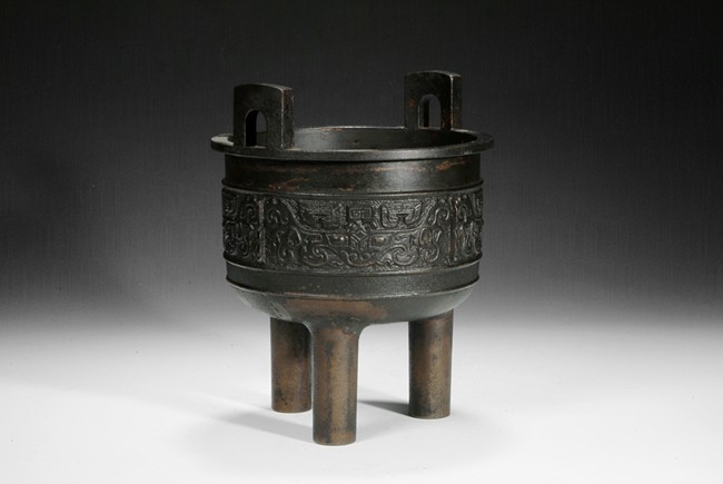 A Gui form tripod censer, with a wide rim, and raised on three long legs, and there is a pair of loop handles that issue from the rim. The body is well cast with a continuous pattern of Taotie masks. The bottom is plain with patinated with green and red patina. Qing Dynasty period.