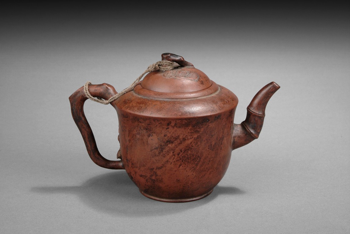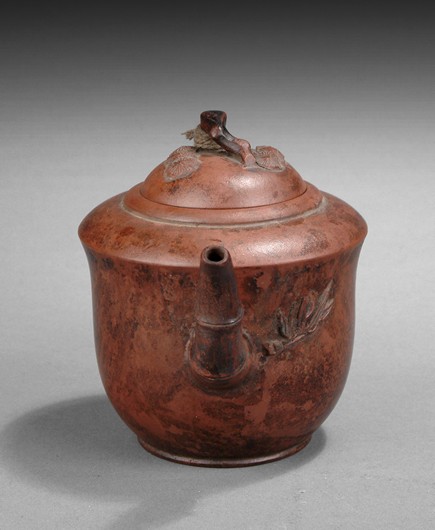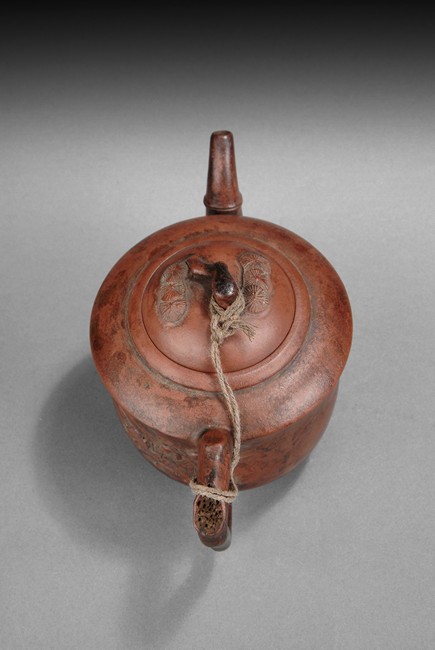 Finely potted and well hollowed, the teapot's body depicts plum tree and orchid, the pouring mouth, handle, and finial depict bamboo, and the cover depicts chrysanthemum, symbolizing Four Gentlemen, or four seasons. Bottom bears four character artist mark'ZHOU FAXIANG'.