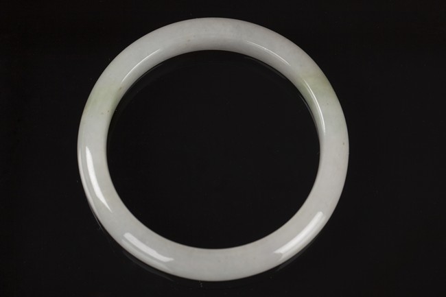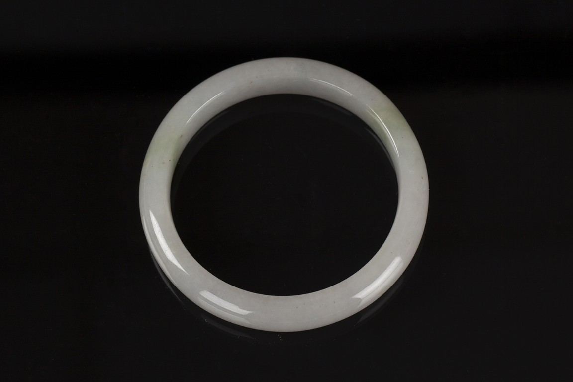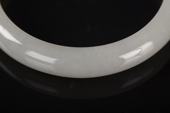 The smooth bangle is of a white color suffused with hints of tinted green and magenta.