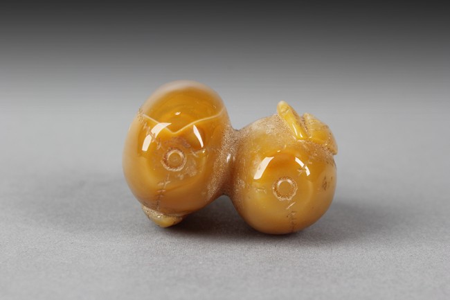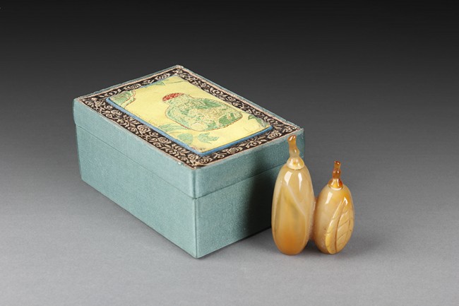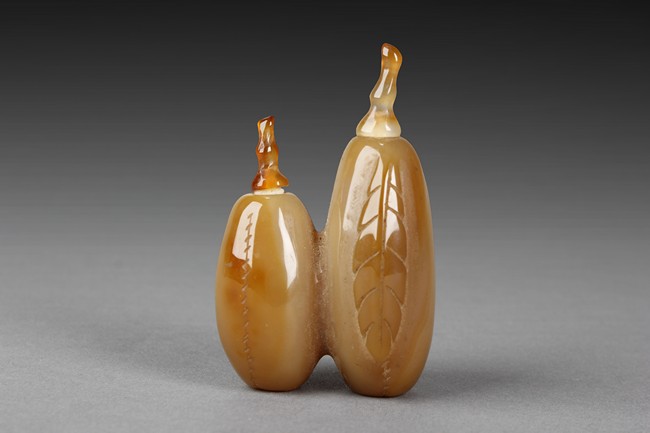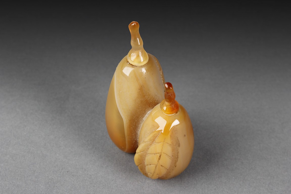 Of ovoid form, one agate snuff bottle taller than the other, both carved similar to fruit with branch-like stopper, and a banana leaf on the side; stone of brown-white color, with slight transparency. Includes snuff bottle container. Qing Dynasty period.