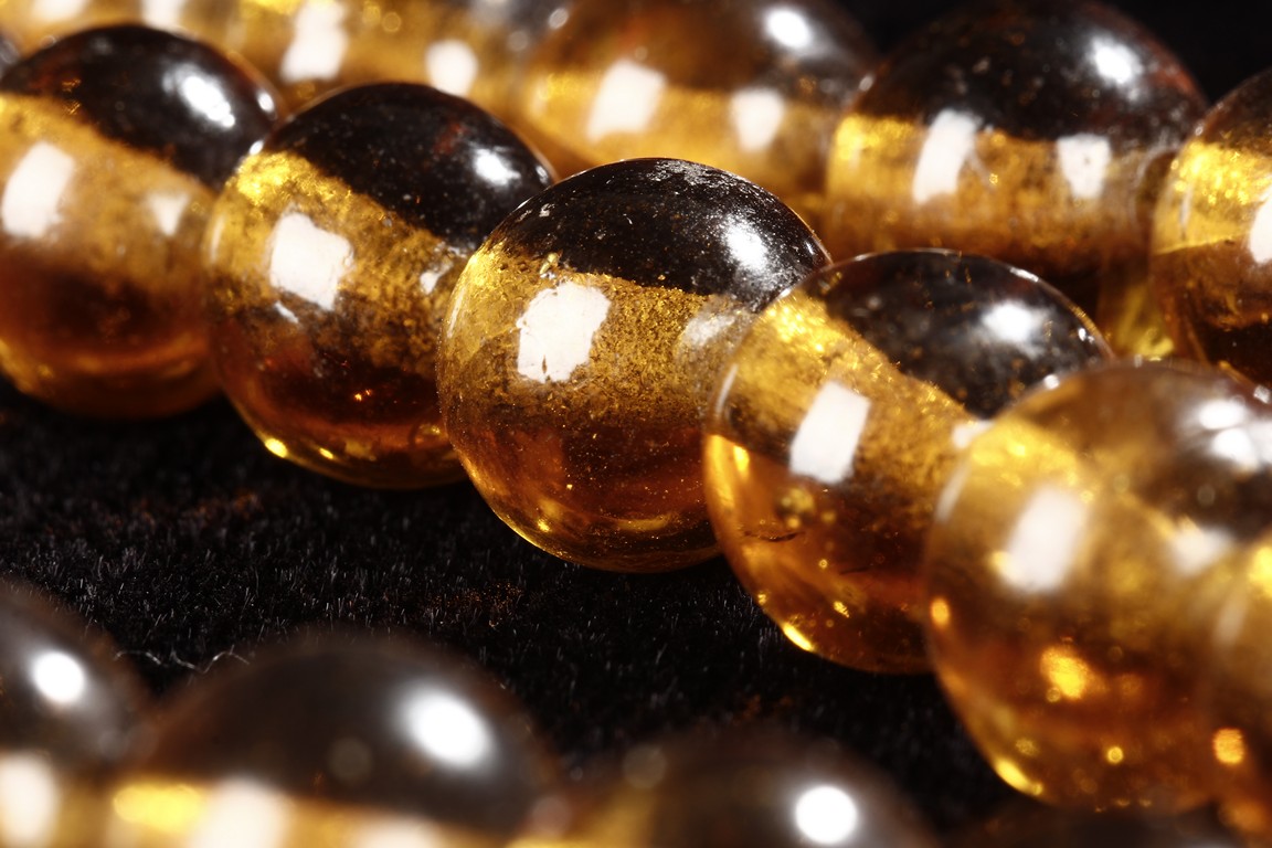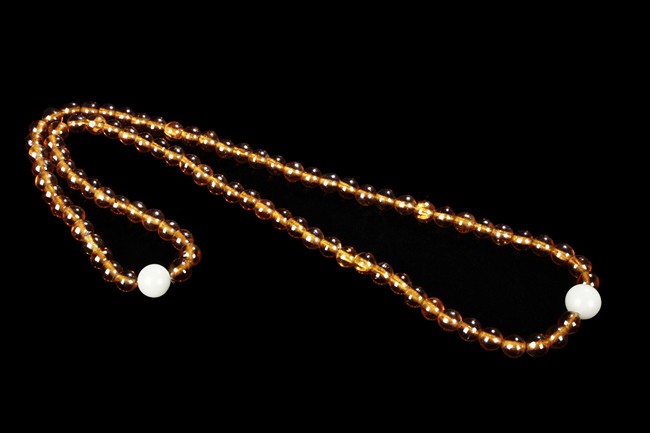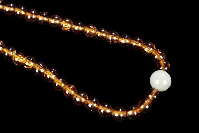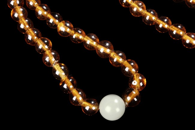 The strand of amber prayer beads include 88 similar sized amber beads, and two larger white beads.