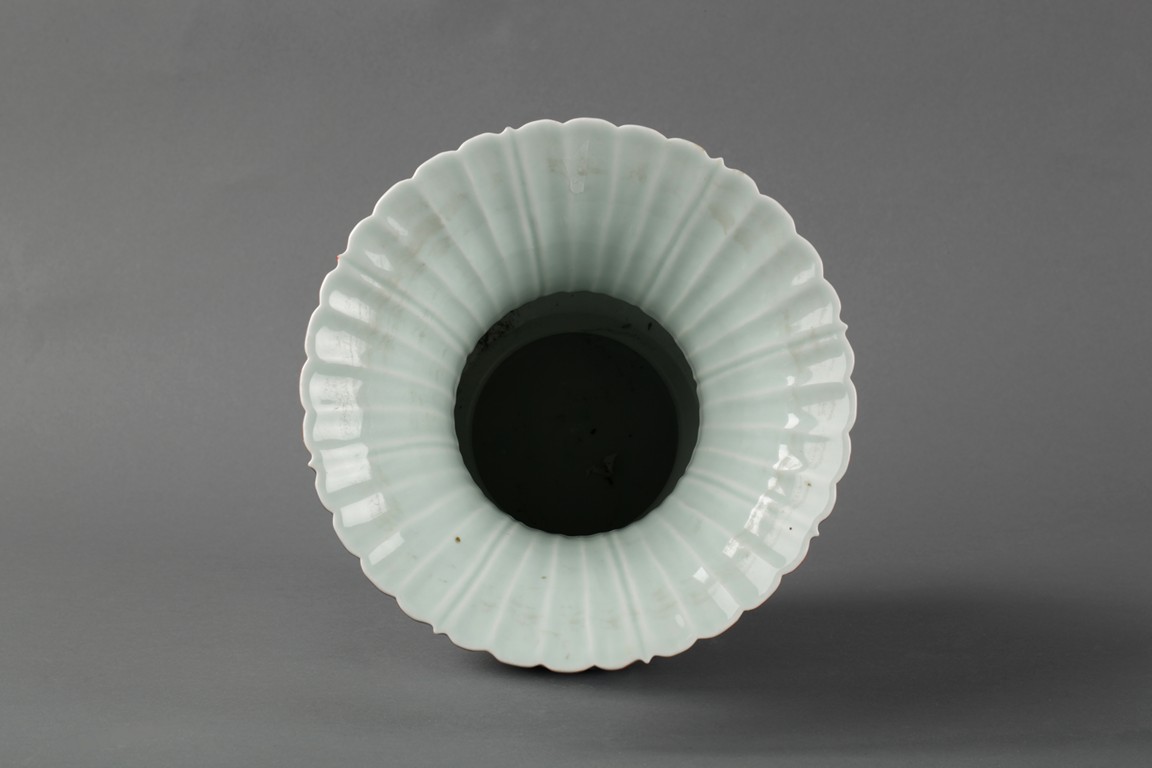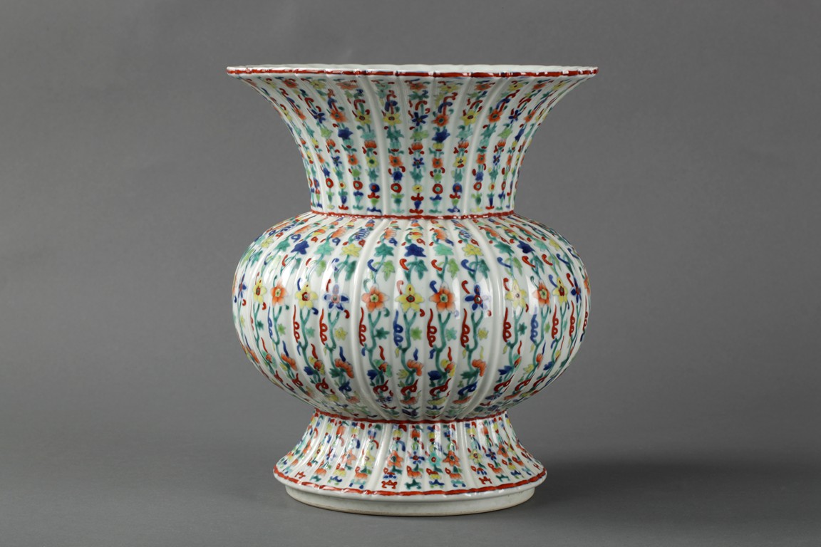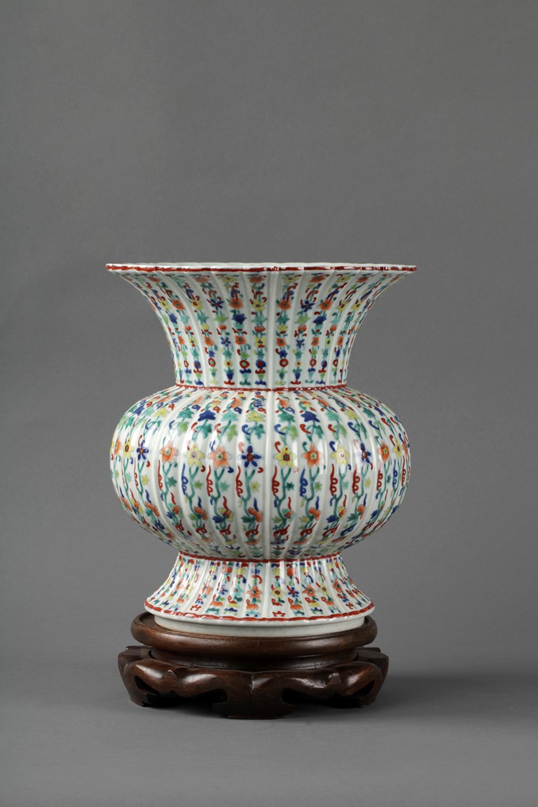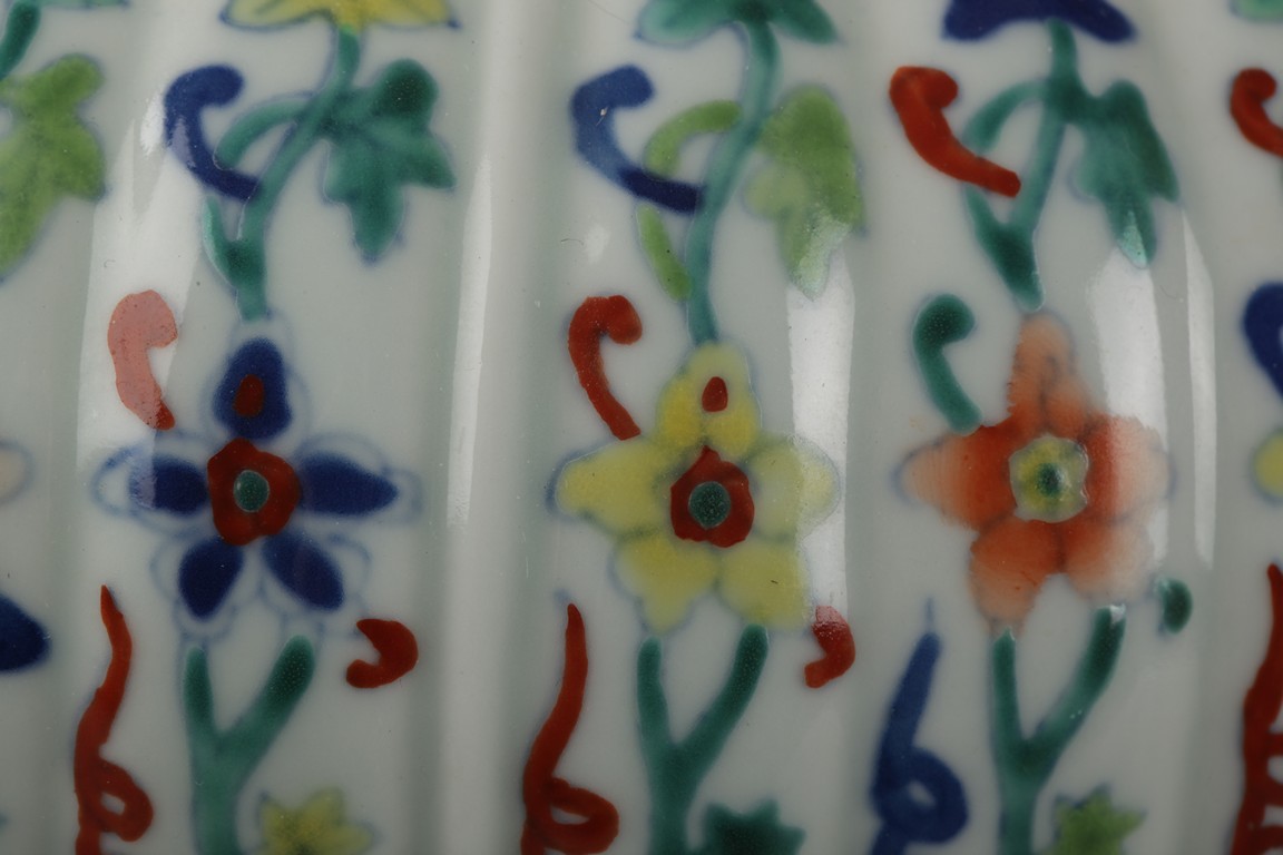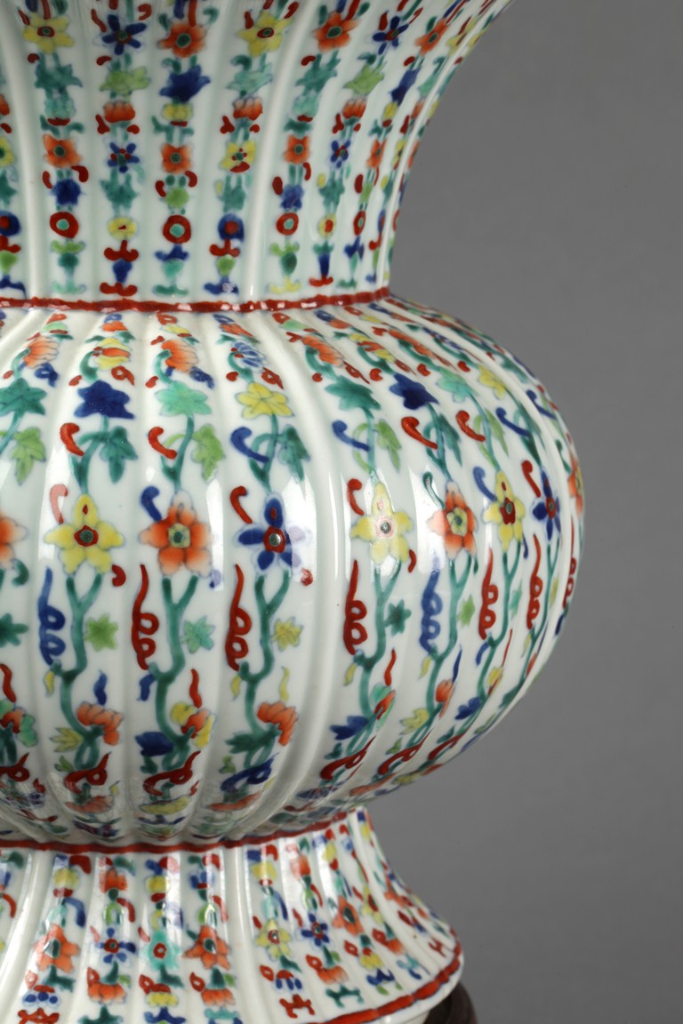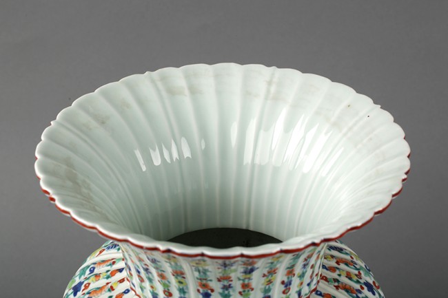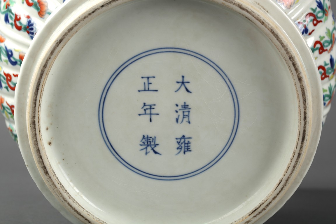 The vase has a splayed ring foot, bulbous body, waisted neck, and everted rim, similar to flower petal shape. The vase is covered with flowers and vine patterns. Bottom bears six character'DAQING YONGZHENG' mark.