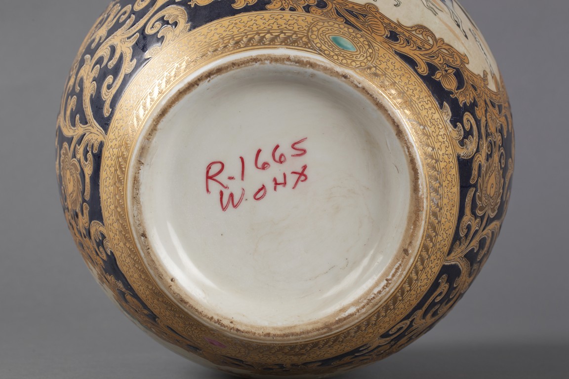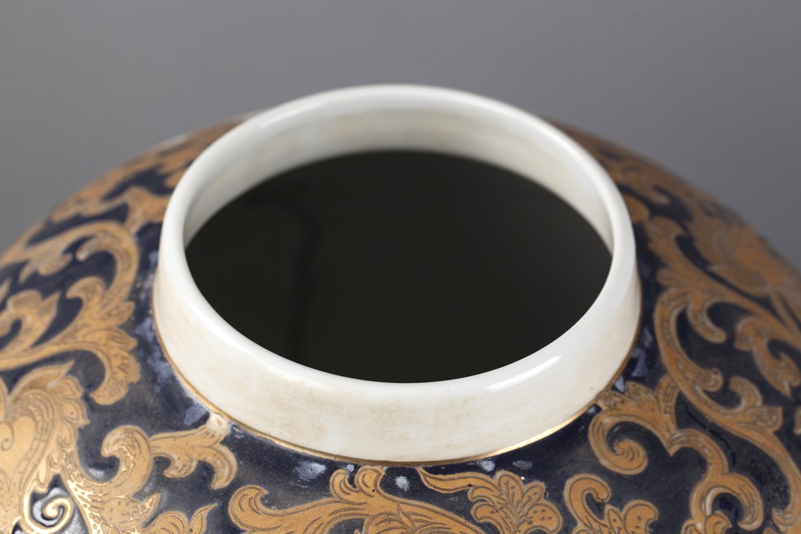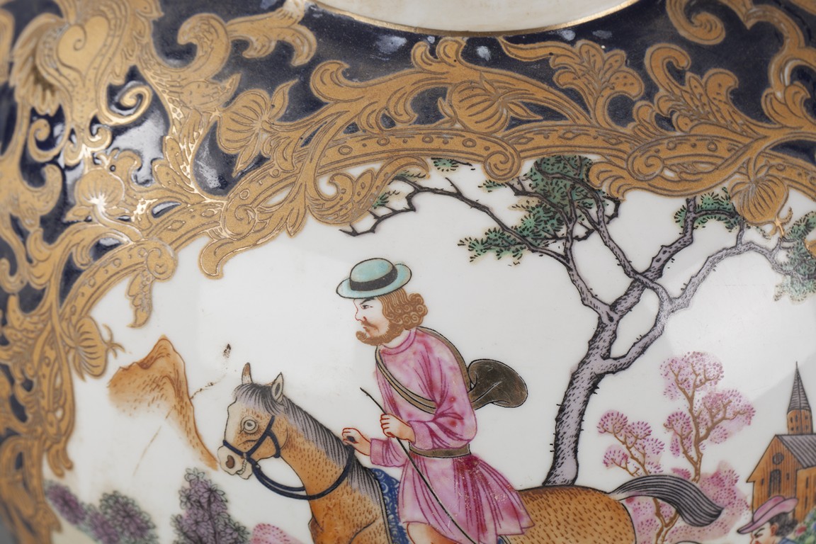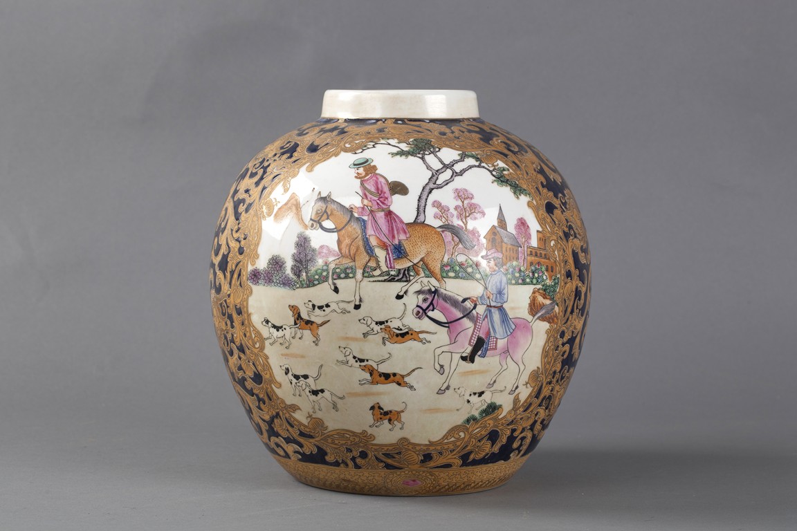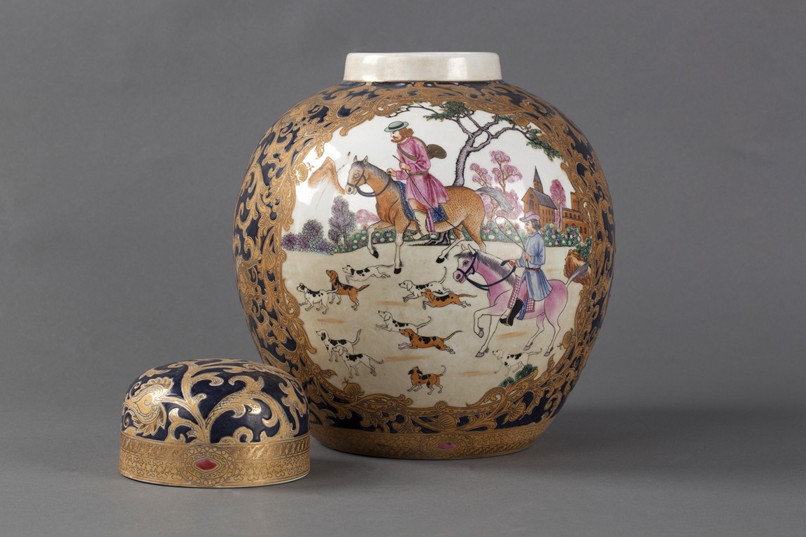 The famille rose jar with cover has a Western theme, including riders on horseback, hunting dogs, and mansions, with flowers and vines patterns.