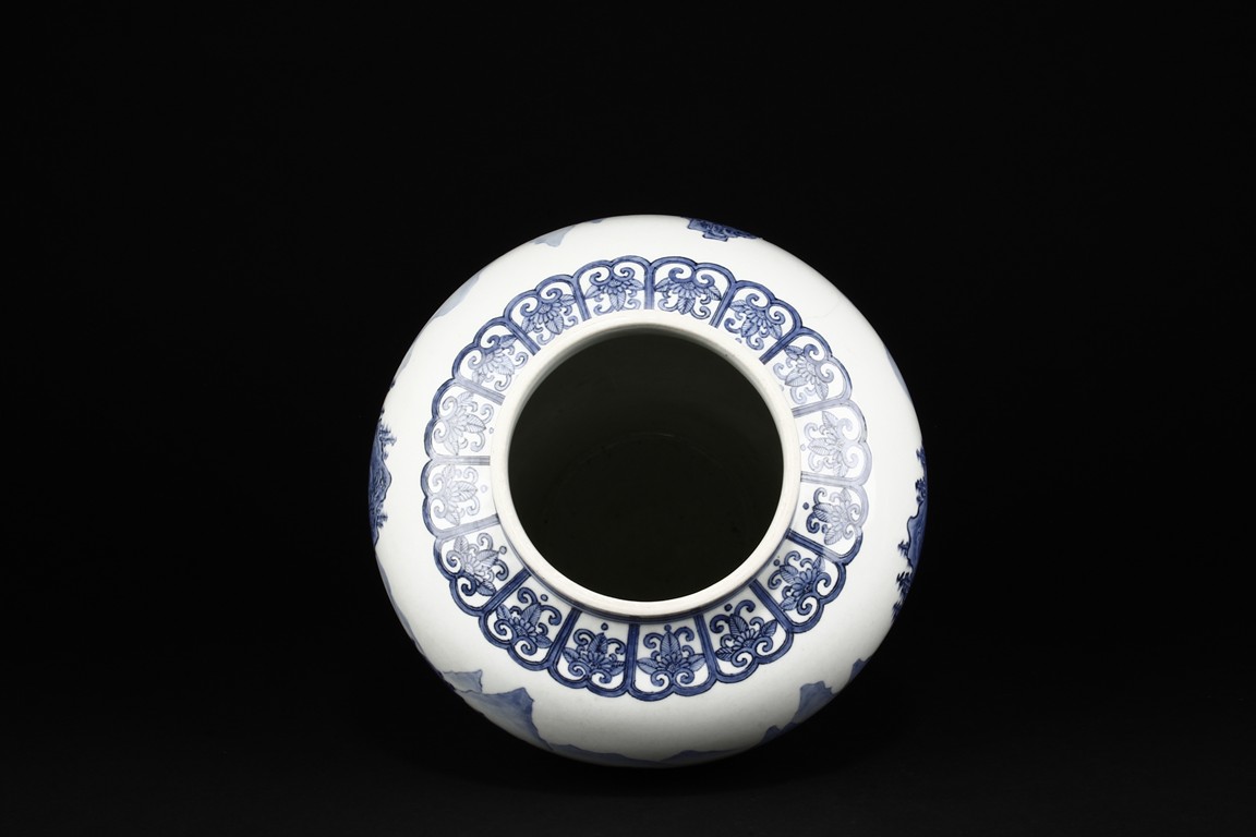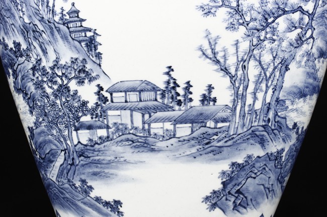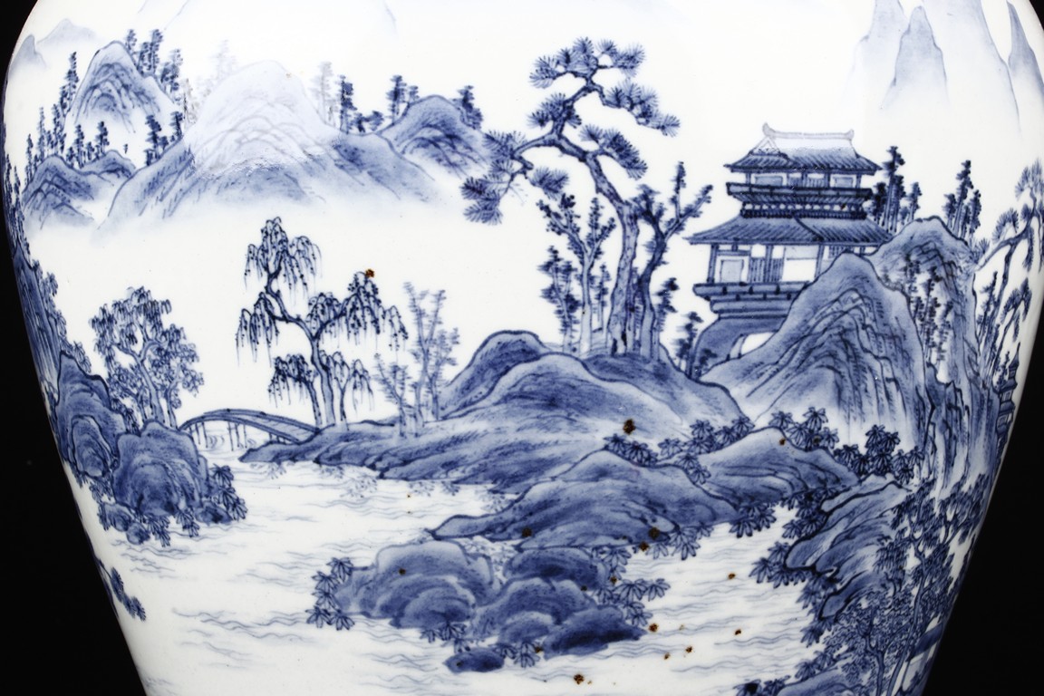 Tapering from the gently curved shoulders, the jar's body depicts a mountain, river, and village landscape scene, between band of lotus petal patterns and band of sectioned flower patterns, and the neck with key-fret patterns. Qing Dynasty Period.